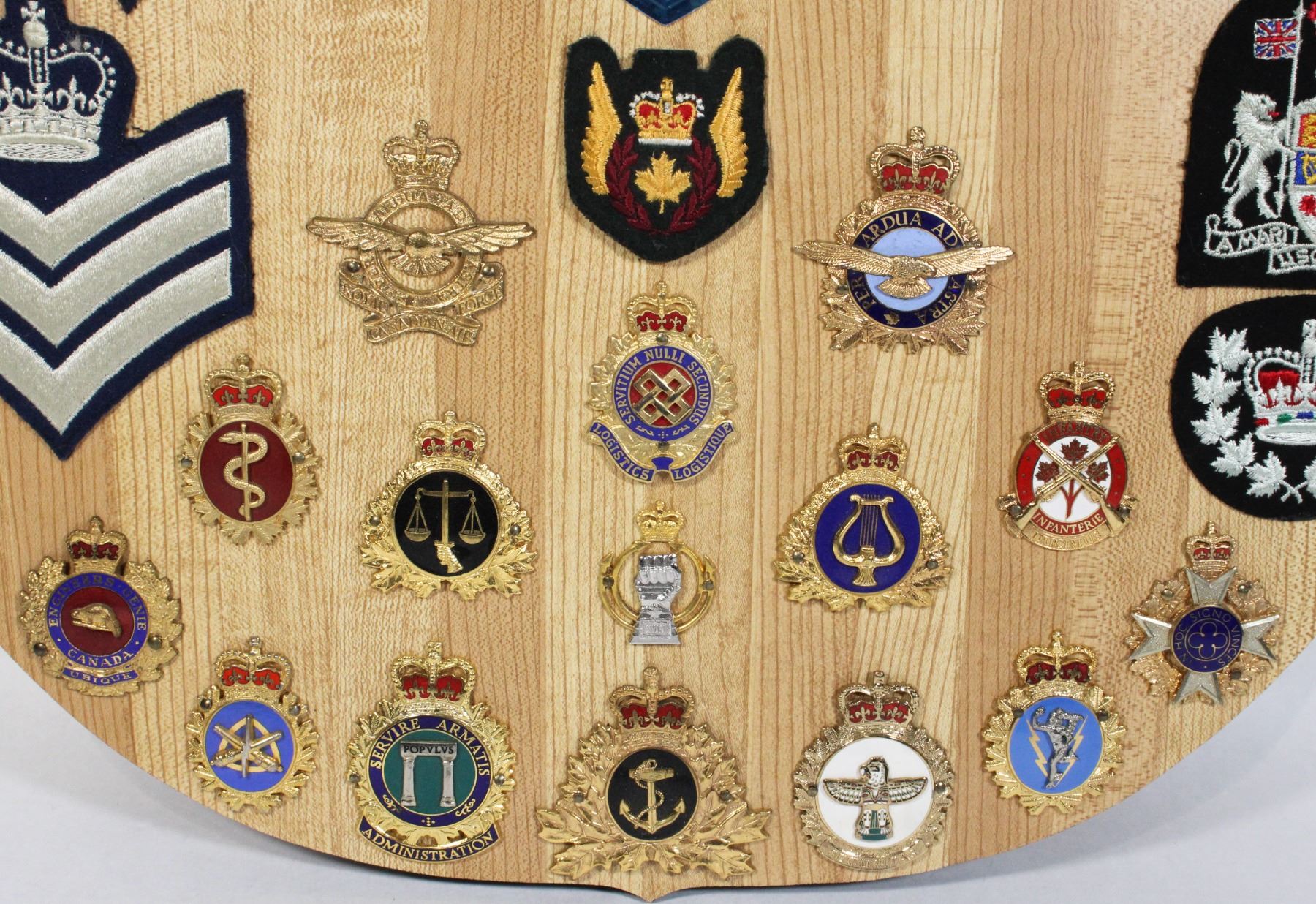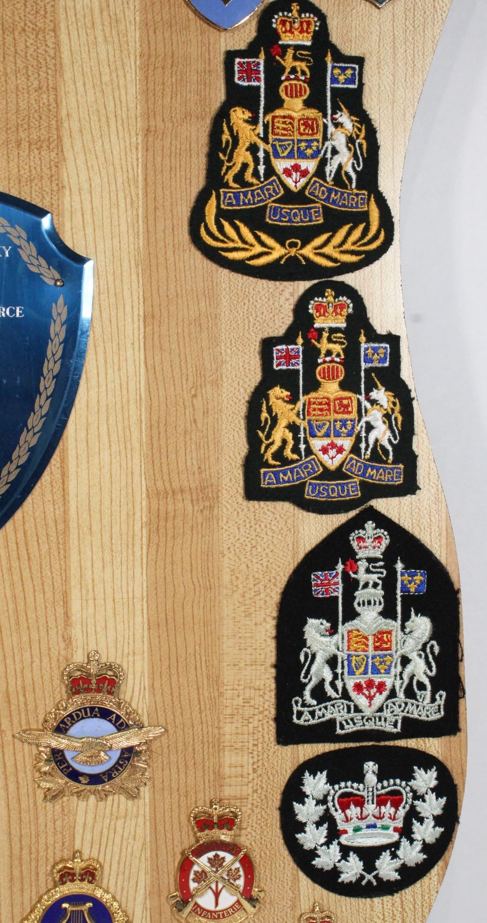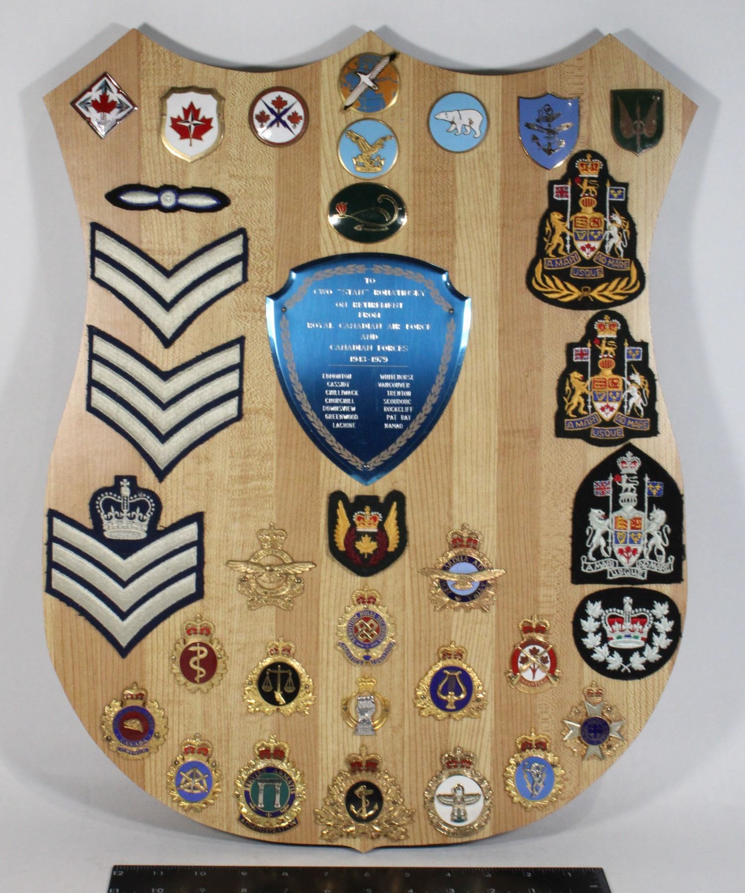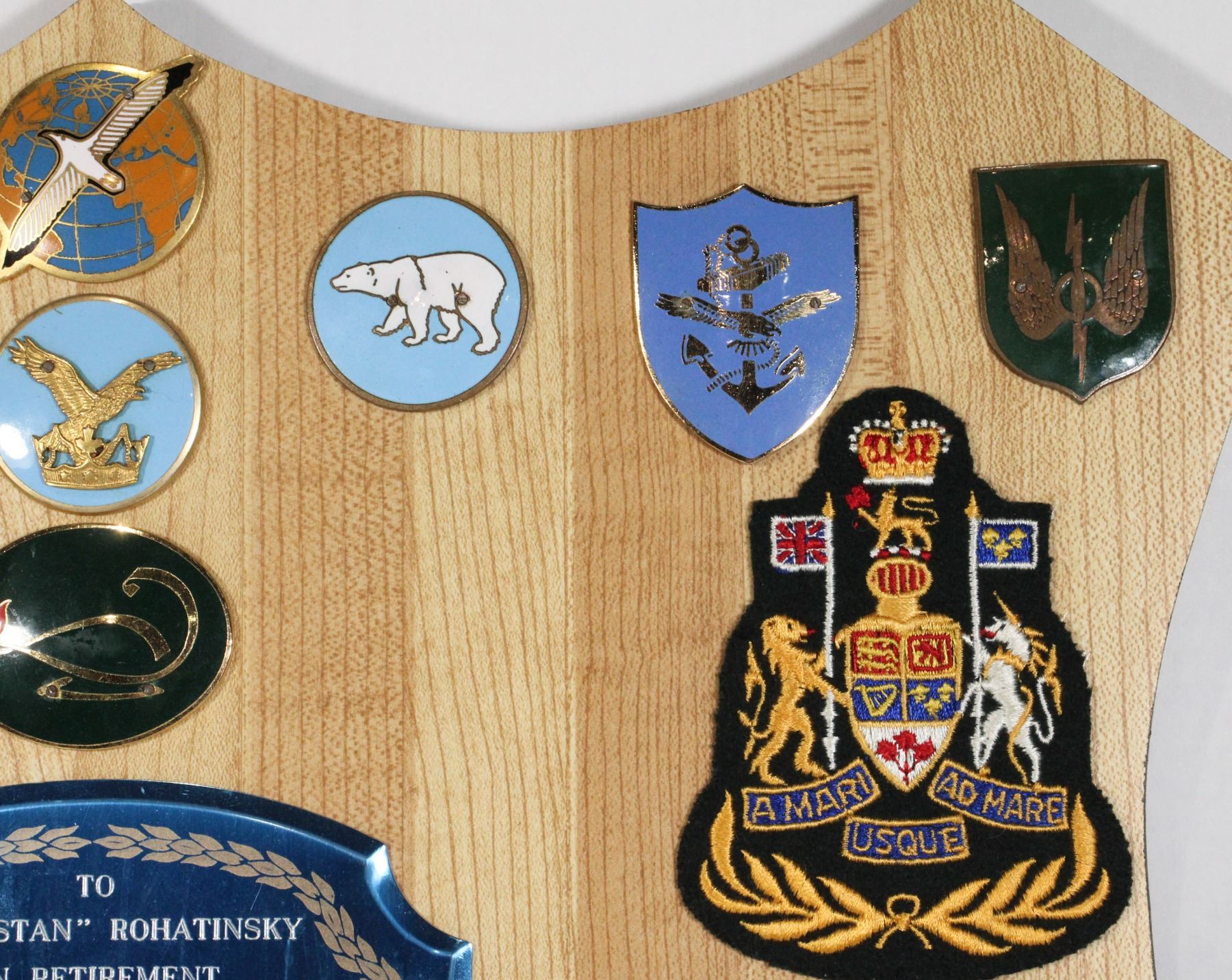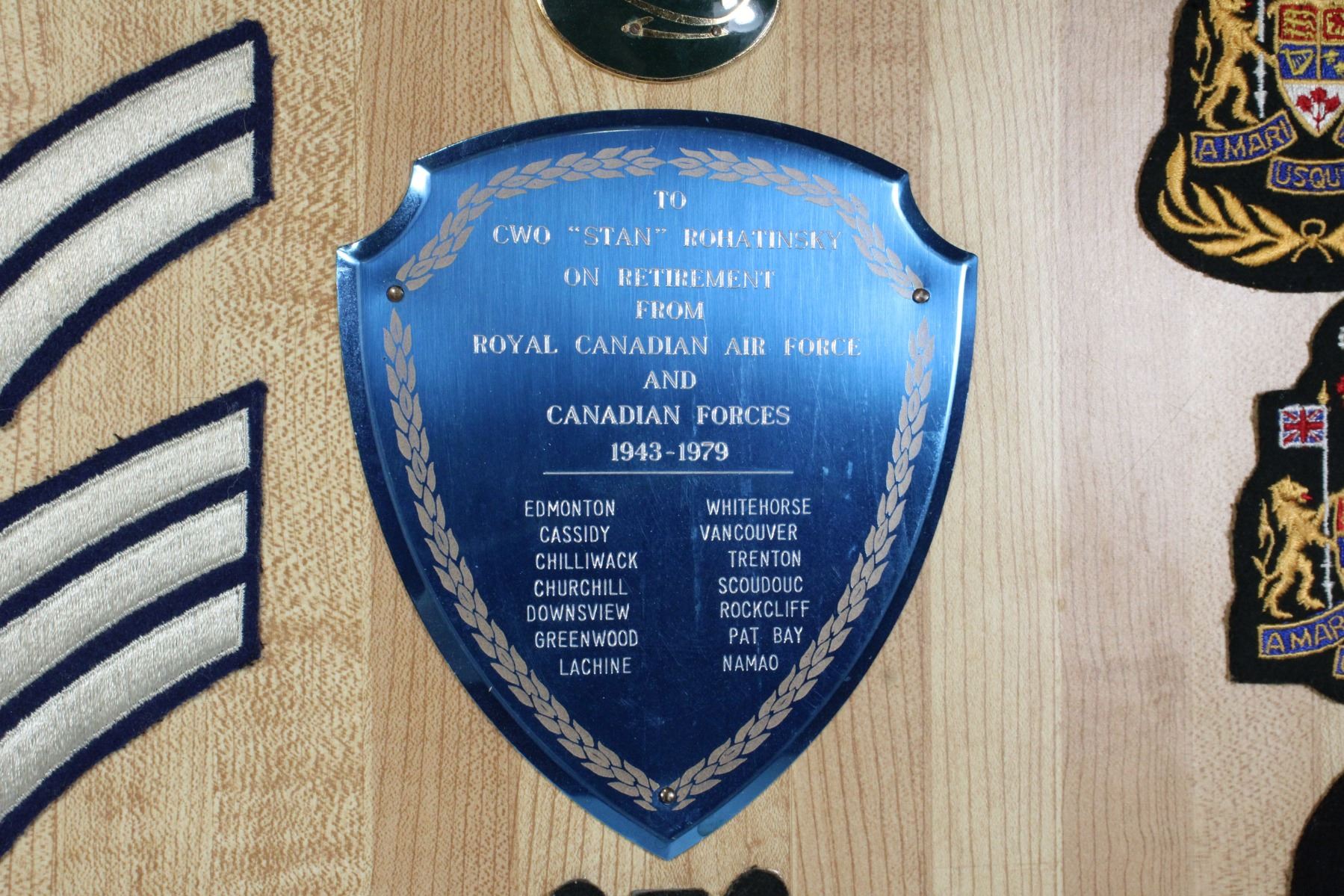 Named tp CWO Stan Rohatinsky of the Royal Canadian Air Force and Canadian Forces, includes 15 cap badges, 9 Pocket/Command Badges, and 9 cloth insignia . Wood Plaque Measures 20.5 x 16 inches in size. Canadian Military Allied Forces Presentation Plaque