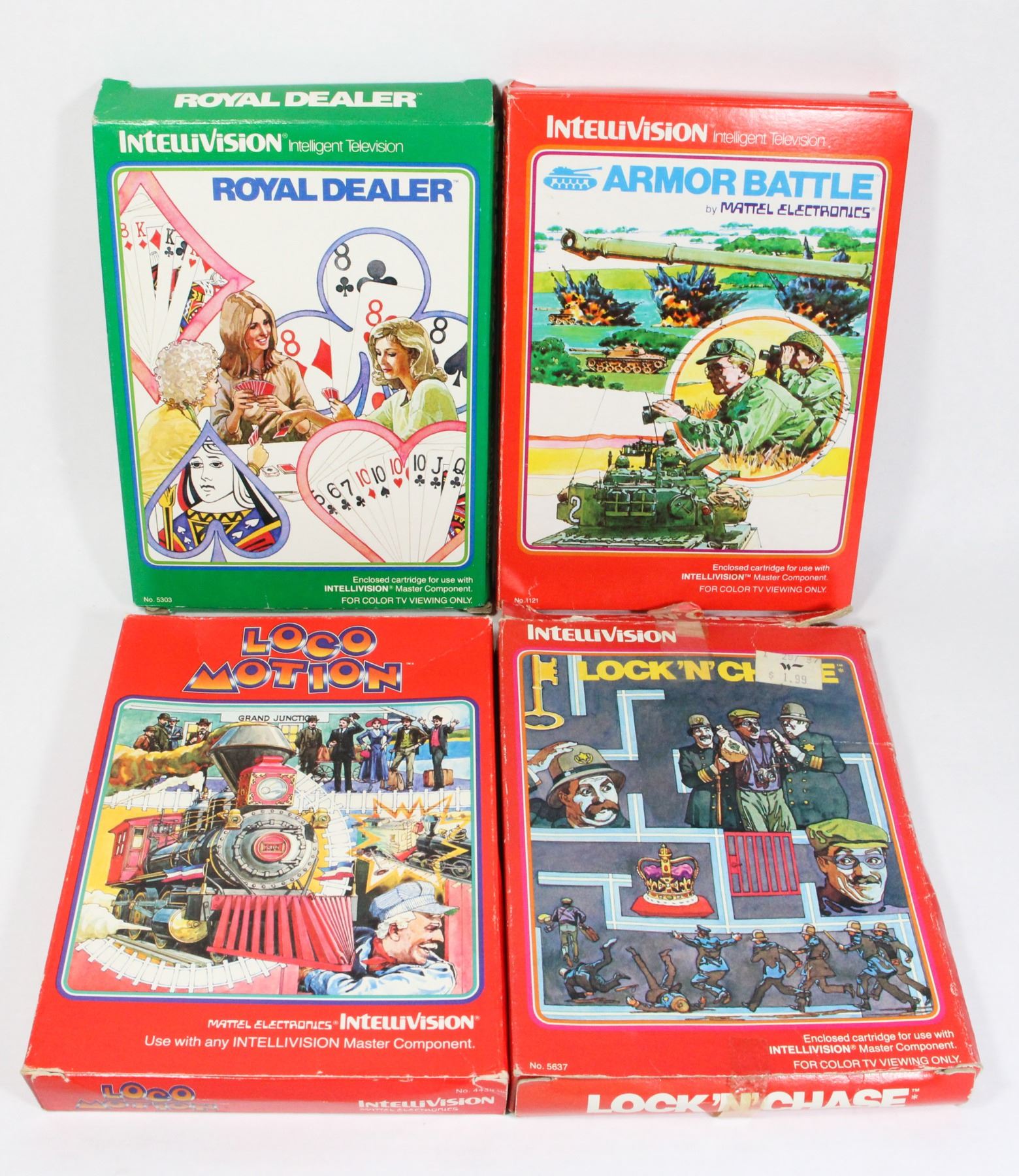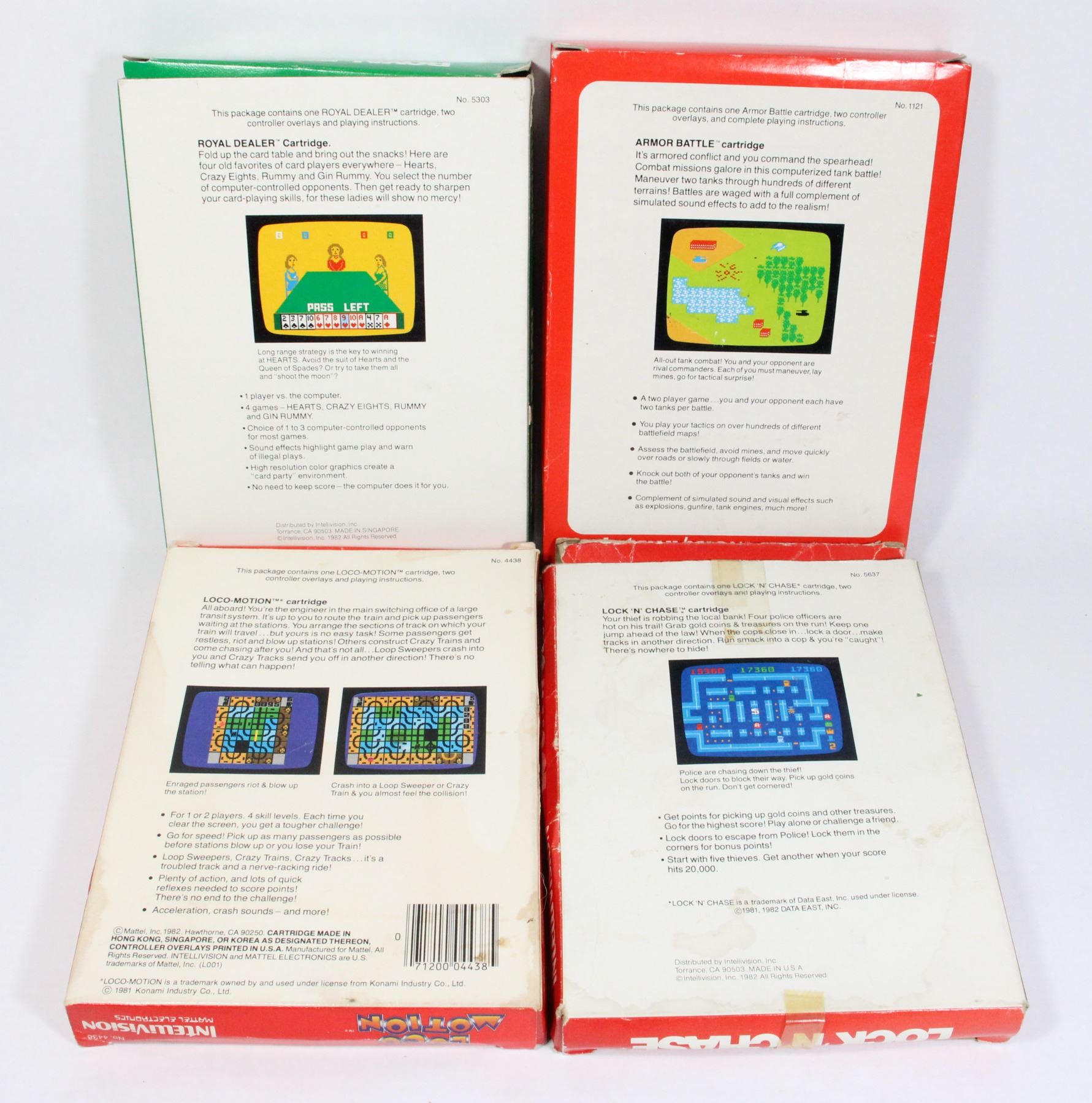 Lot of 4 CIB Games includes Lock 'n' Chase, Loco Motion, Royal Dealer and Armor Battle. Intellivision Game CIB Complete in Box with game, manual and 2 controller overlays. Intellivision Mattel Electronics 1980's Video Game