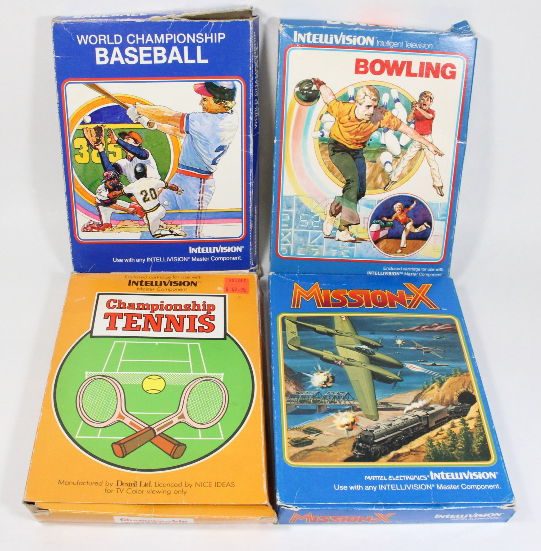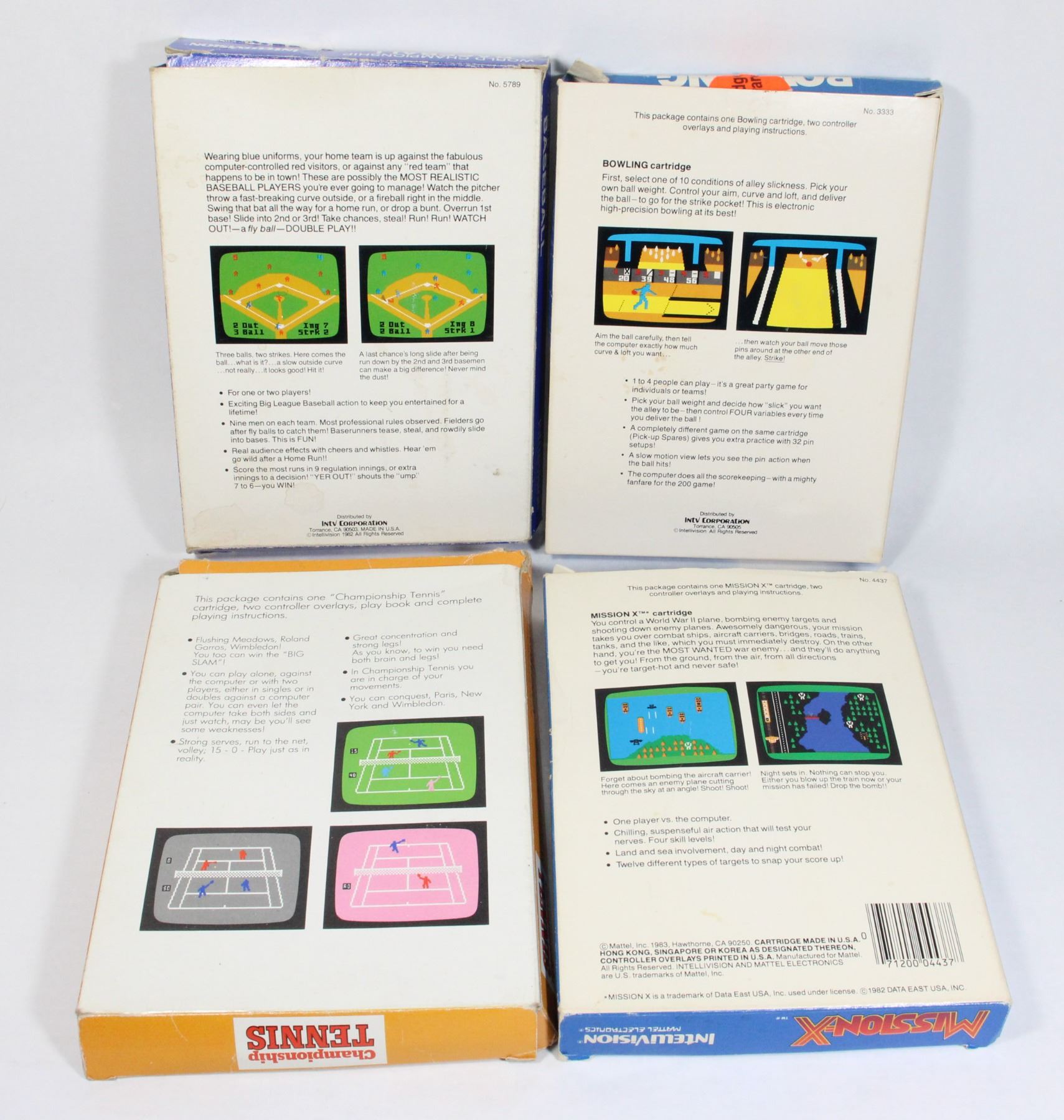 Lot of 4 CIB Games includes Mission-X Championship Tennis Bowling Baseball Intellivision Game CIB Complete in Box with game, manual and 2 controller overlays. Intellivision Mattel Electronics 1980's Video Game