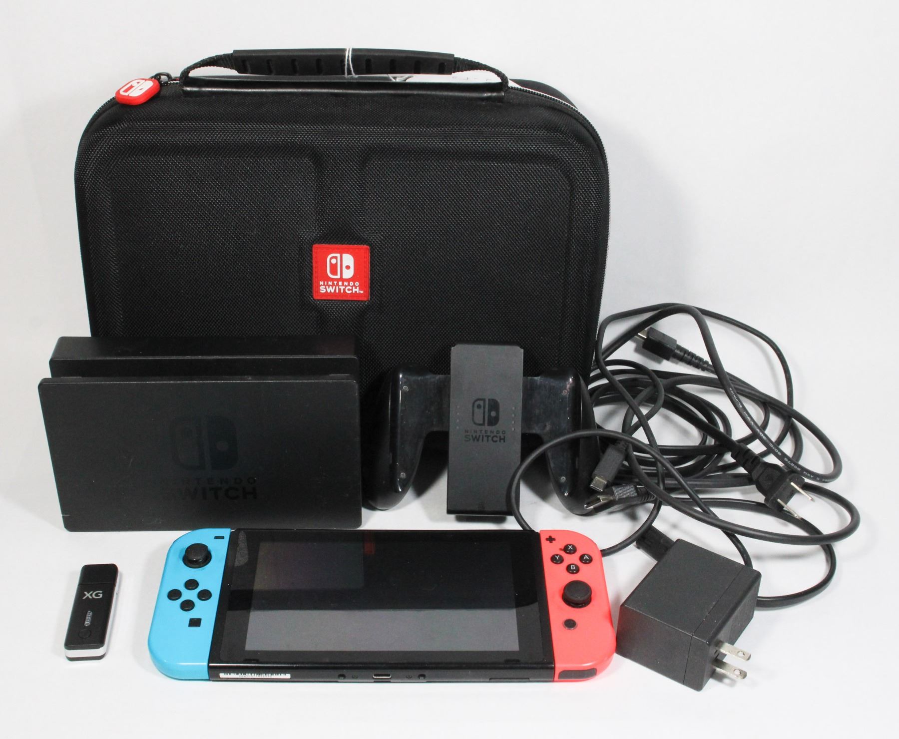 In working condition, includes downloaded games on console, controllers and charging doc with portable Official Nintendo Switch case- Nintendo Switch