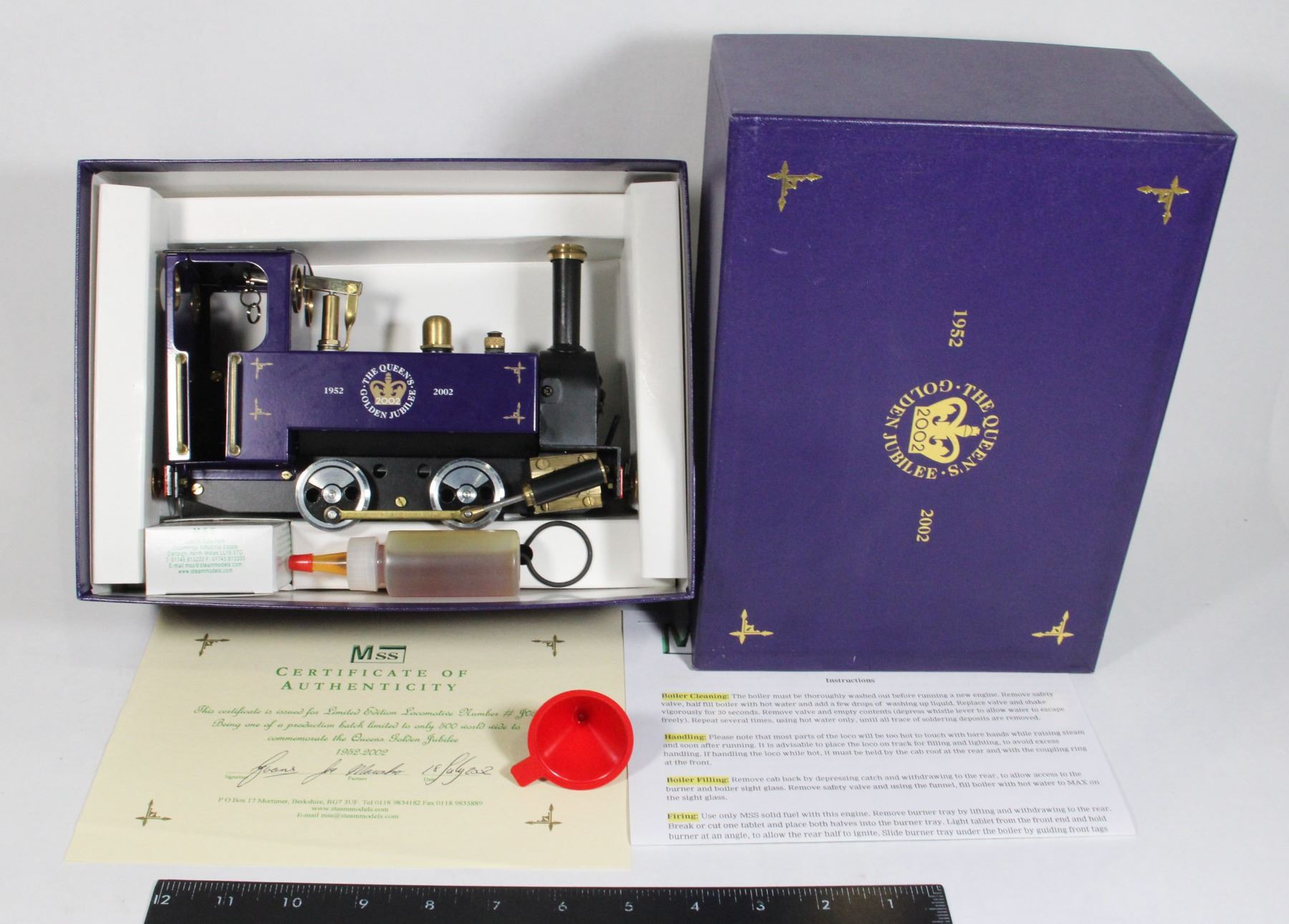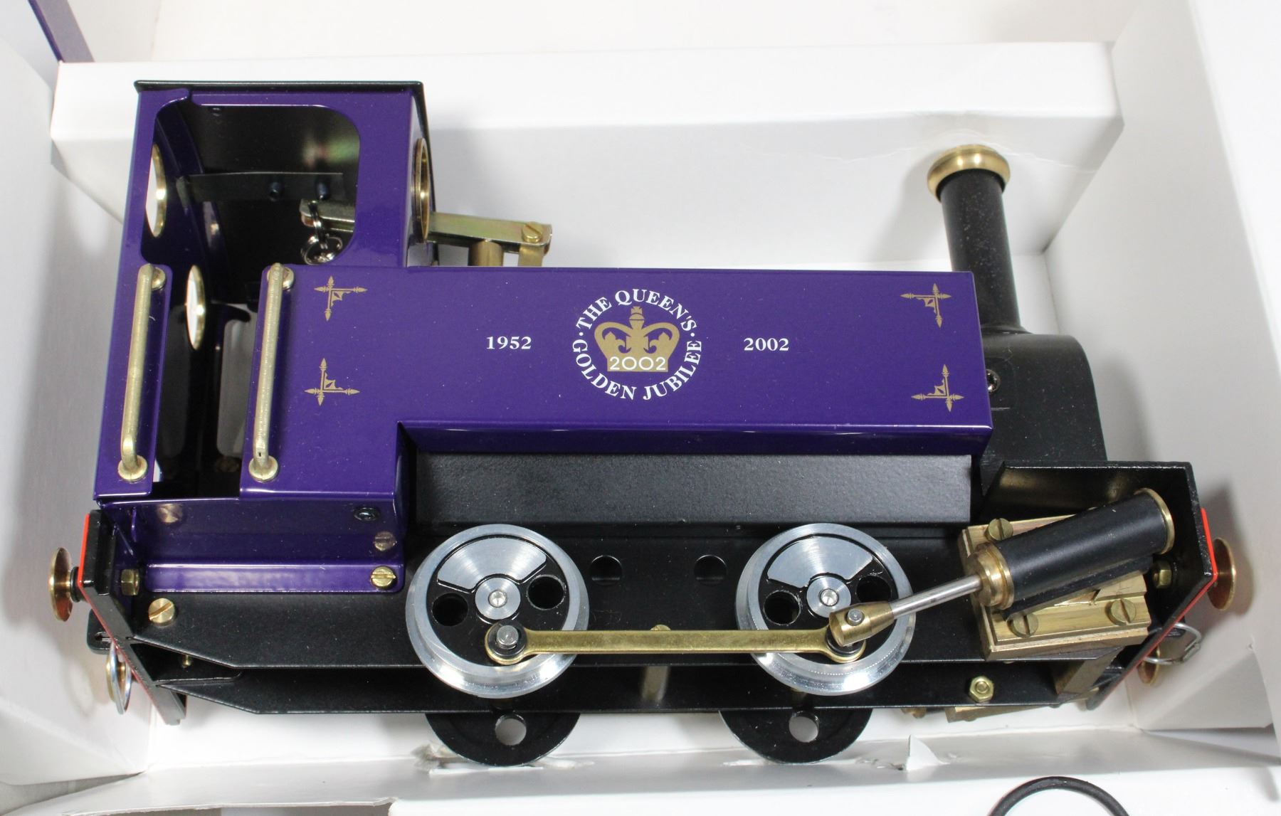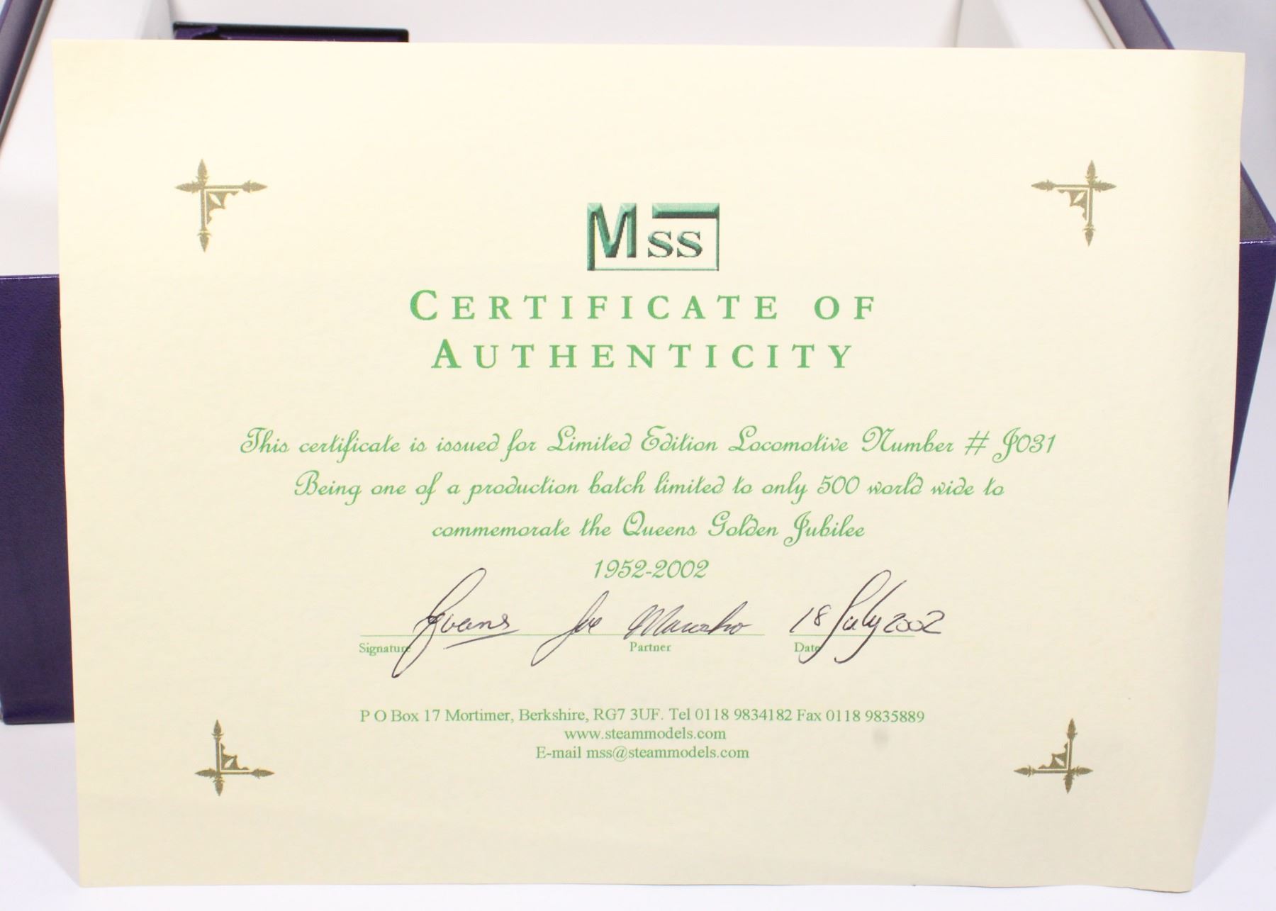 Unused in Original Box NOS New Old Stock, includes Certificate of Authenticity- Numbered #31 of #500. 1952 2002 Queen Elizabeth II Golden Jubilee. box has corner dent with some inner writing. Made in England by MSS Steam Models. From Large Collection of Model Railroading Train Locomotive Collection, including NOS New Old Stock unused items in assorted Scales, and More.