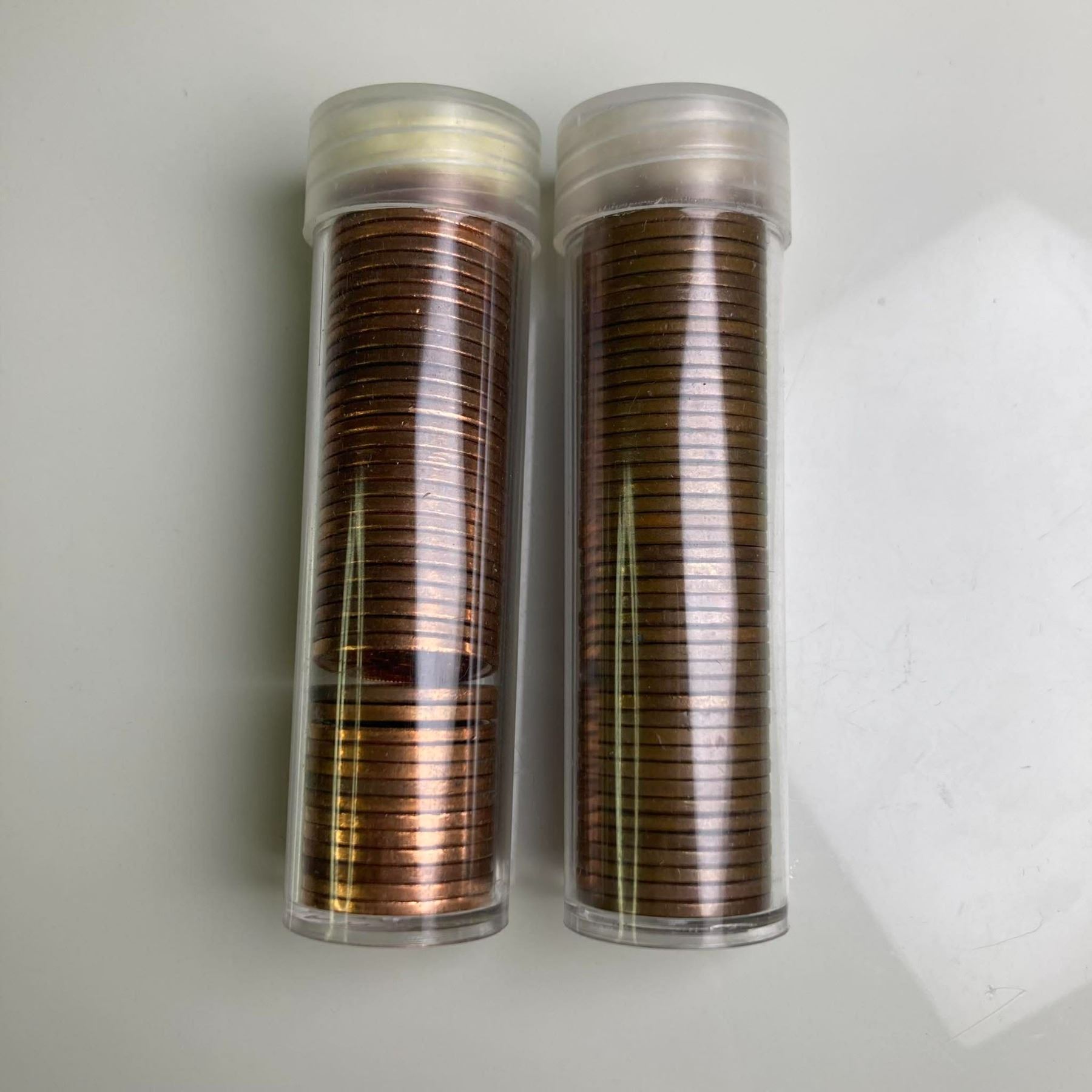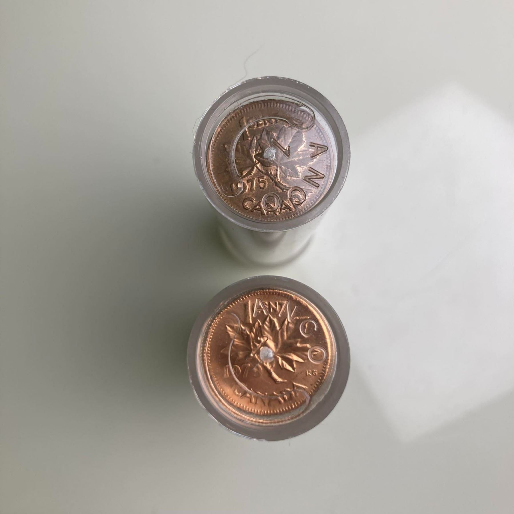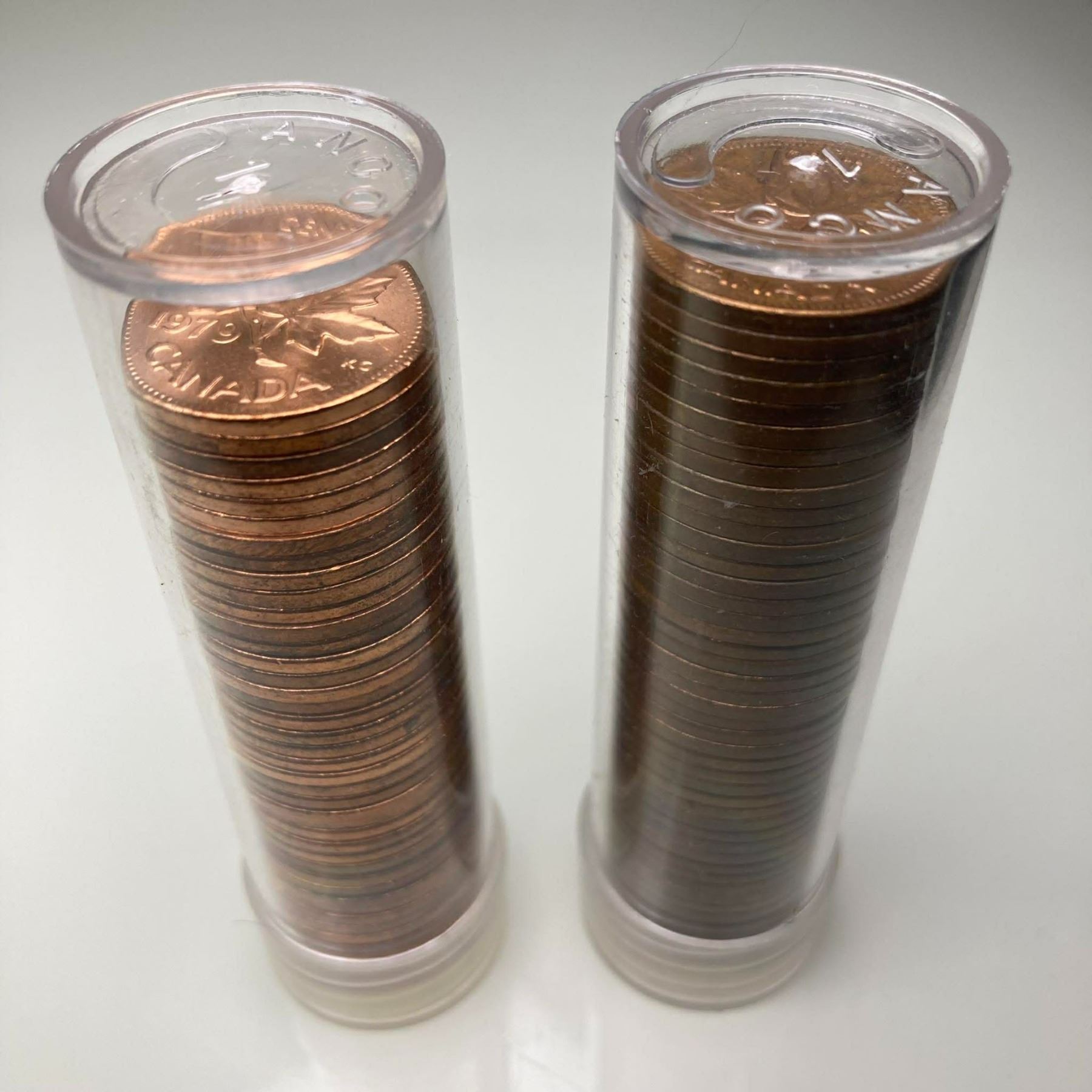 Canadian pennies. One roll appears to be mixed, one 1979 uncirculated coins. Both not quite full and not examined closely by us.
