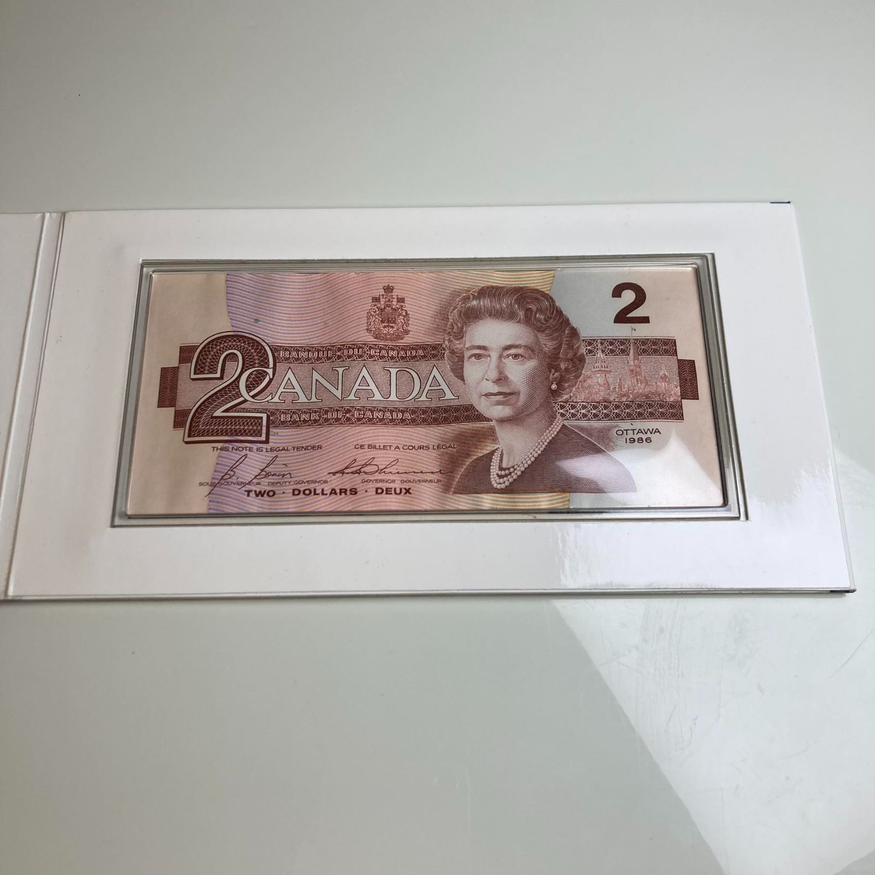 Uncirculated examples of the new toonie and a 1986 Bank of Canada $2 bank note. Light wear to packaging.