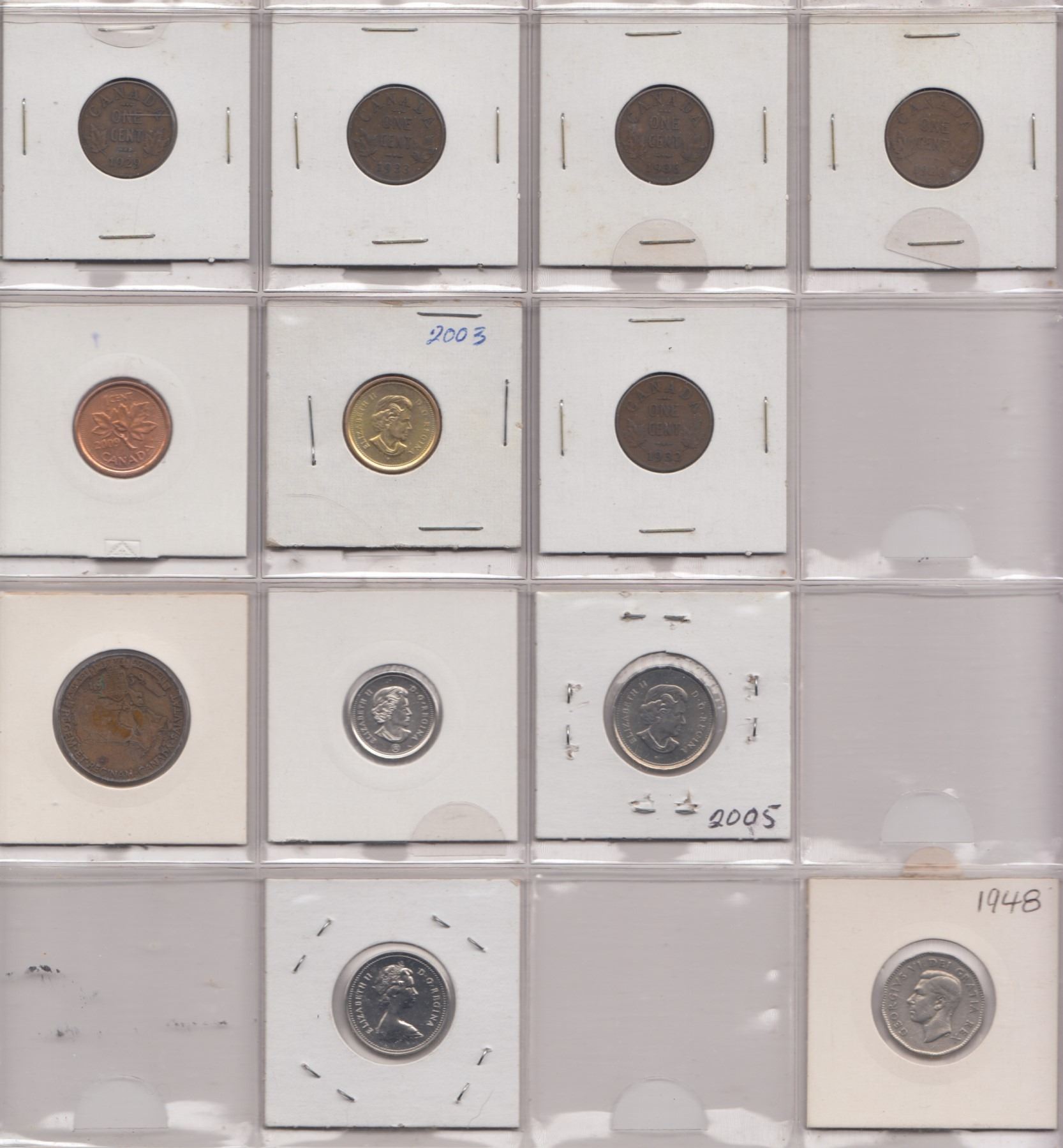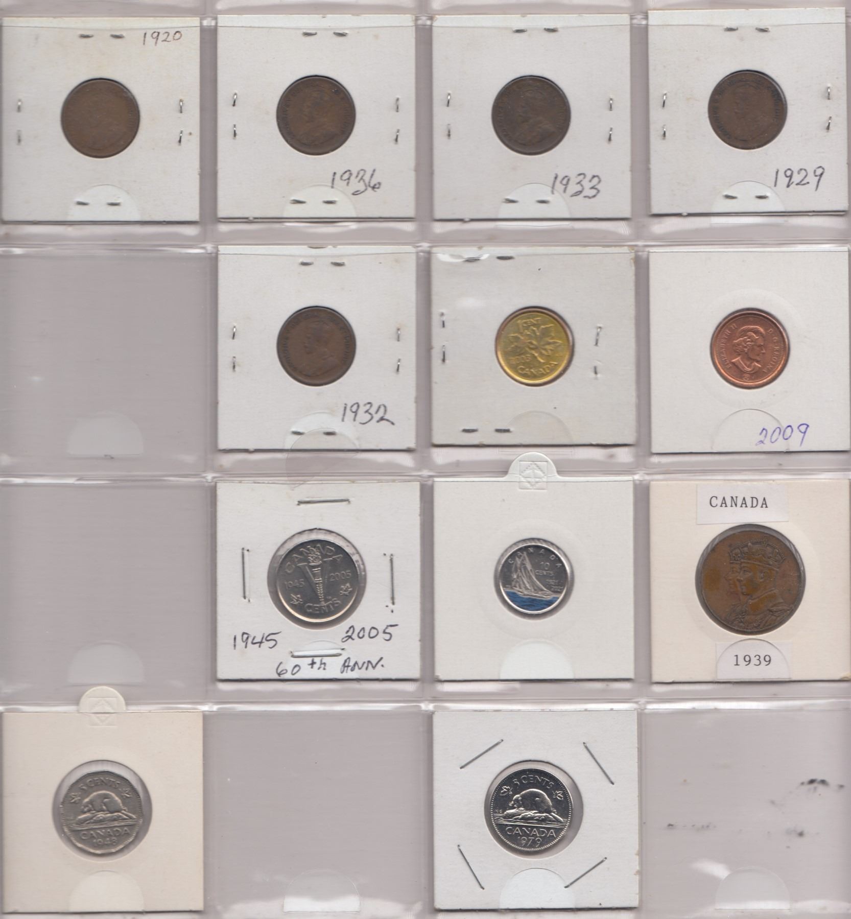 Includes 1920, 1929, 1932, 1933, 1936 pennies, an odd gold-toned 2003 cent and 1939 Canada Royal Visit bronze medal.
