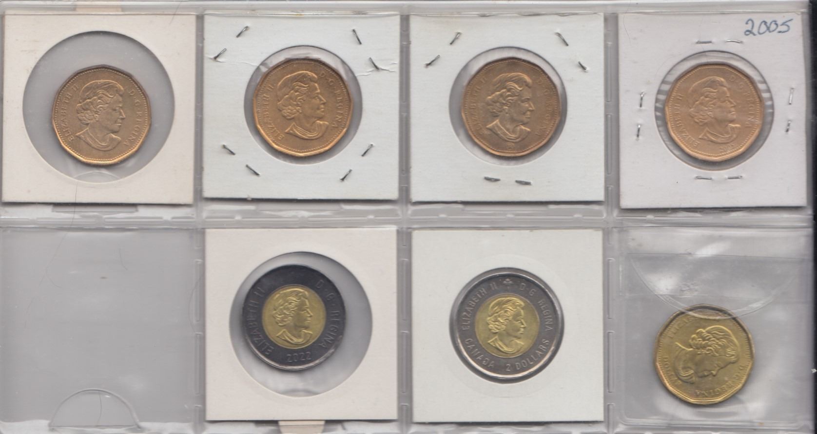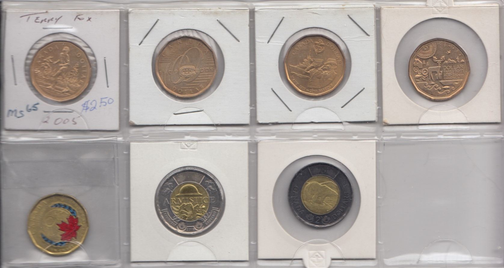 2005 Terry Fox, 2009 Canadiens, 2010 Navy, 2011 Parks Canada, 2020 Colour, 2018 Armistice, 2022 Black memorial toonie. 7 coins.