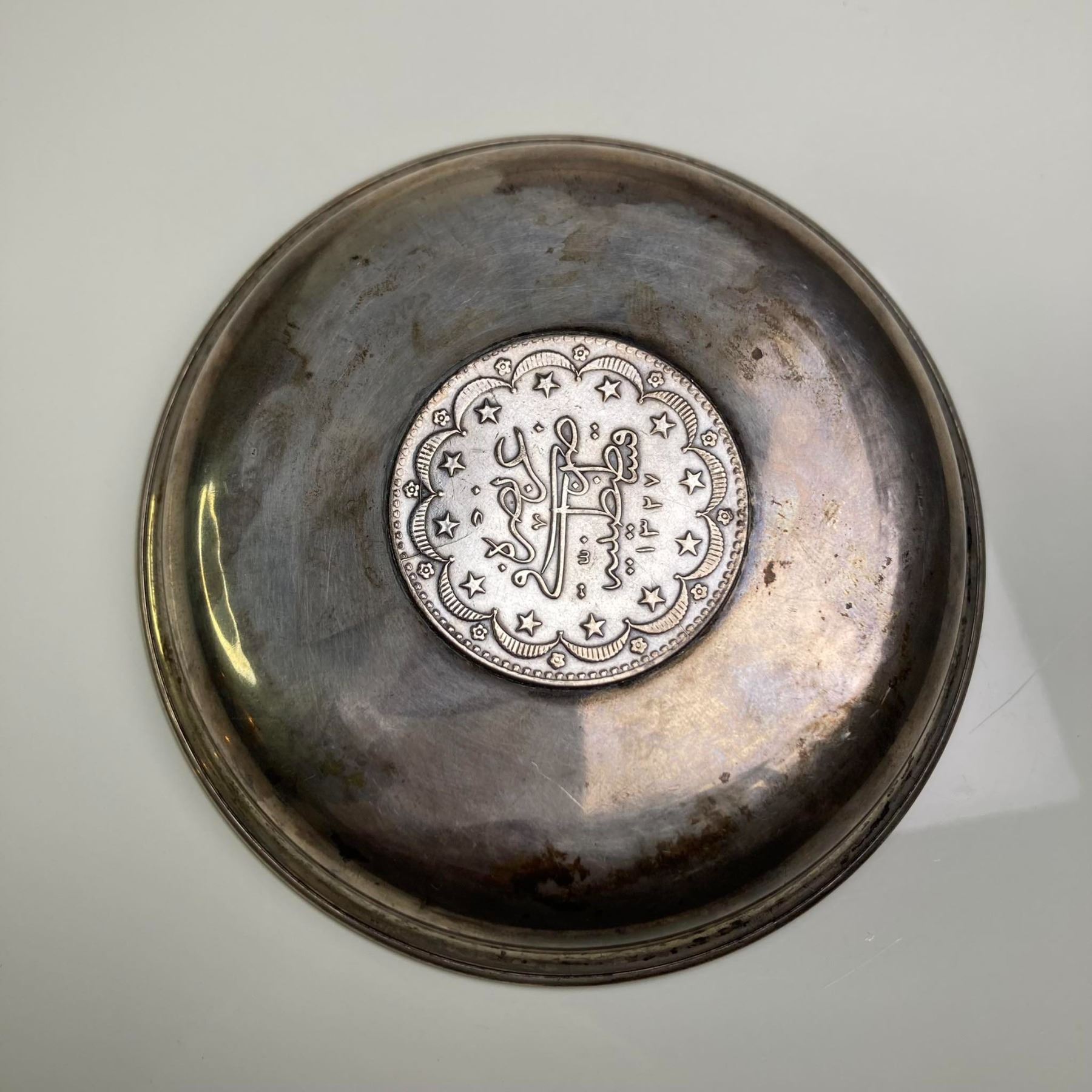 Large 20 Kurus silver (.830 silver) coin imbedded into silver dish approx. 4 inches wide. Dish tests as approx. 80% silver. Approx. 53g.