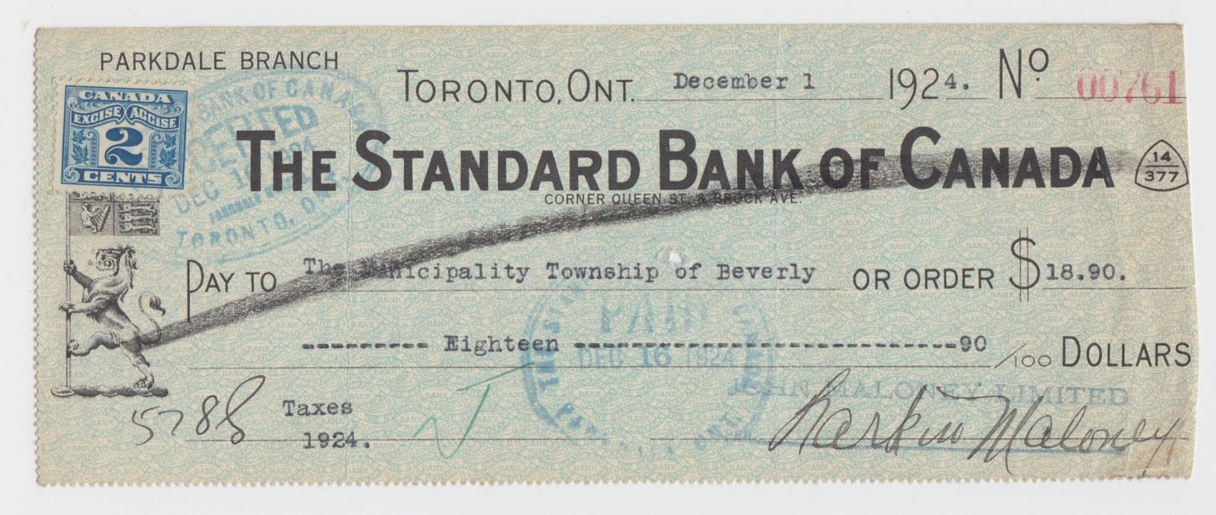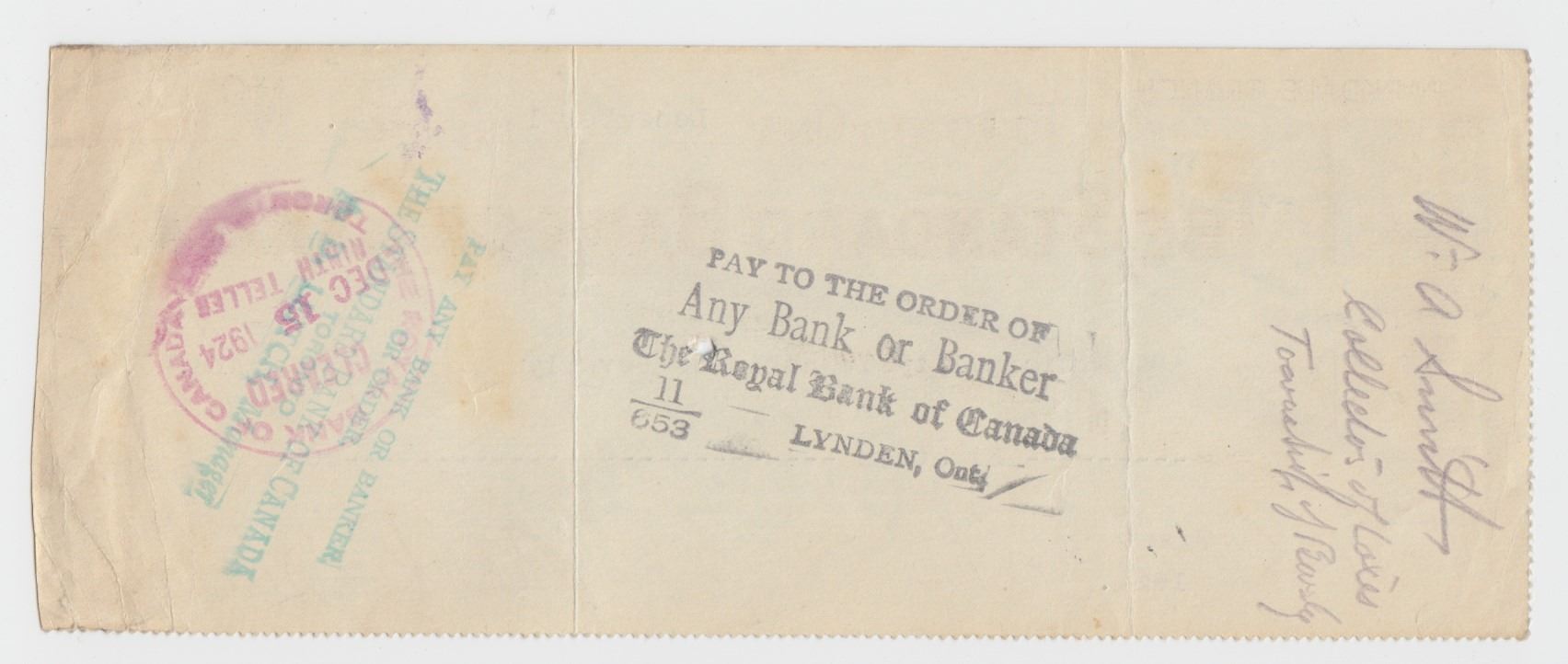 Toronto, ON. December 1, 1924 with 2 cents excise stamp affixed.