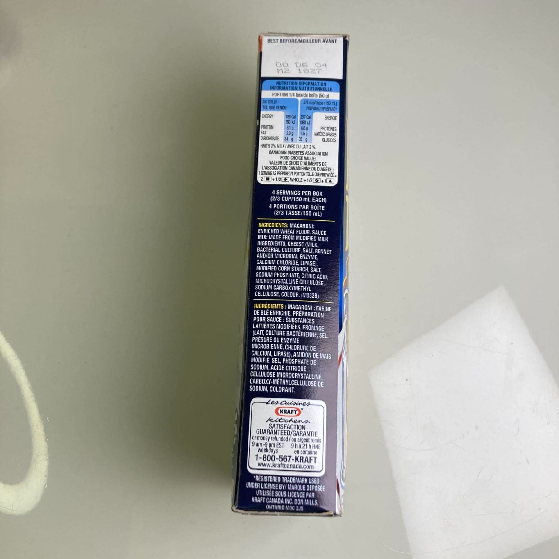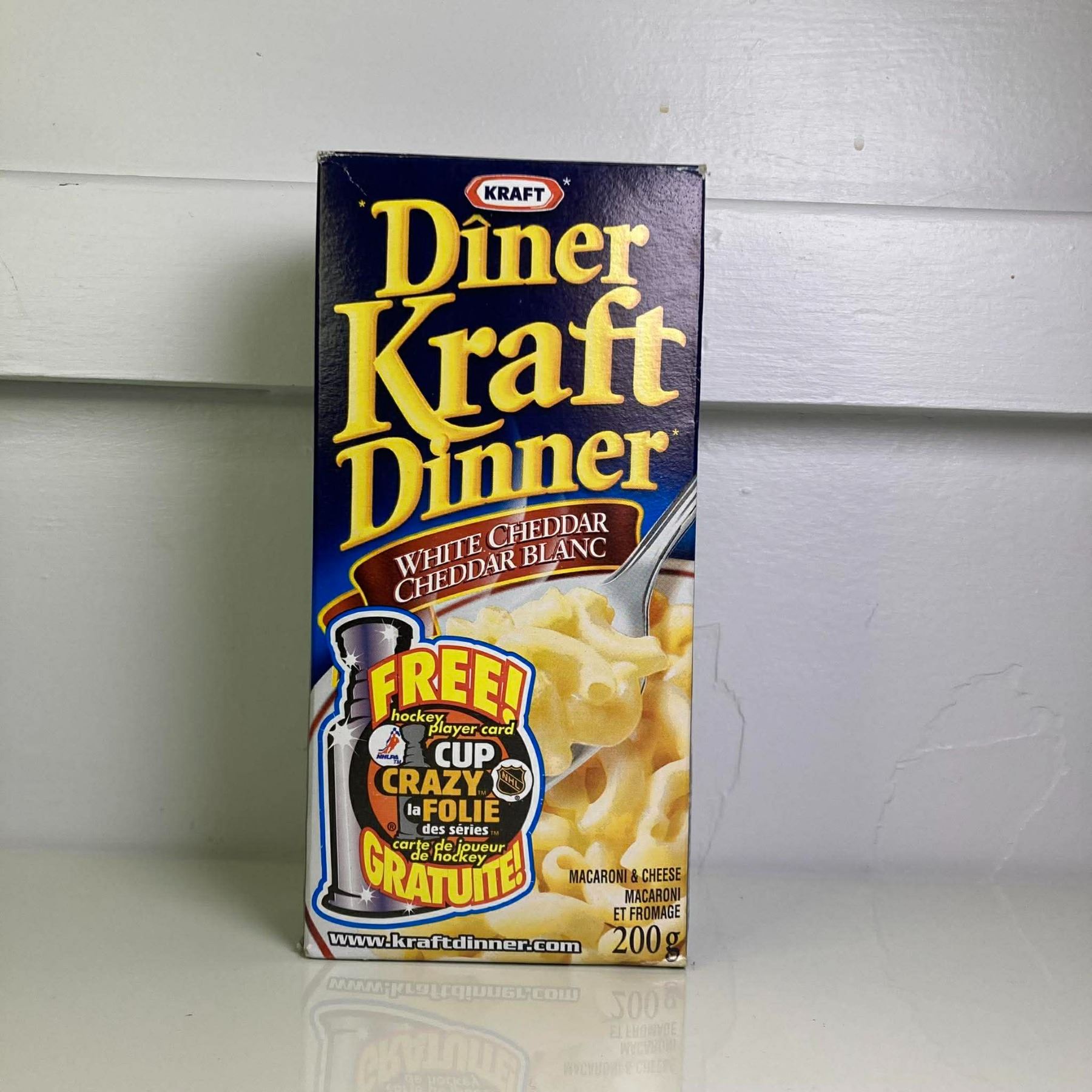 Box of White Cheddar Kraft Dinner with card #1/15 on the back. Full box, best before 00Dec04.