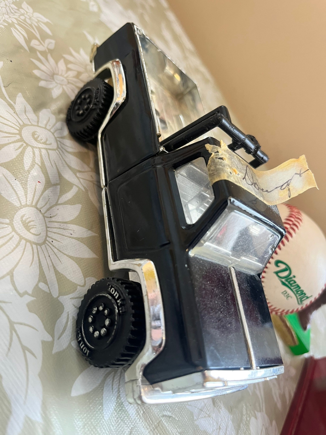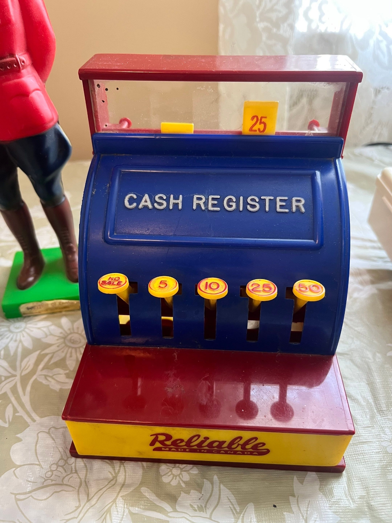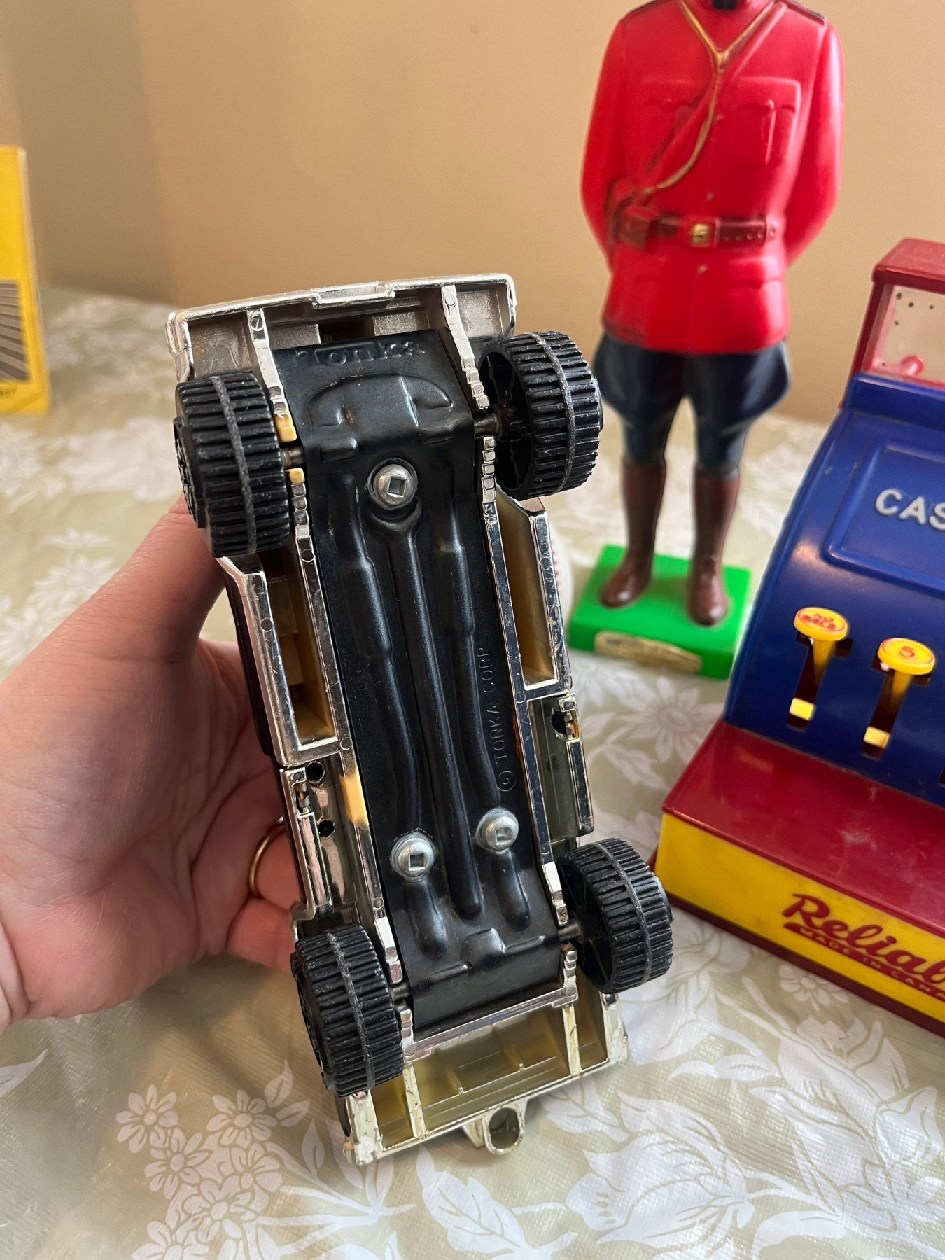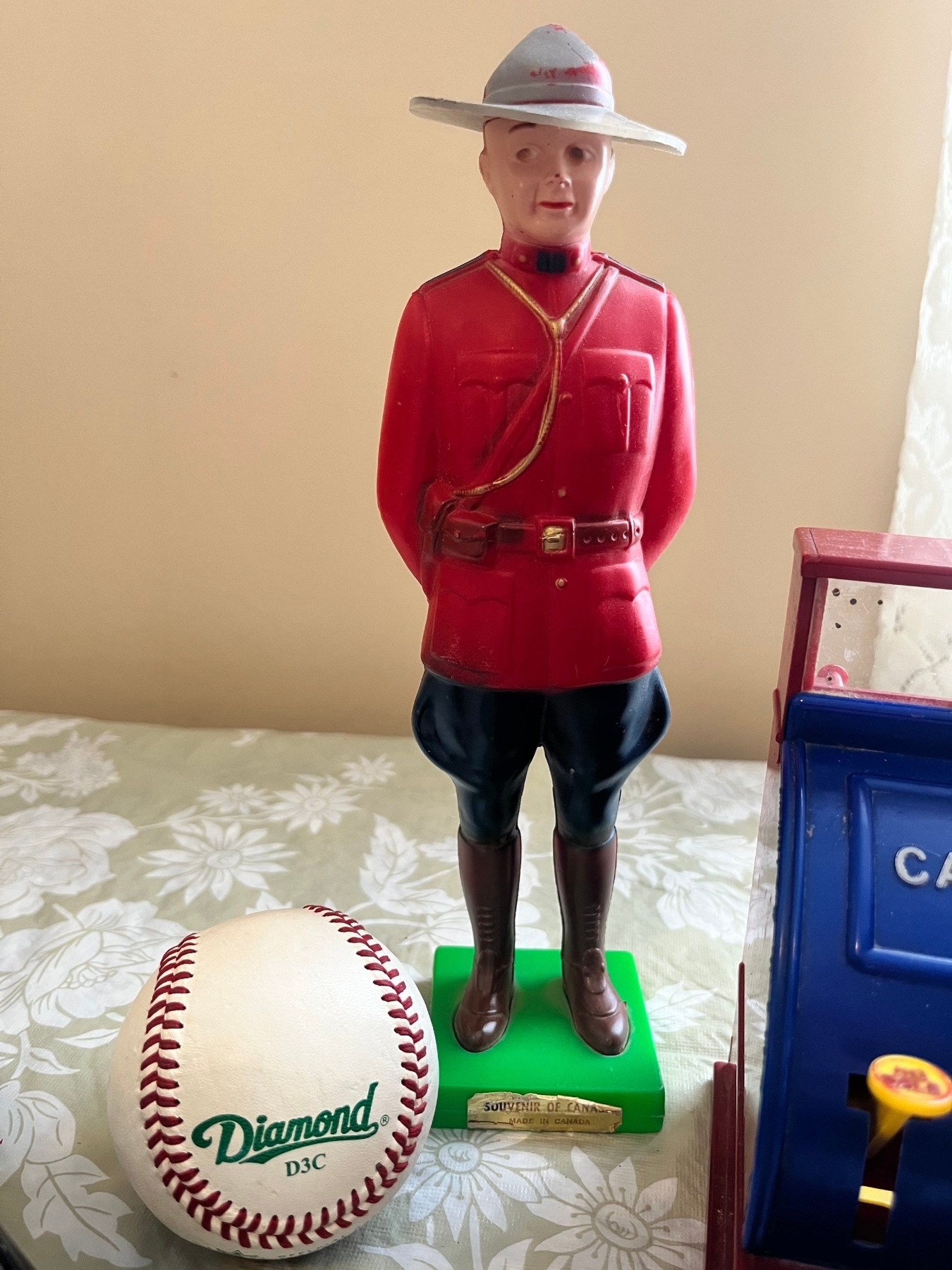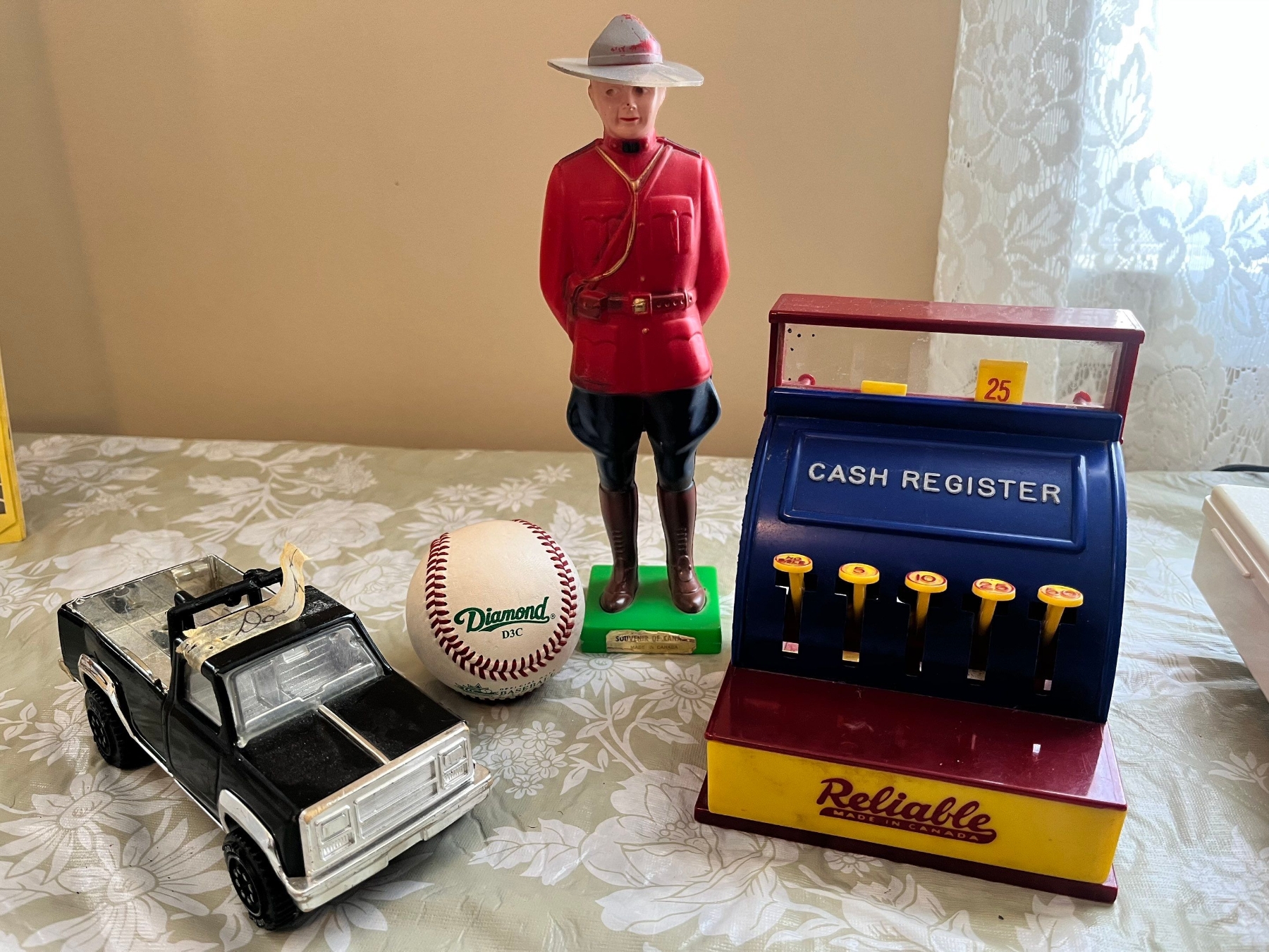 a vintage Tonka pressed steel toy truck, vintage plastic figurine of a Royal Canadian Mounted Police officer, vintage plastic toy cash register manufactured by Reliable in Canada, with a Diamond D3C cork & Rubber pill wool wound premium leather baseball