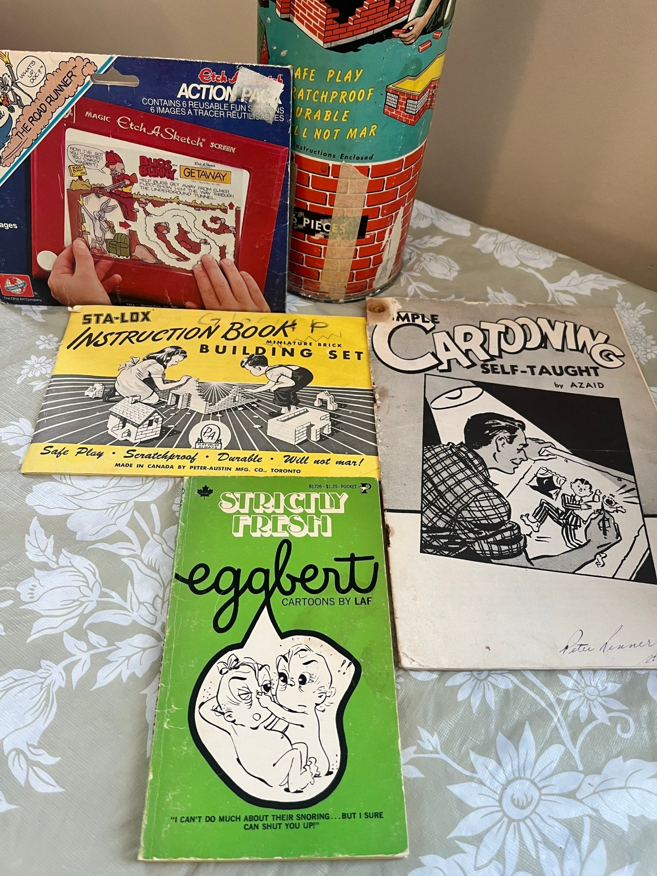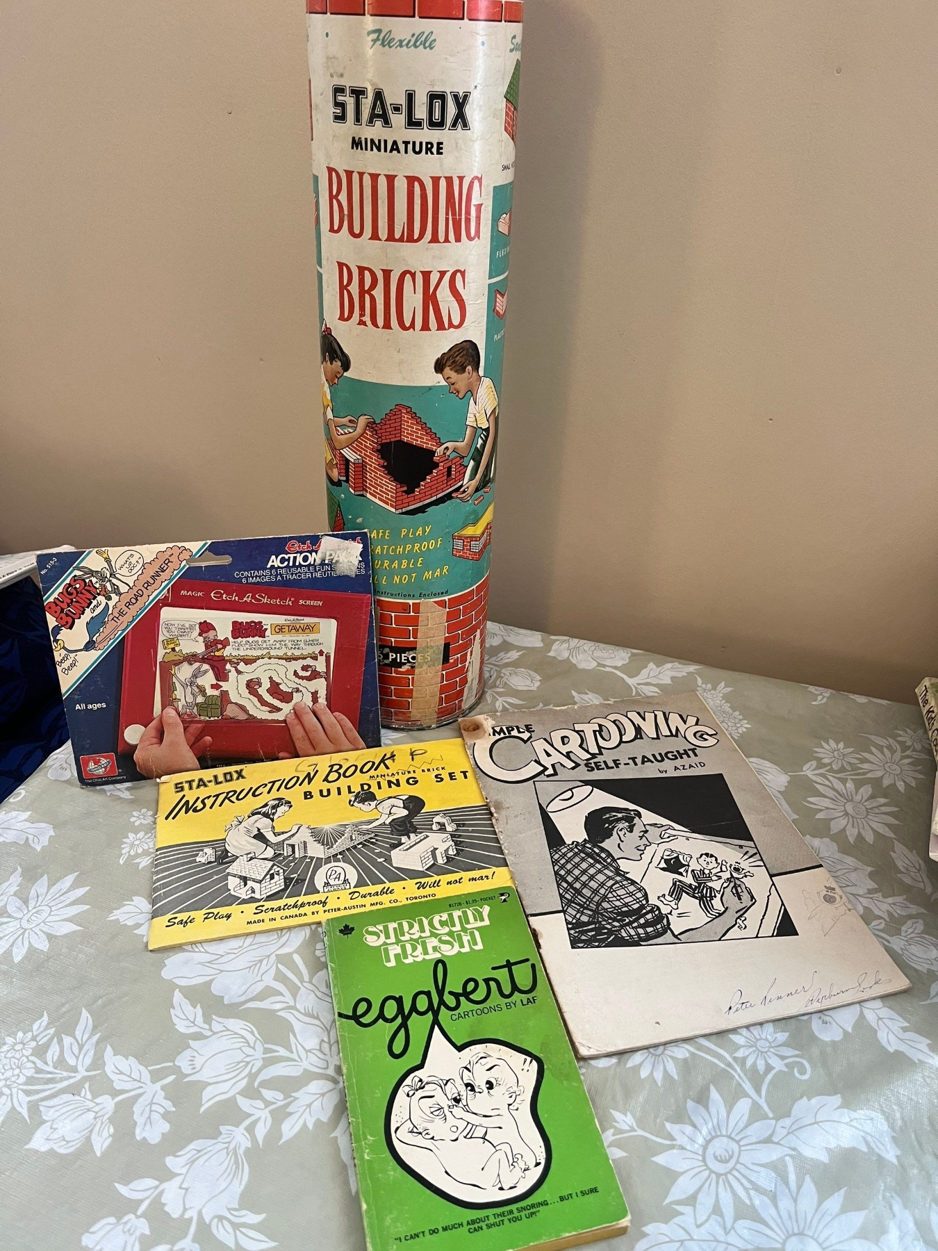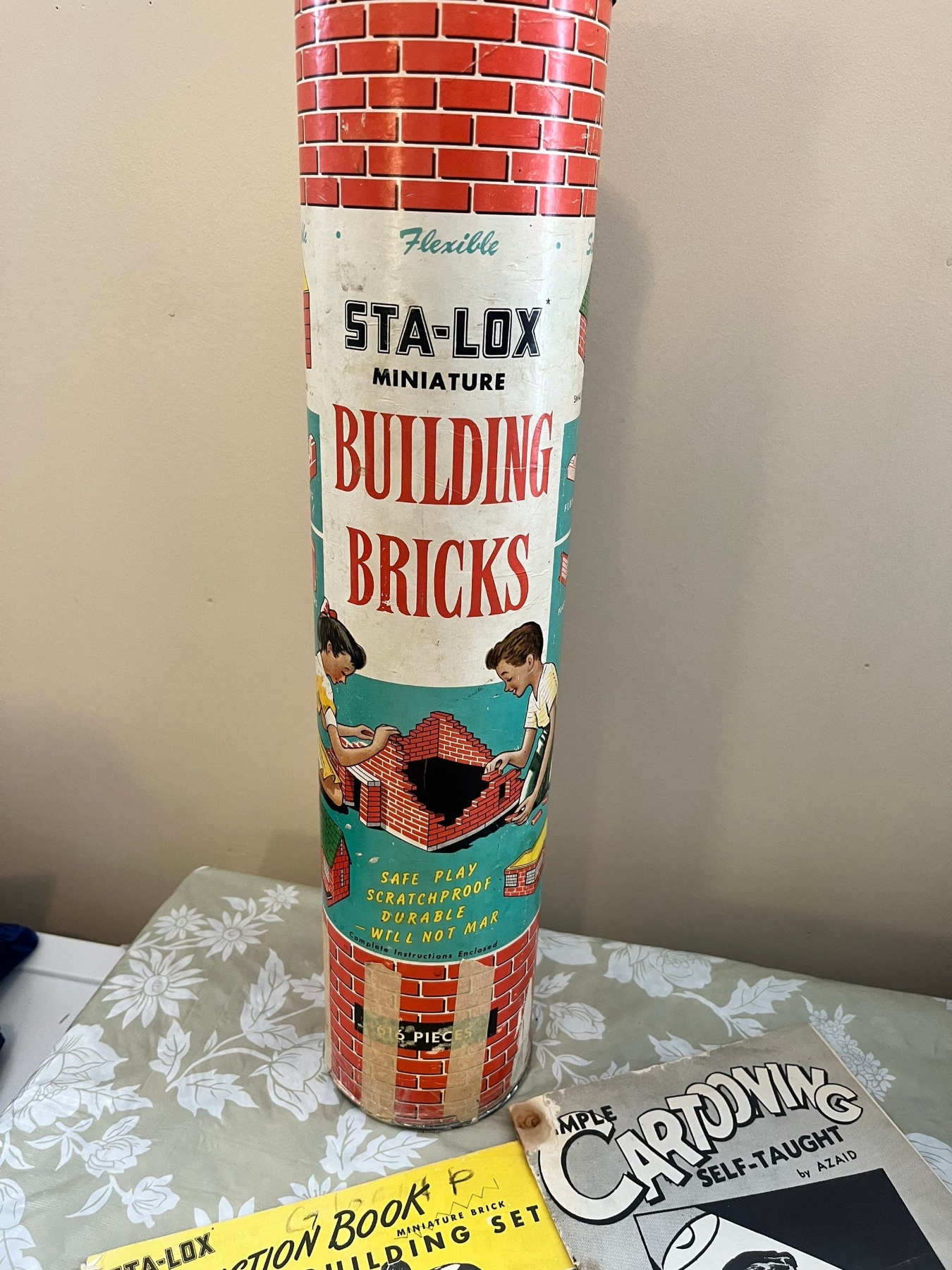 vintage cardboard tube of Sta-Lox miniature building bricks, a collectible toy set originally produced in Canada during the 1950s and 1960s, with instruction book self-taught cartooning, and etch a sketch screens of Bugs Bunny and the road run.