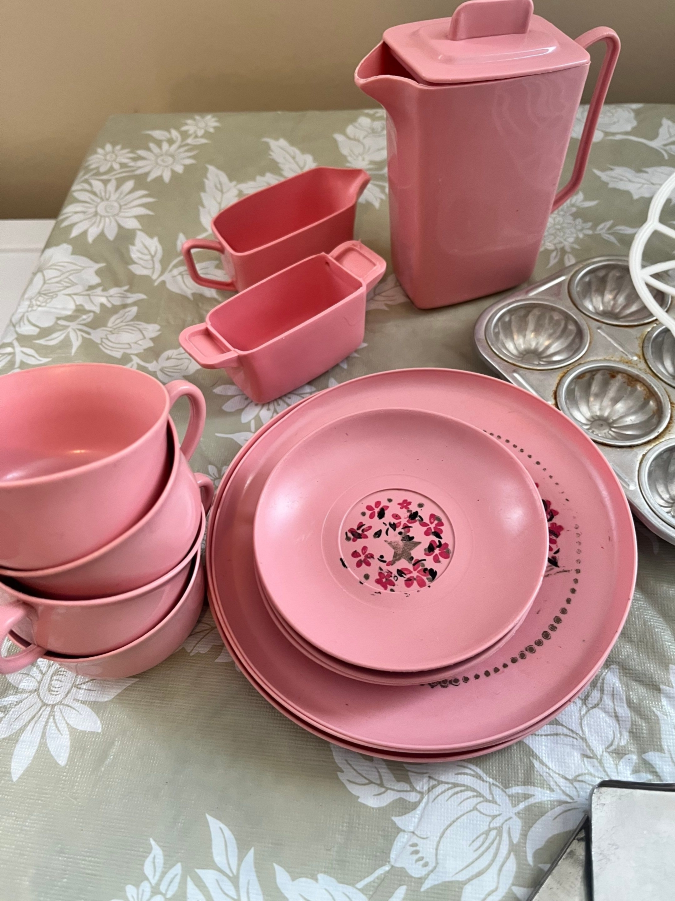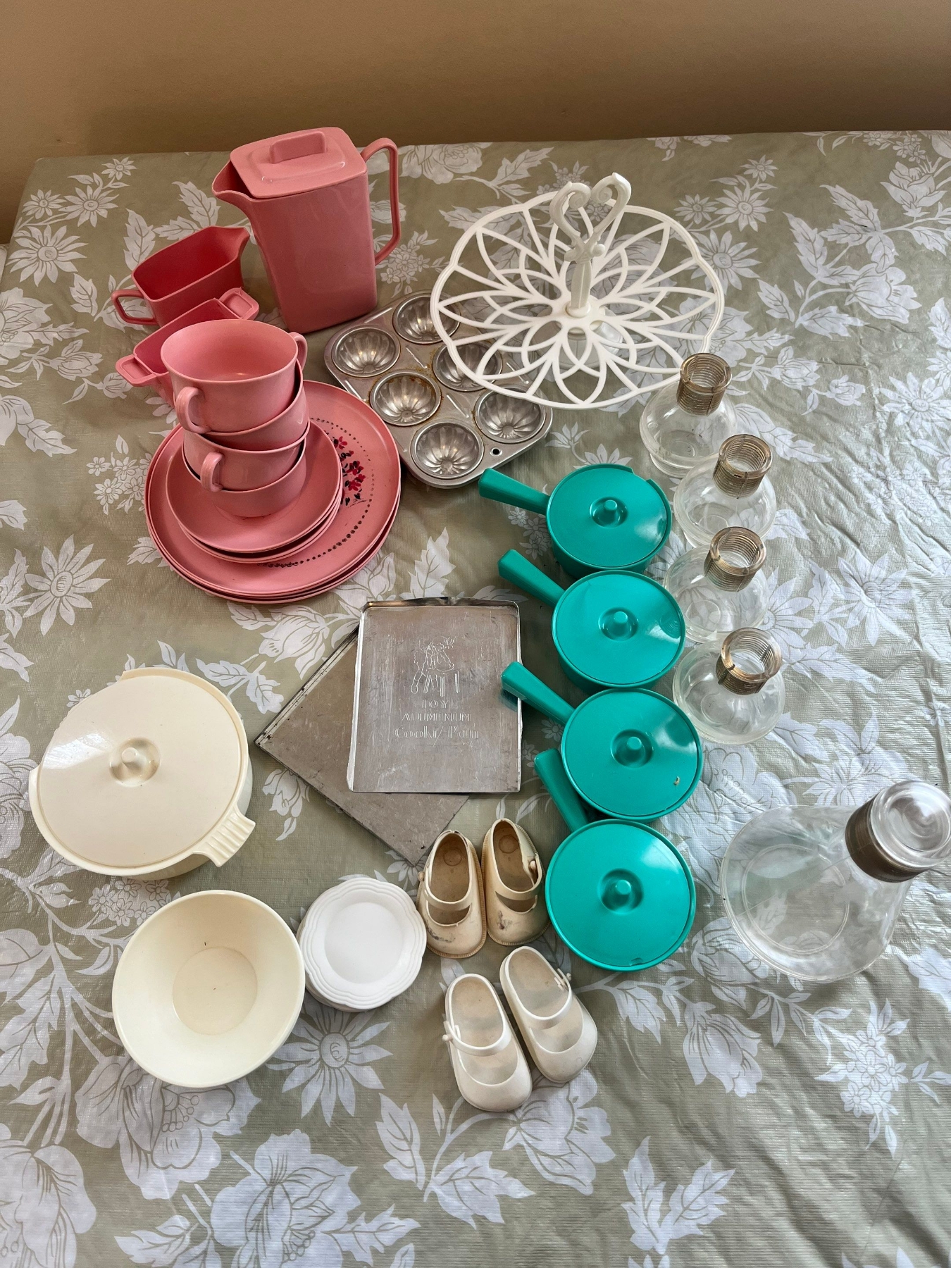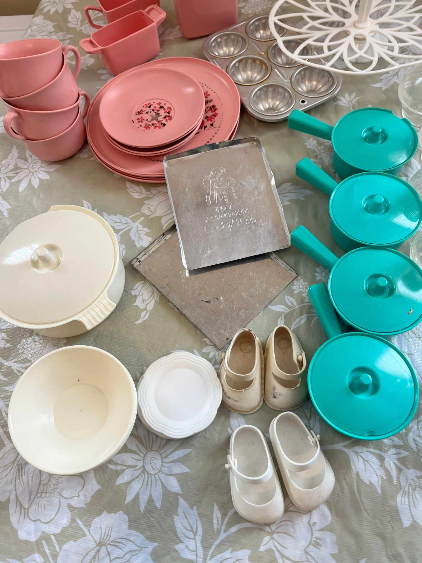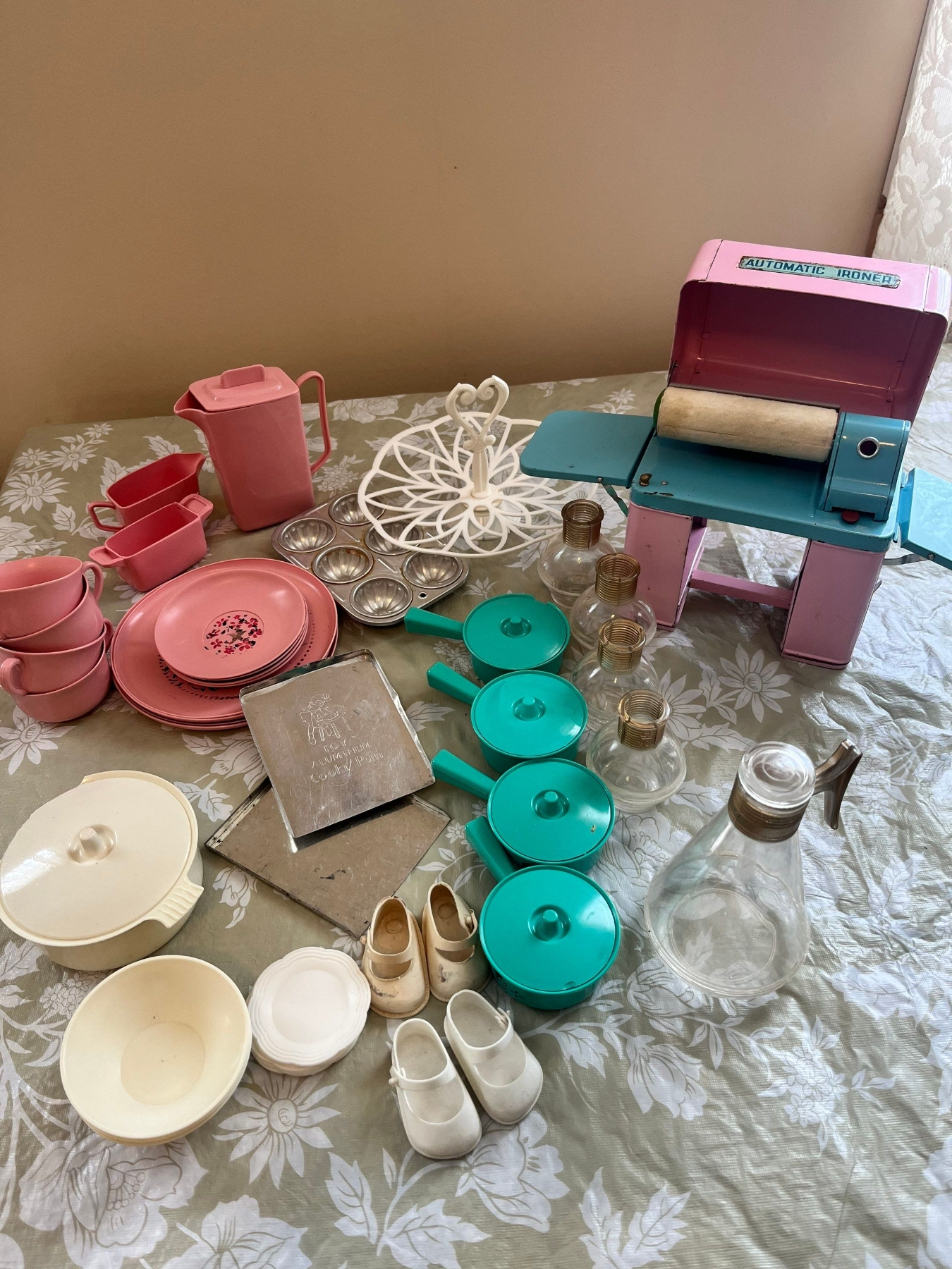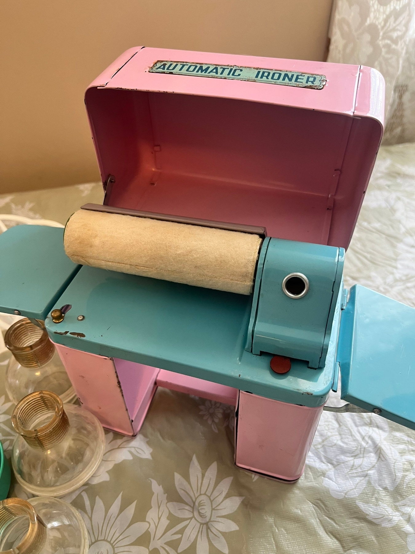 vintage tin "Suzy Q" automatic toy ironer from the 1950s, manufactured by A G W Toys, vintage pink plastic or melamine children's dish set, along with a variety of other mini doll kitchen set.