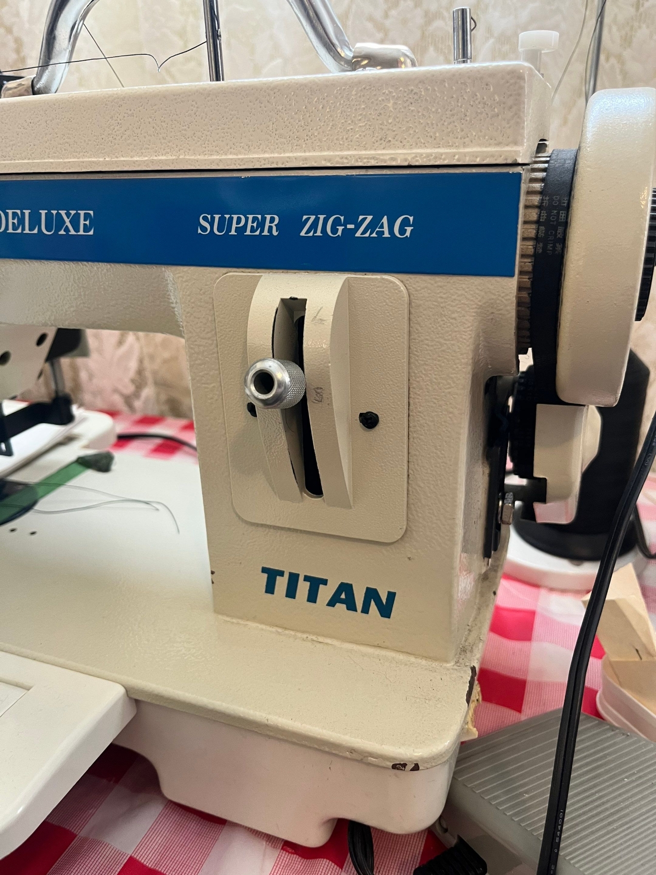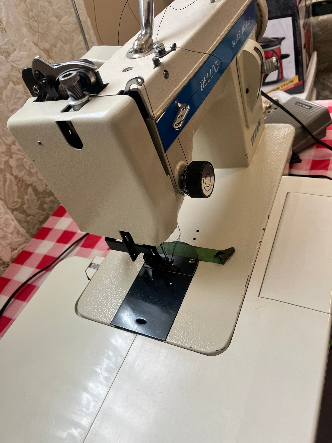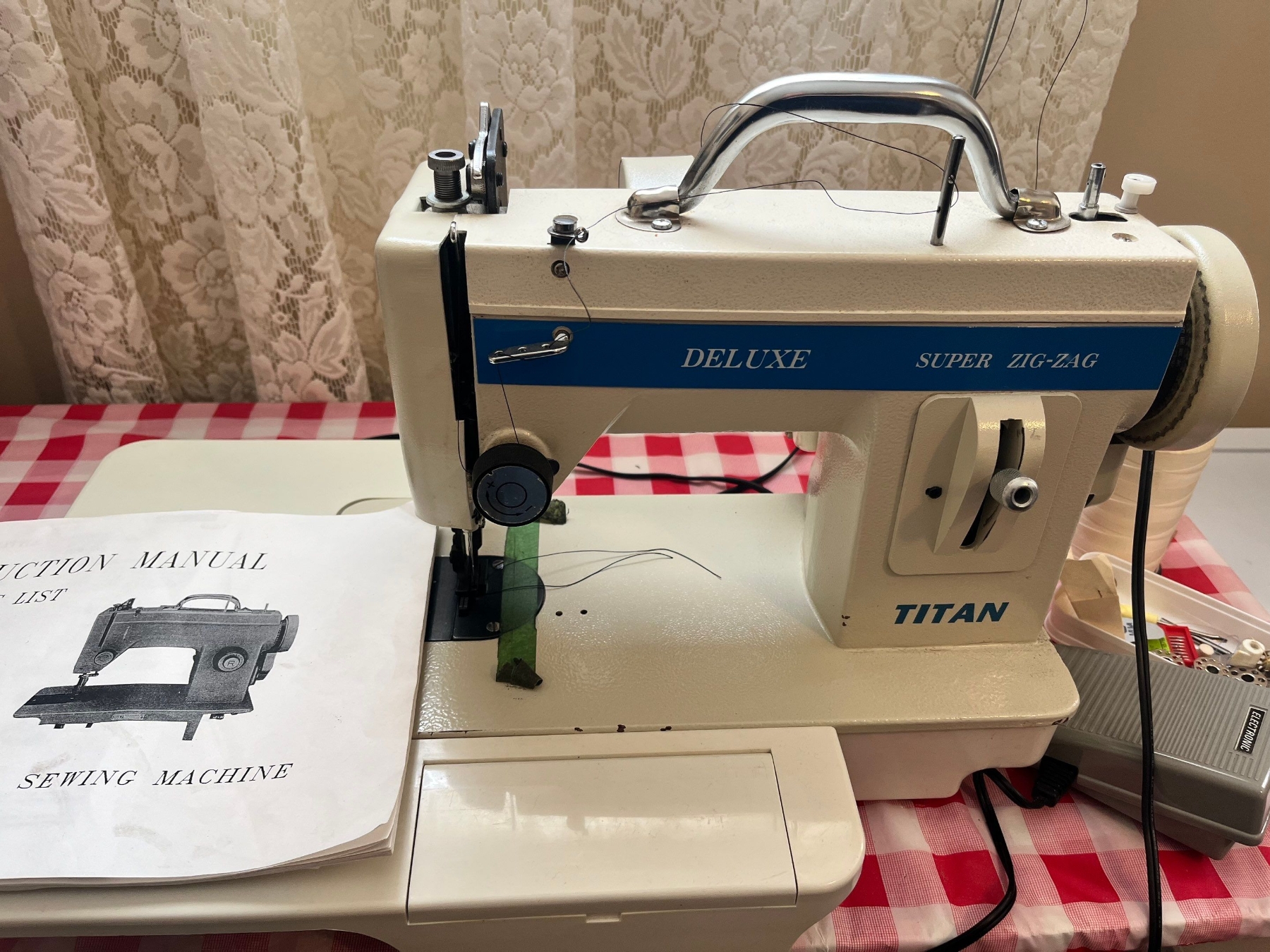 Deluxe, super zigzag, Titan, sewing machine with extra thread spindles, thread holder, in great working condition.