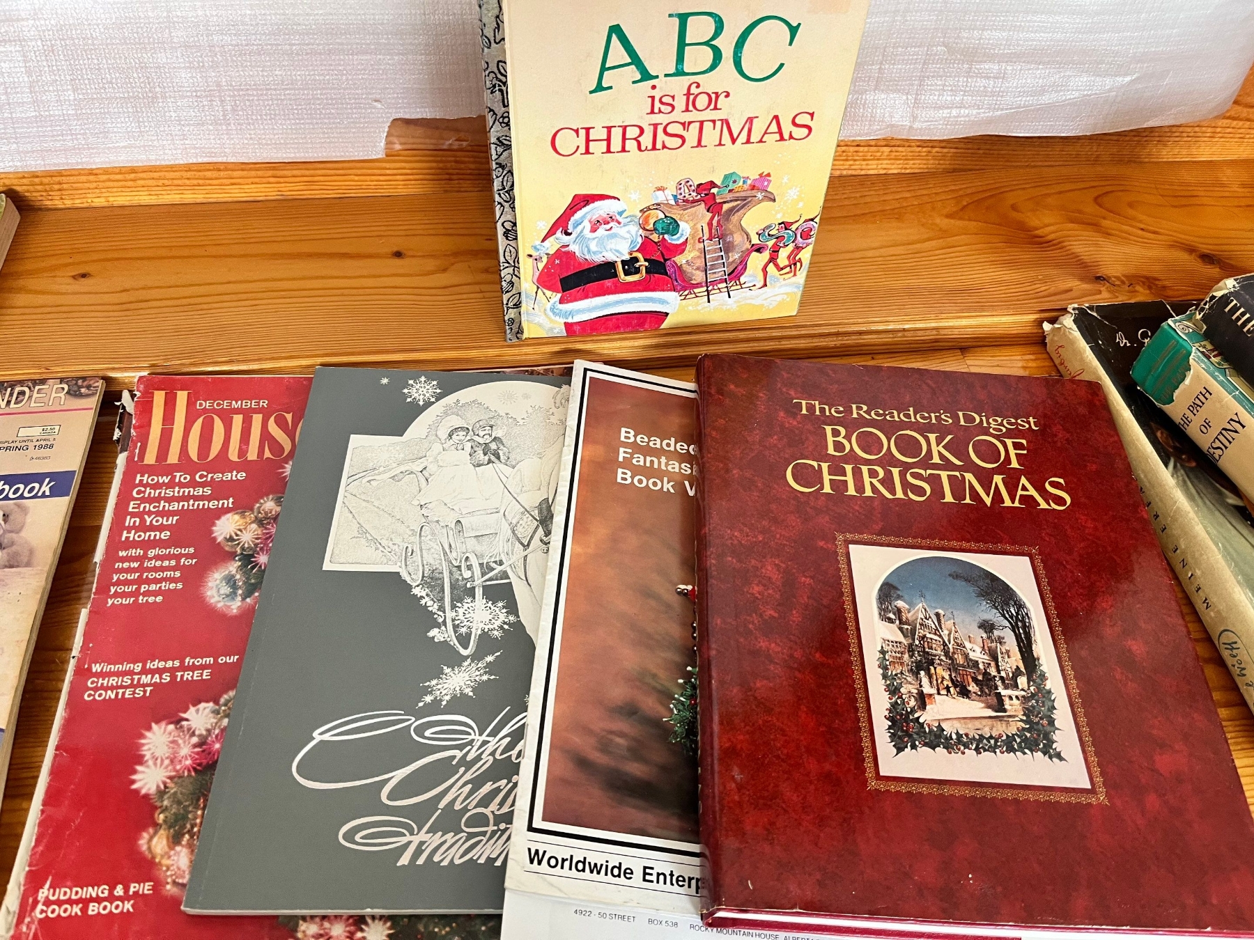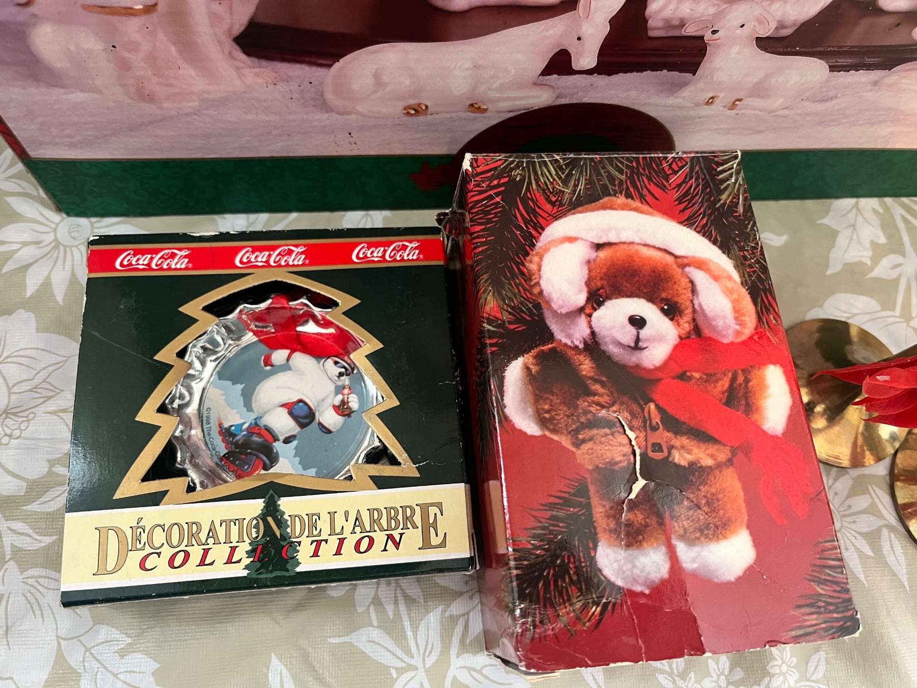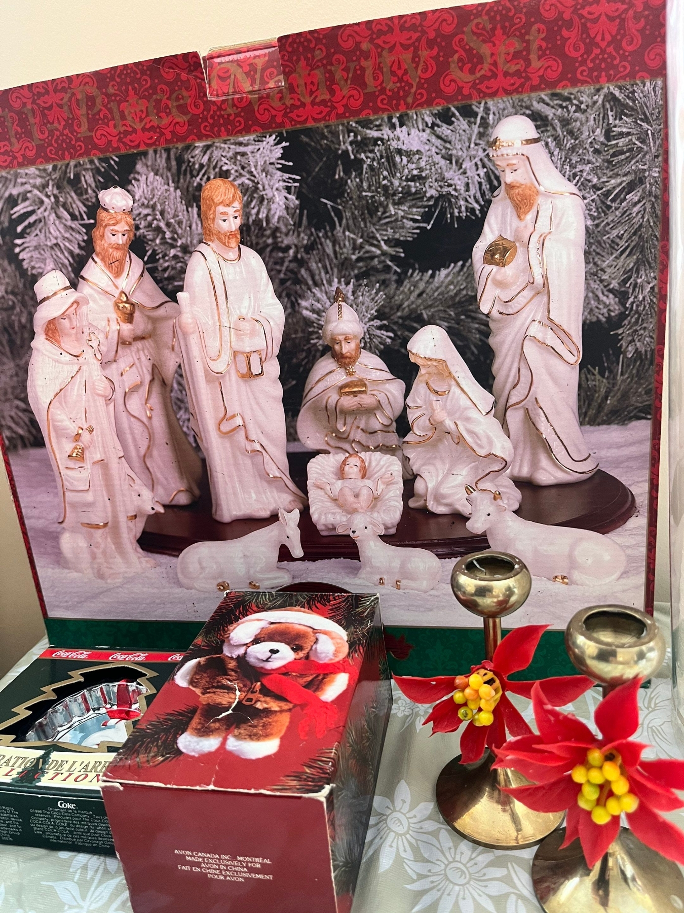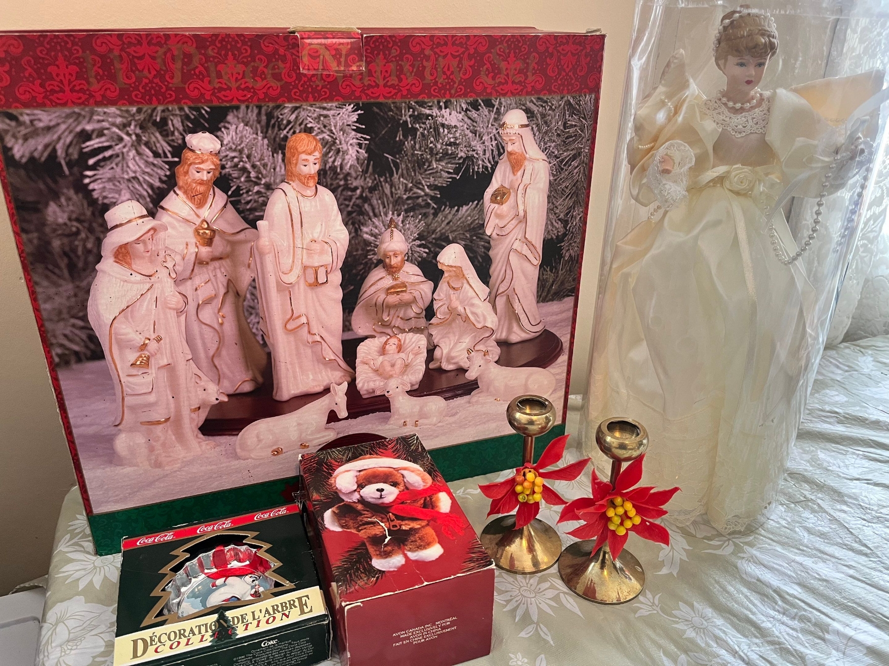 Of Christmas items, a large angel, brass candleholders, Coca-Cola decorative tree ornament, a porcelain Christmas nativity scene plus an assortment of Christmas books.