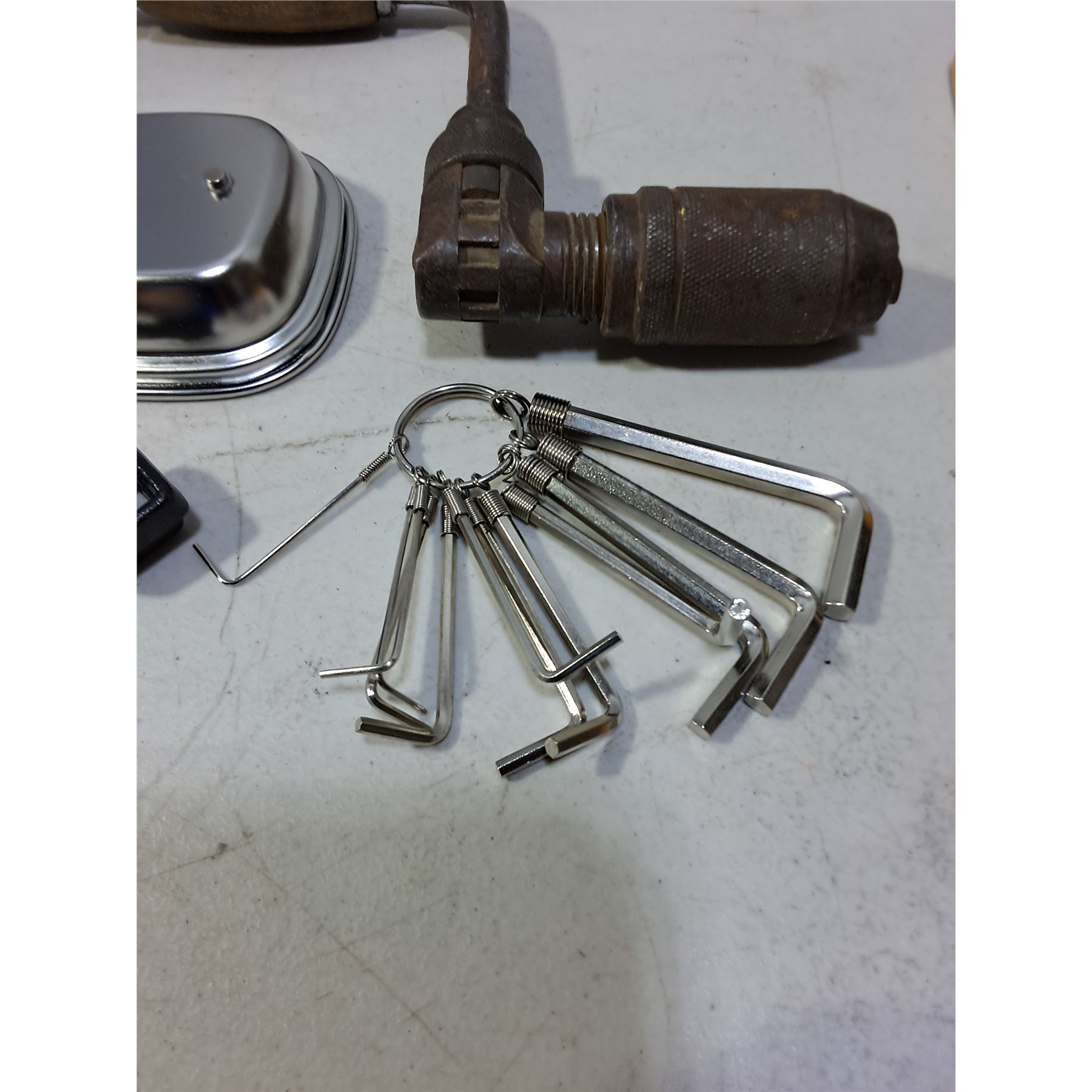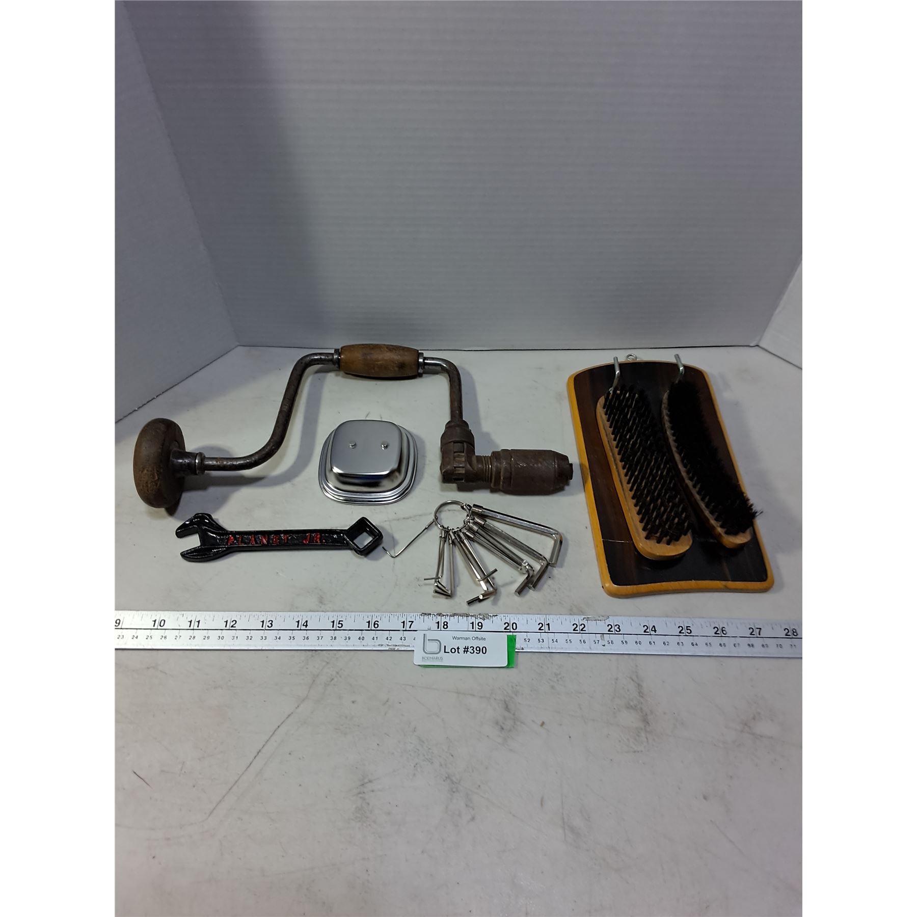 Lot 390 Vintage Speed Drill, Shoe Polish Brushes, Allan Wrench Set, Misc.