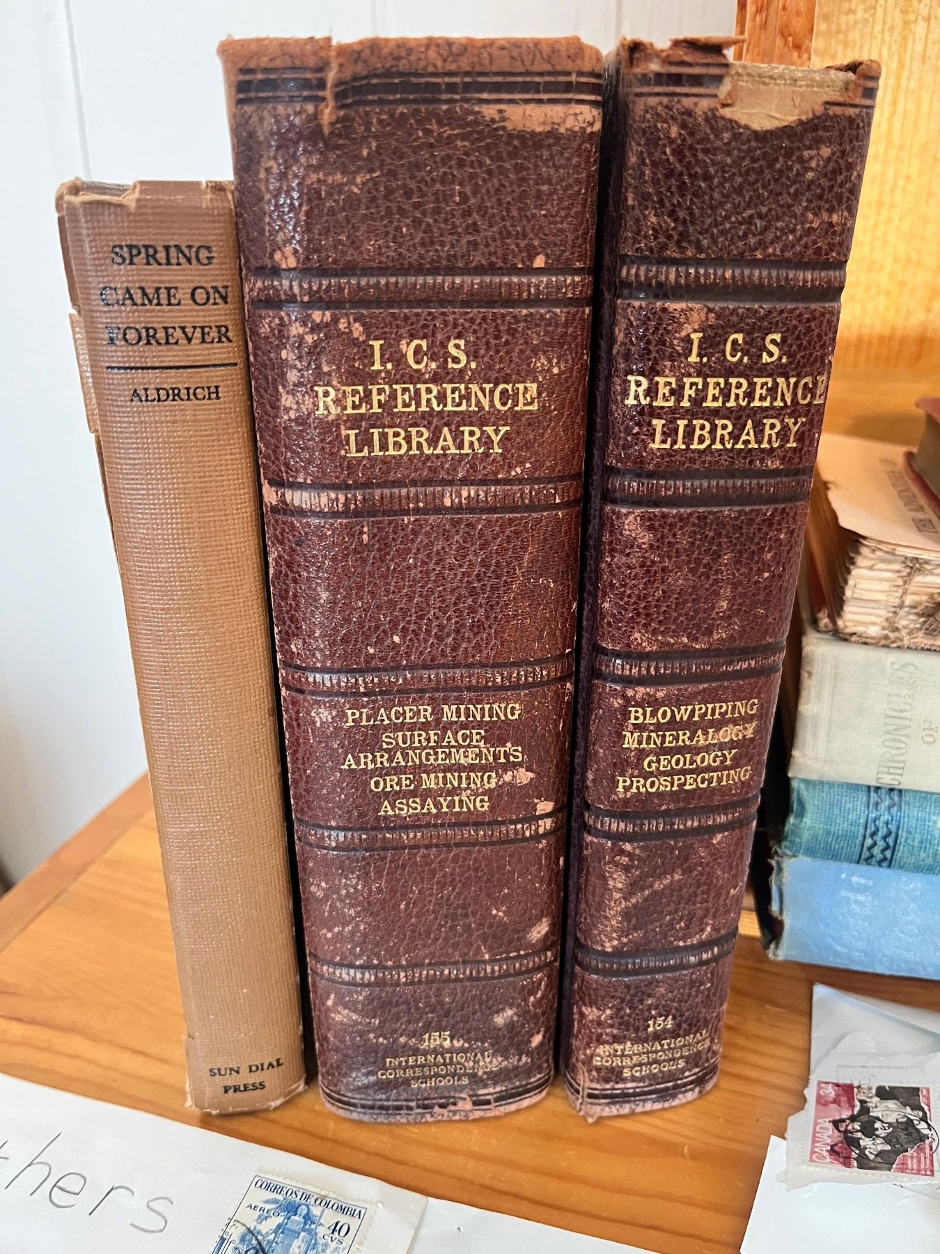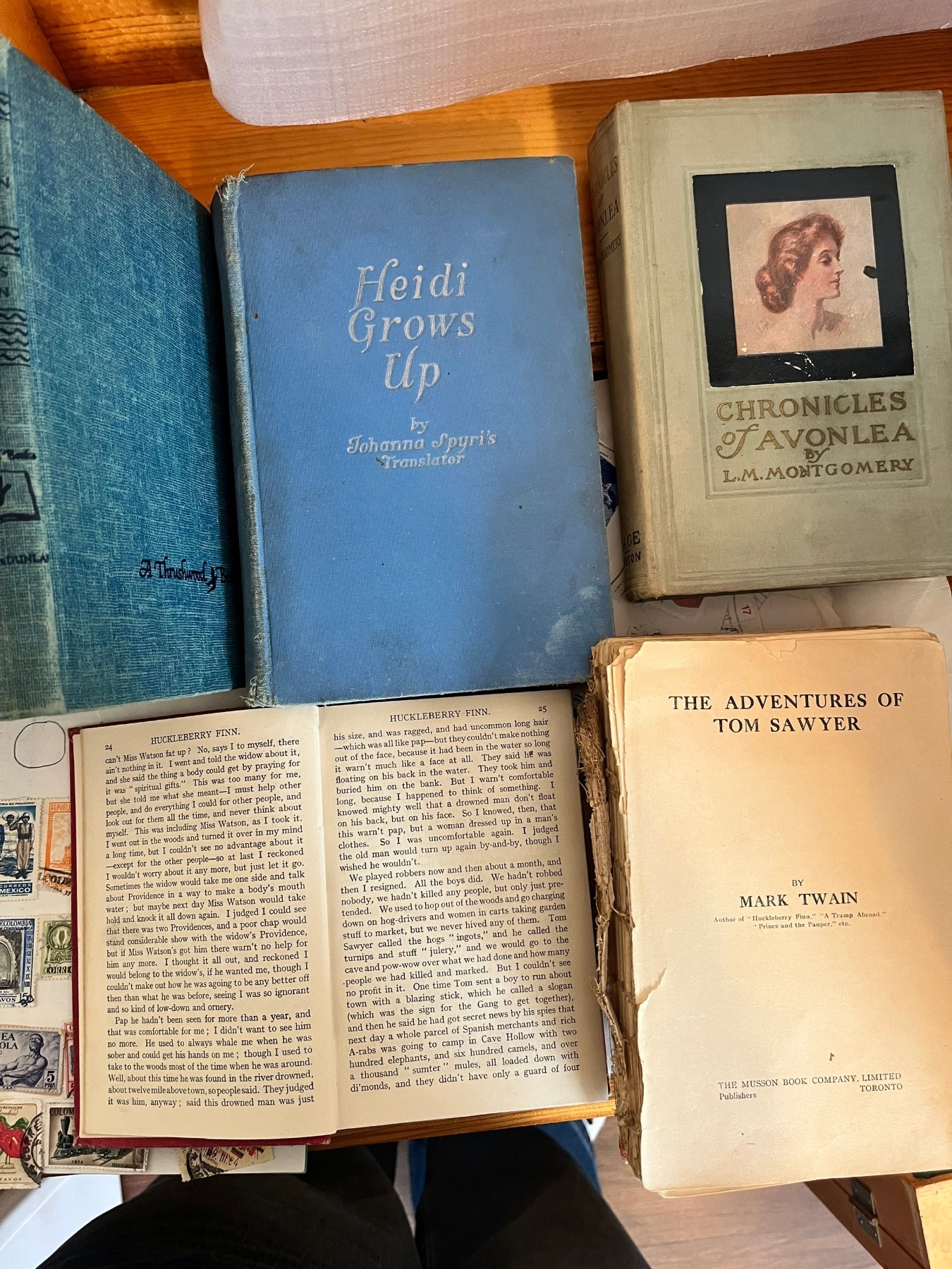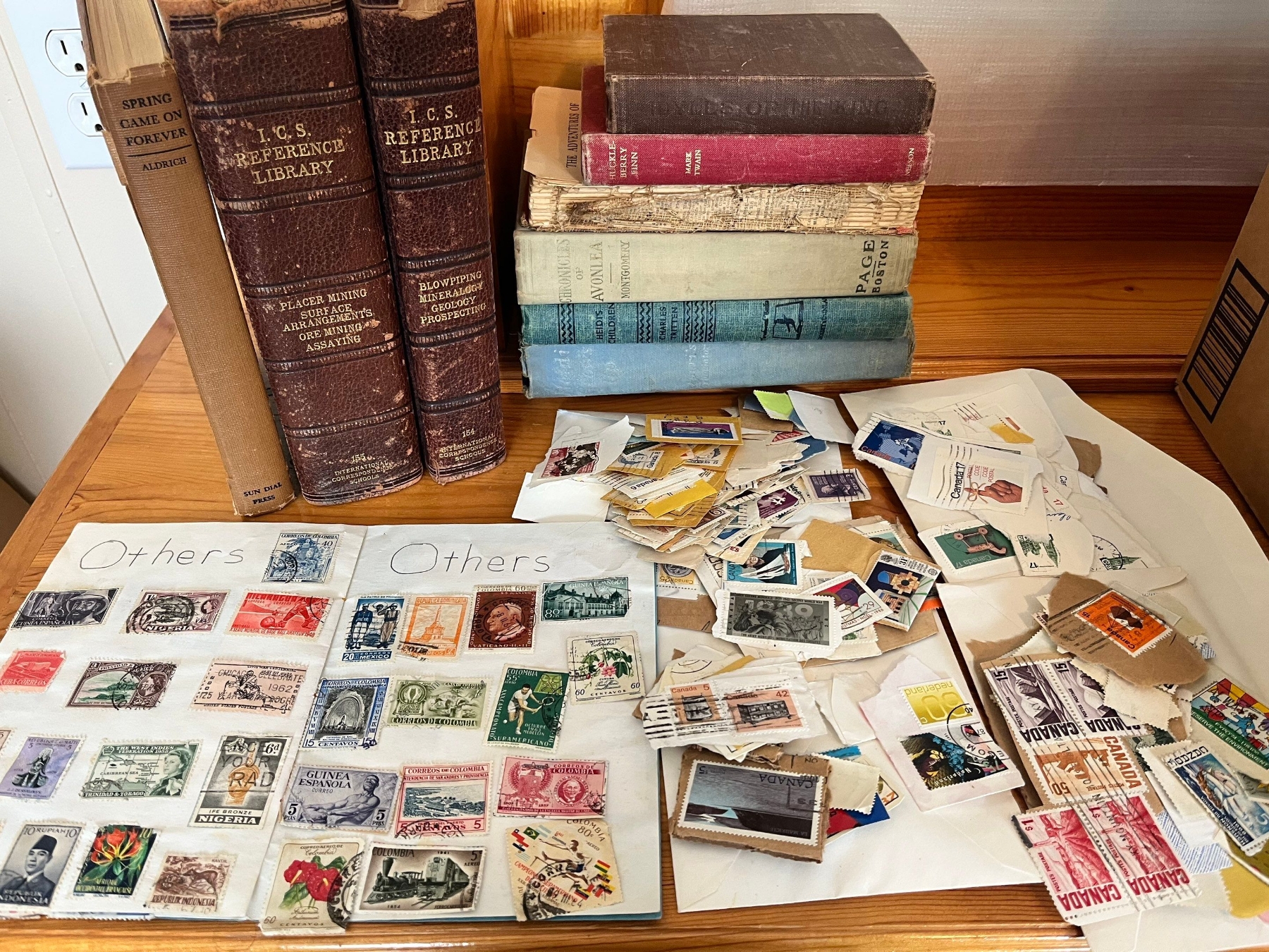 Vintage Stamp collection with assorted vintage books. Heidi grows up, Heidi’s children, The adventures of Tom Sawyer, Huckleberry Finn, spring came on forever and 2 I. C. S. Reference library hardback. Blow-piping mineral energy and placing mining surface arrangements.