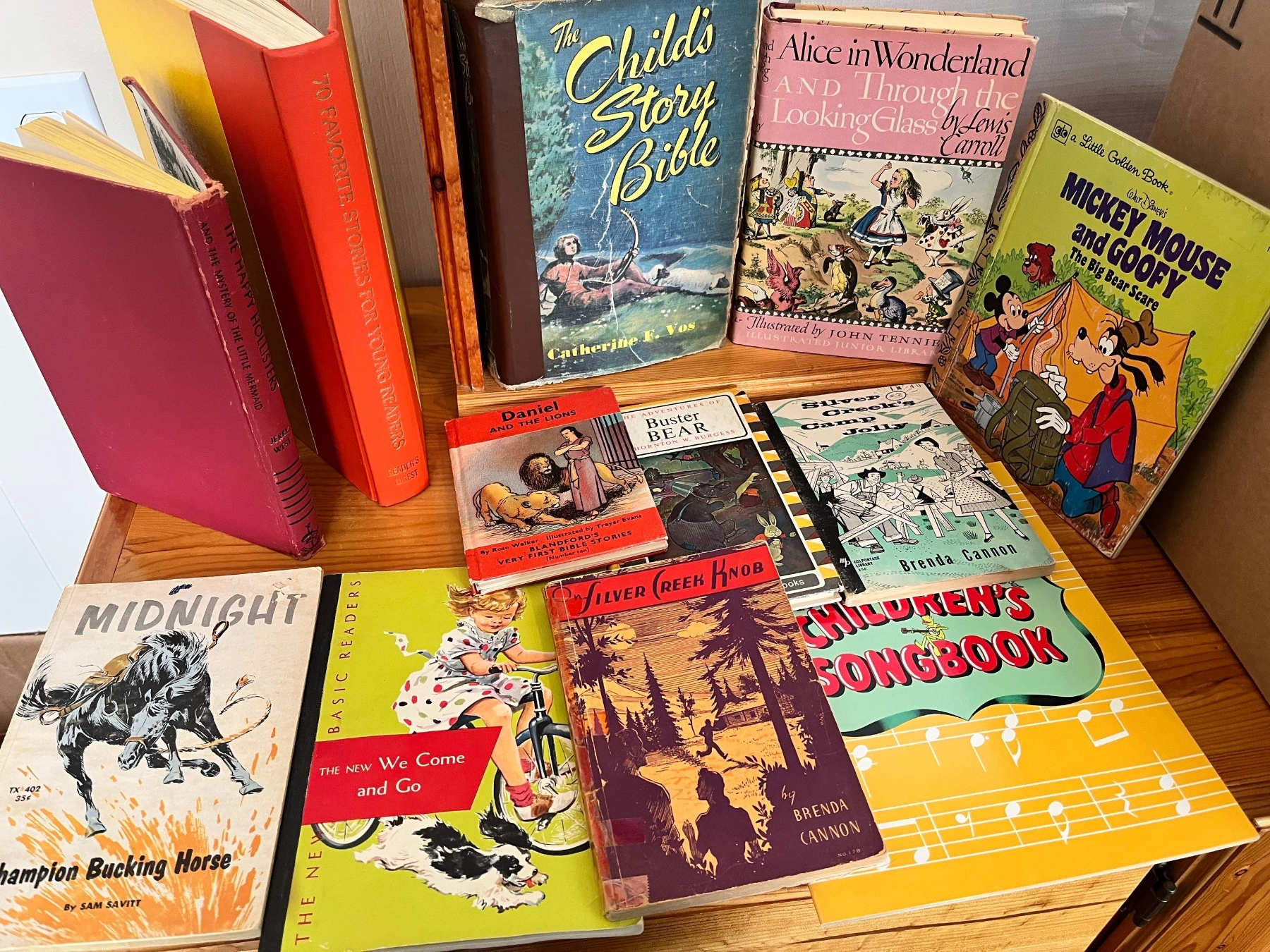 Vintage children’s books Alice in Wonderland, a child’s story, Bible, Mickey Mouse and Goofy, Buster Bear Silver Creek knob midnight 70 favourite stories for young readers and more.