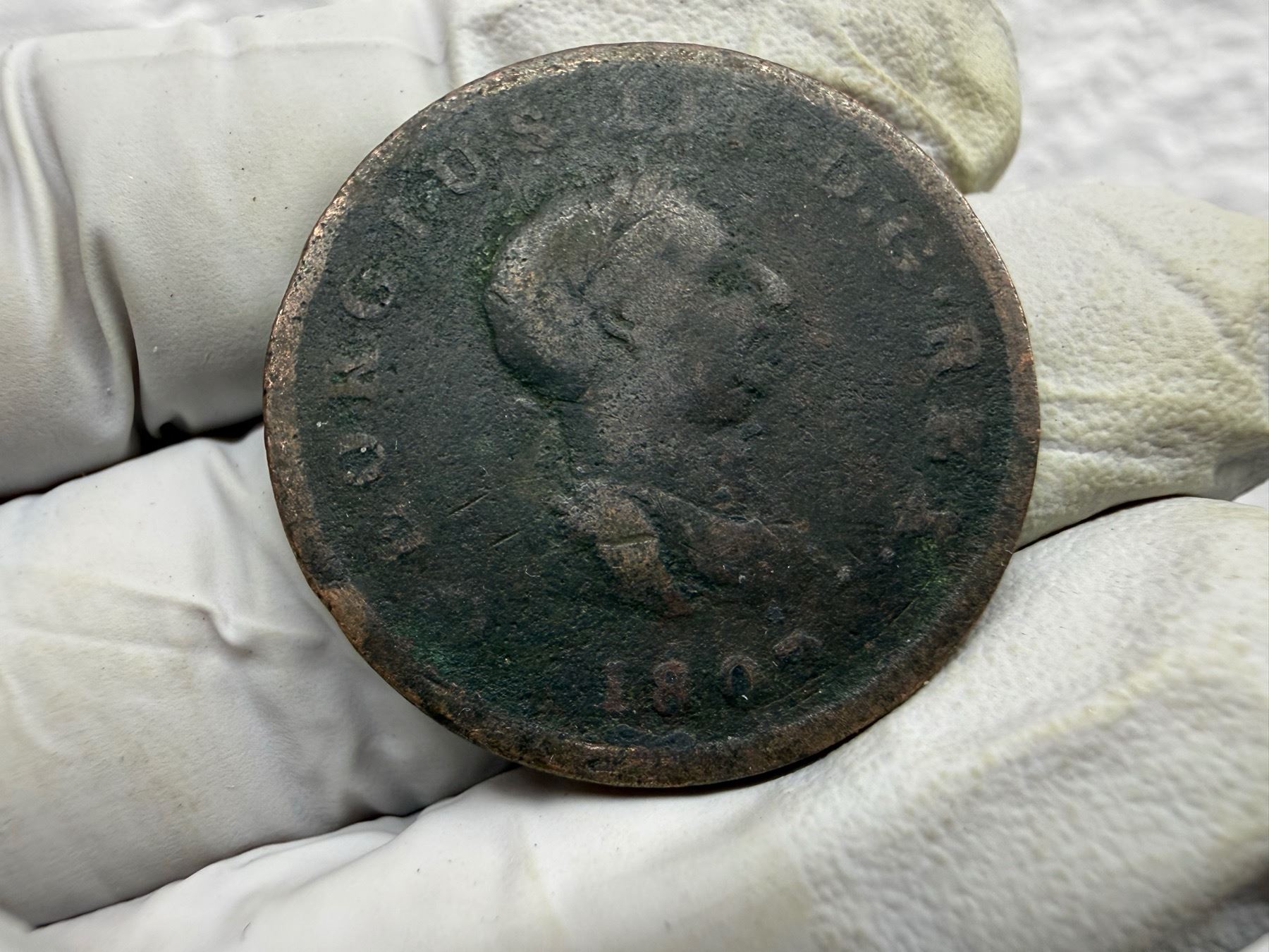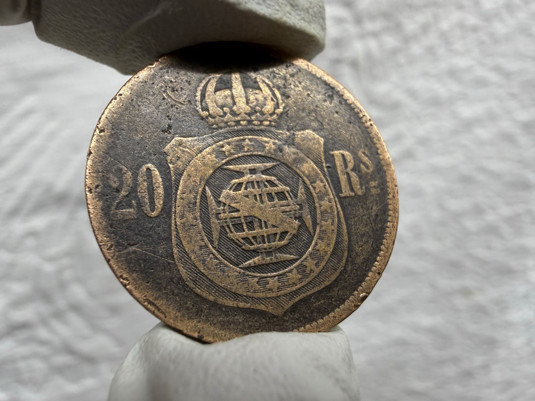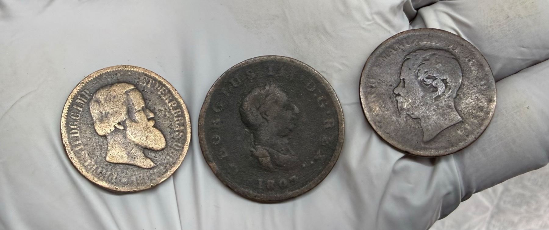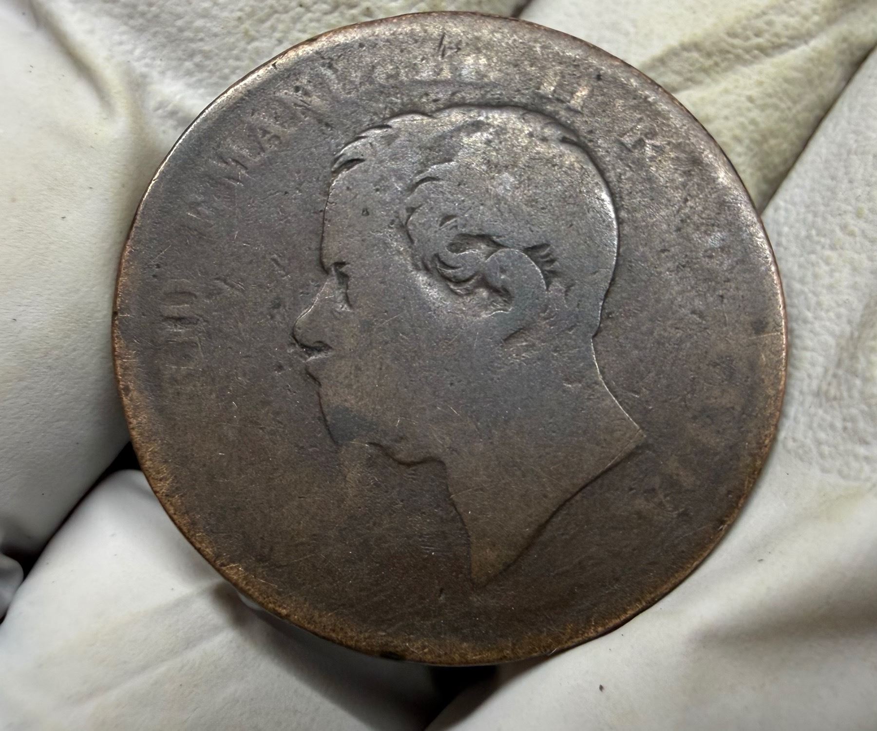 BRAZIL 20 RÉIS COIN FROM THE REIGN OF EMPEROR PEDRO II, LIKELY DATED 1869 BASED ON THE PORTRAIT AND LETTERING; BRONZE /// COLLECTIBLE 1806 OR 1807 BRITISH HALFPENNY FEATURING KING GEORGE III ON THE OBVERSE AND SEATED BRITANNIA ON THE REVERSE; COPPER /// ANTIQUE ITALIAN 5 CENTESIMI COIN FEATURING THE PORTRAIT OF KING VICTOR EMMANUEL II OF ITALY; BRONZE