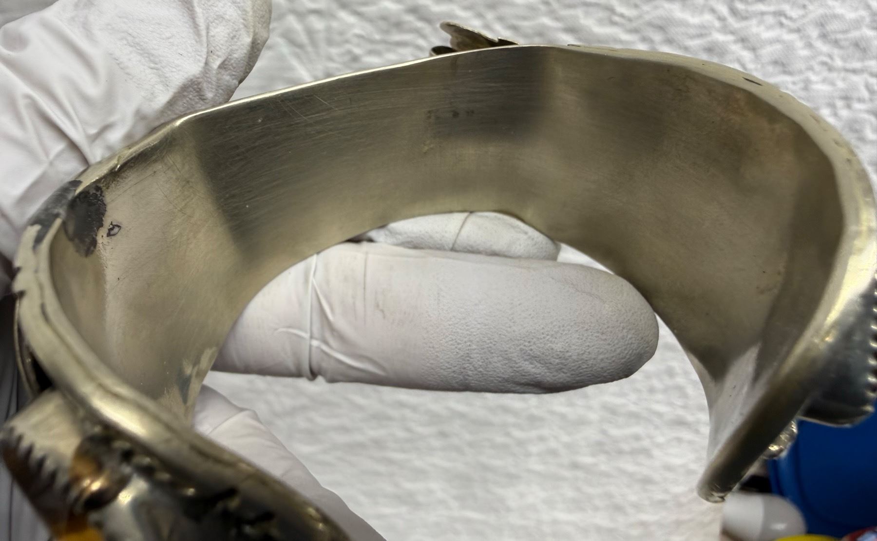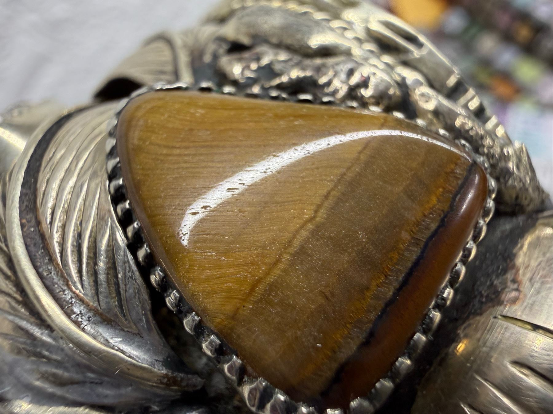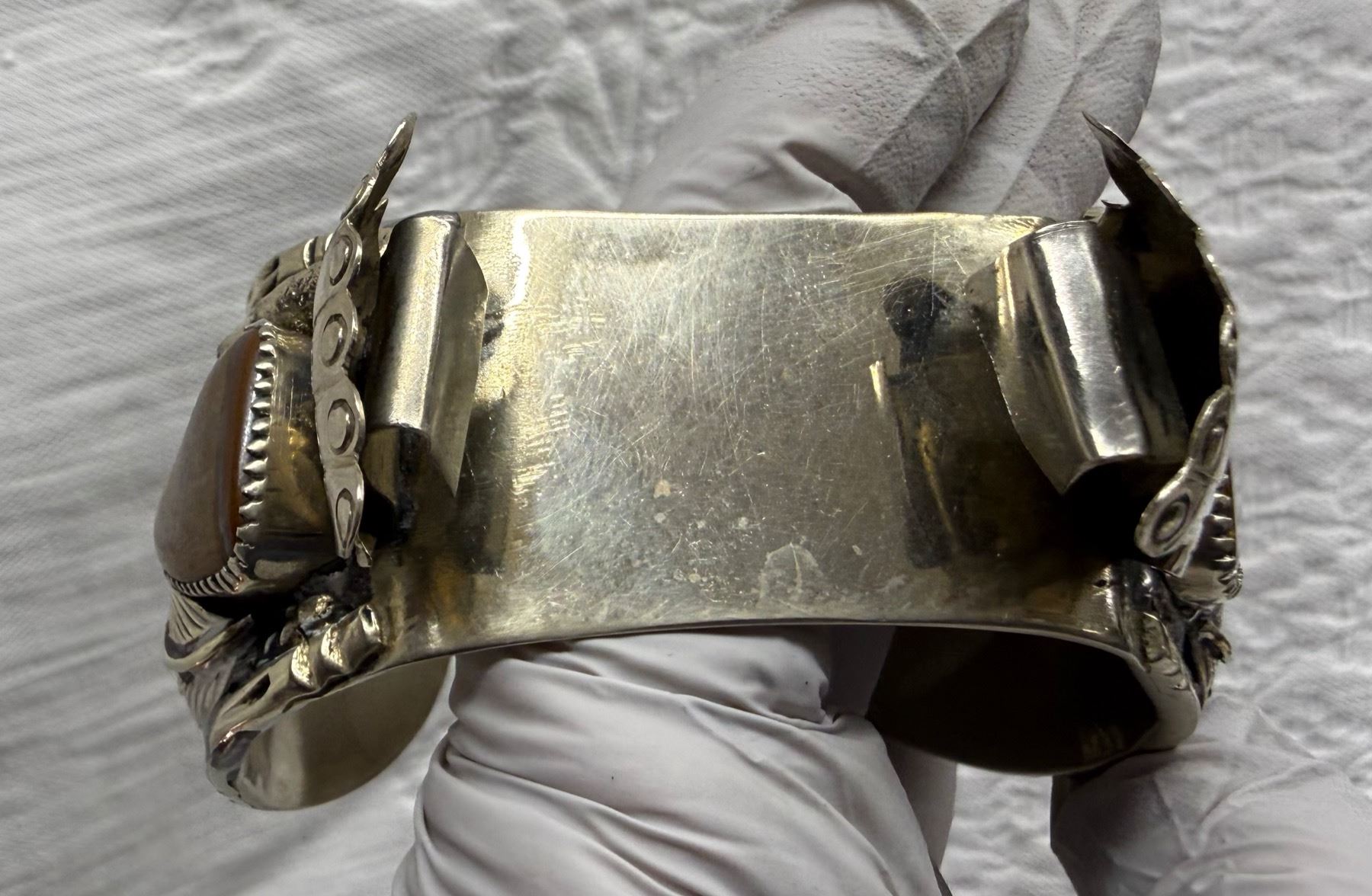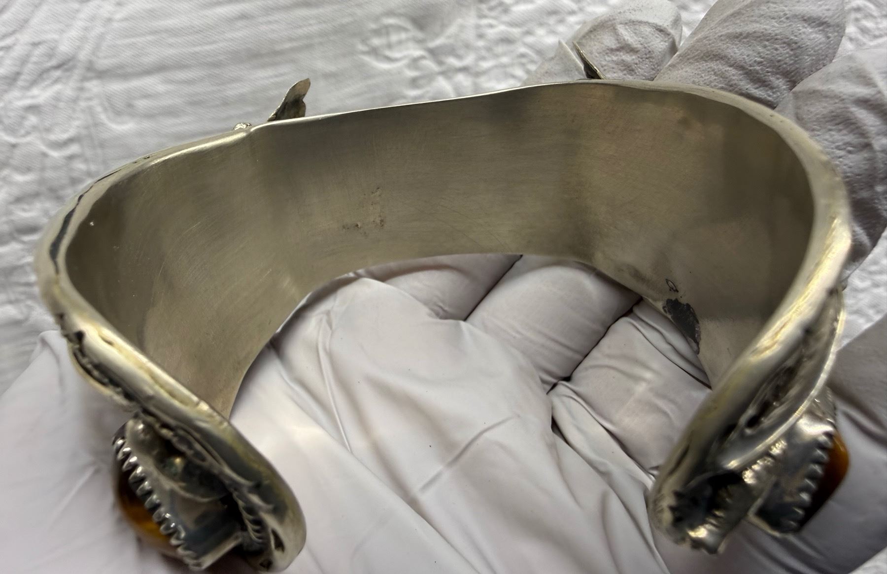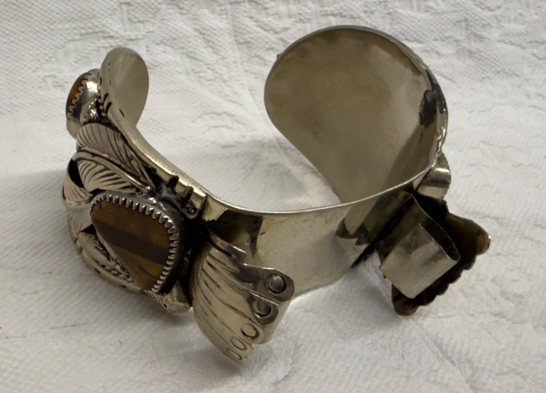 NATIVE AMERICAN CUFF BRACELET WITH TIGER'S EYE STONES; HANDCRAFTED LIKE THOSE BY NAVAJO SILVERSMITHS