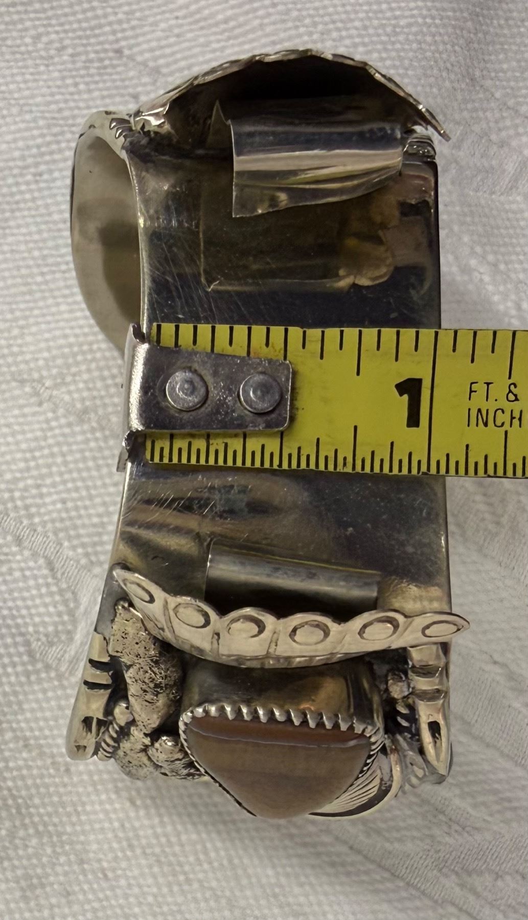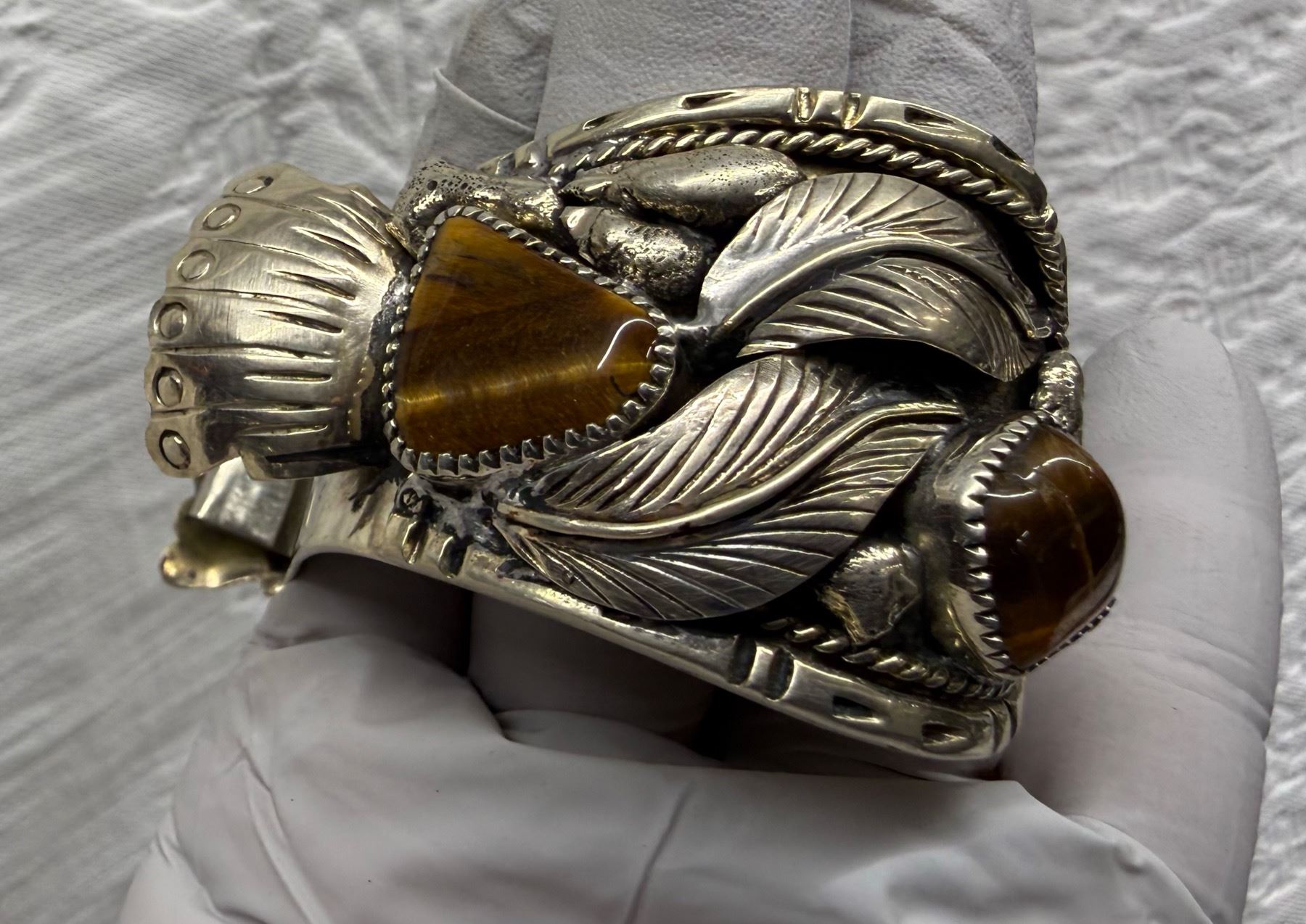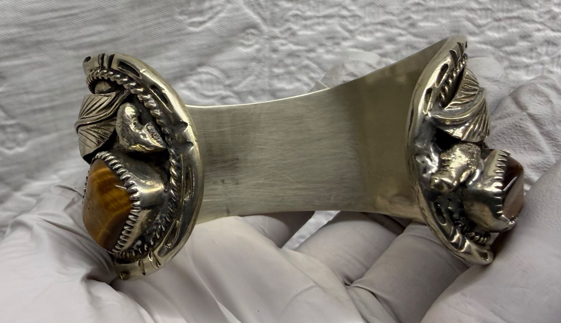 Lot 56 NATIVE AMERICAN CUFF BRACELET WITH TIGER'S EYE STONES; HANDCRAFTED