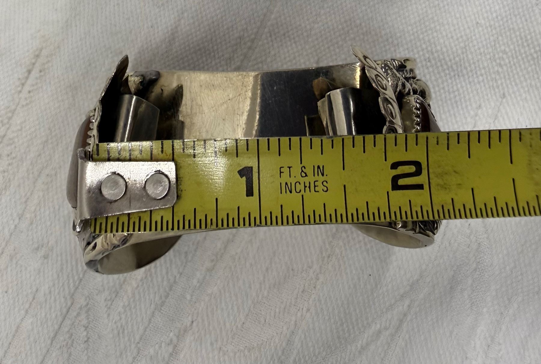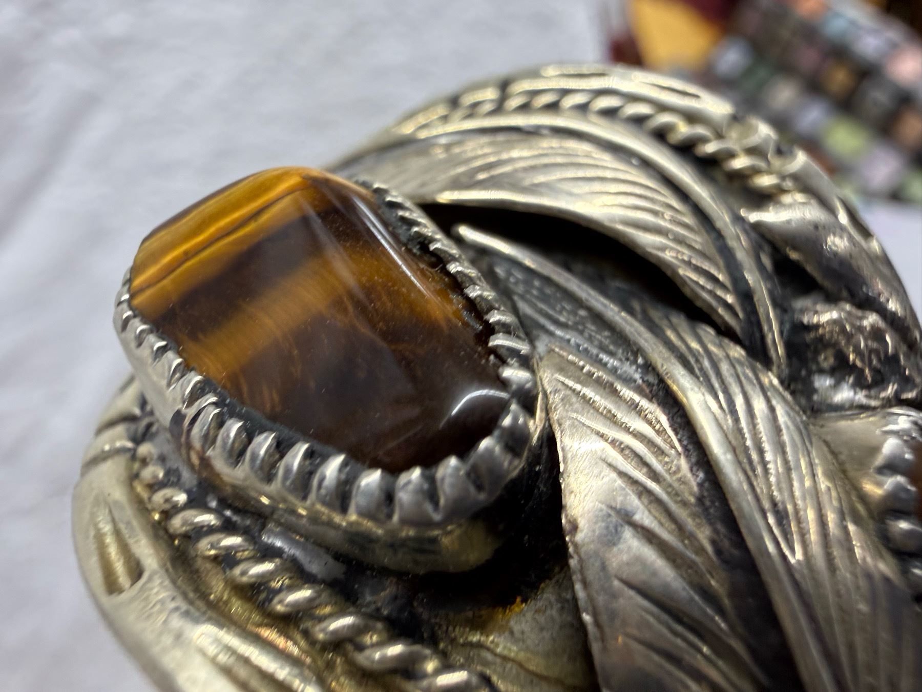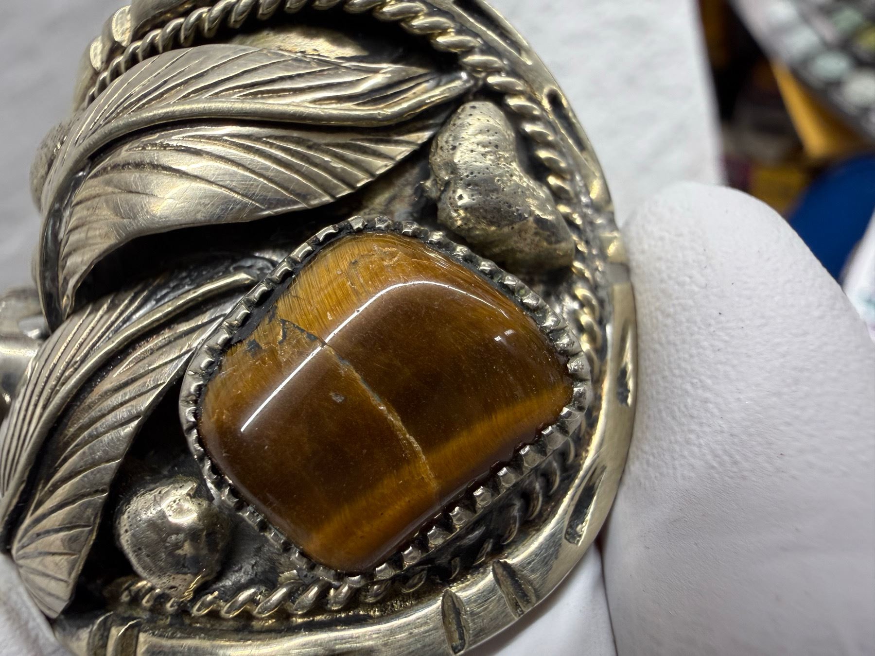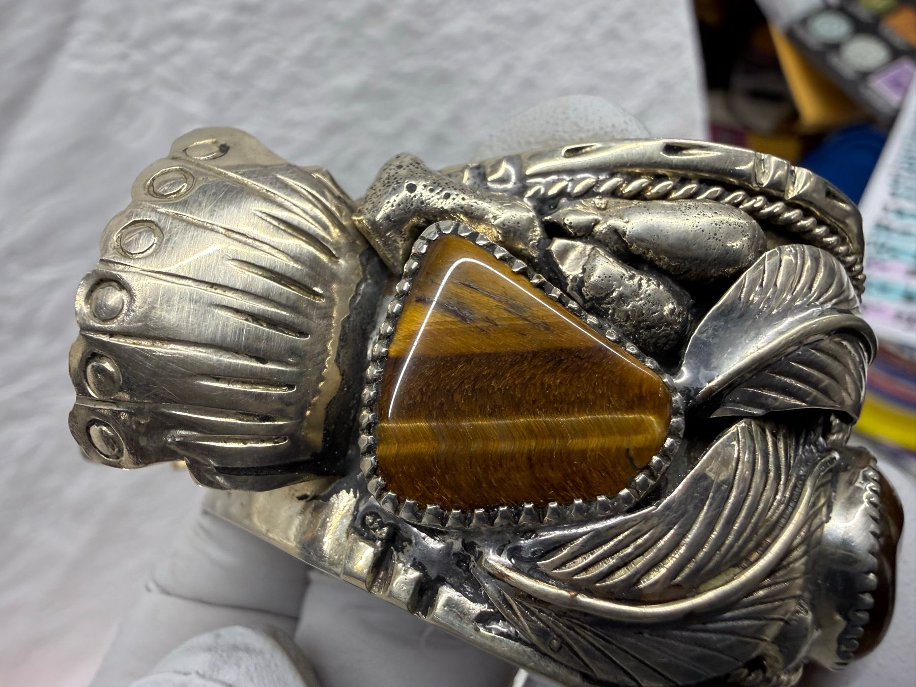 Lot 56 NATIVE AMERICAN CUFF BRACELET WITH TIGER'S EYE STONES; HANDCRAFTED