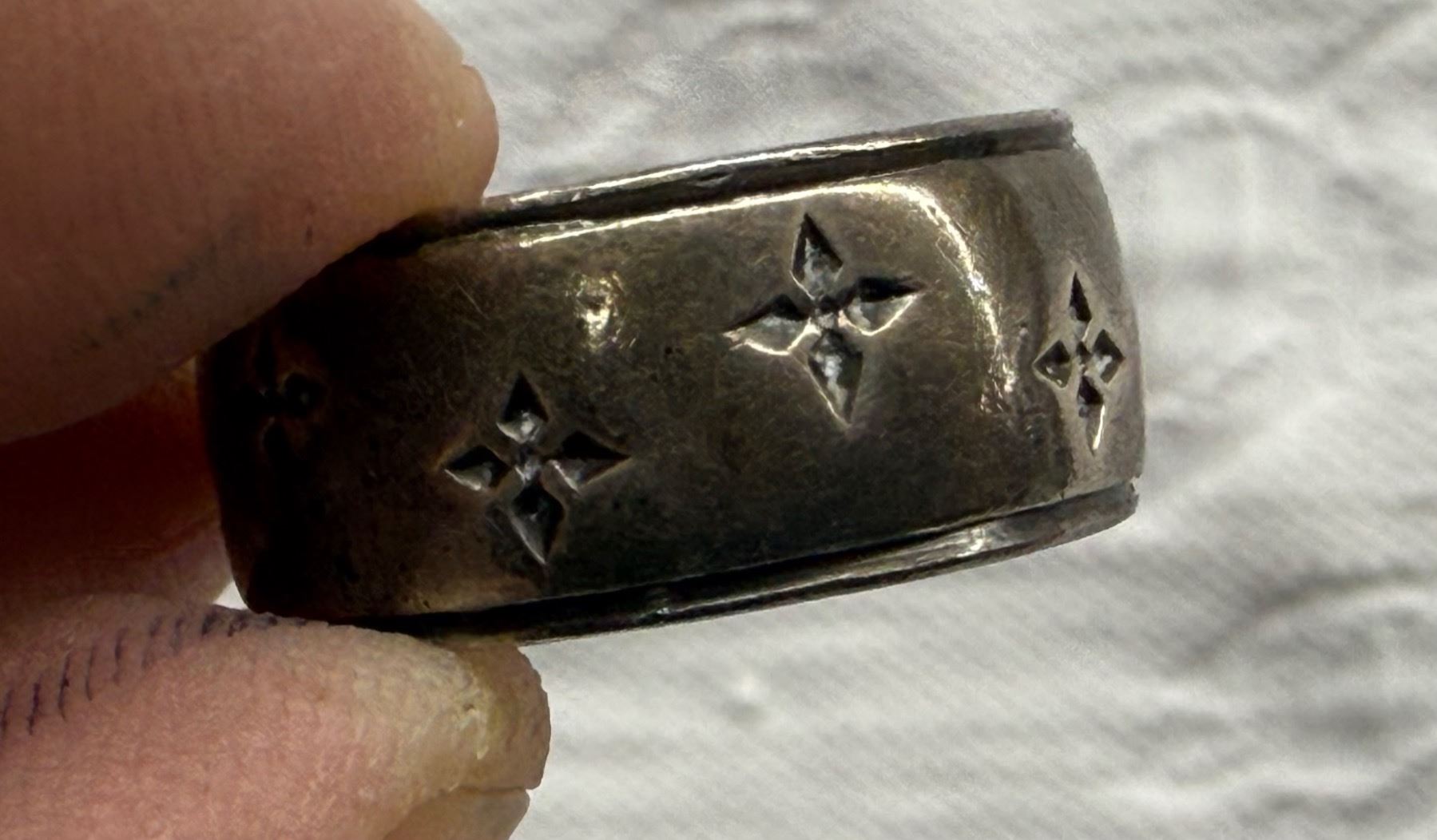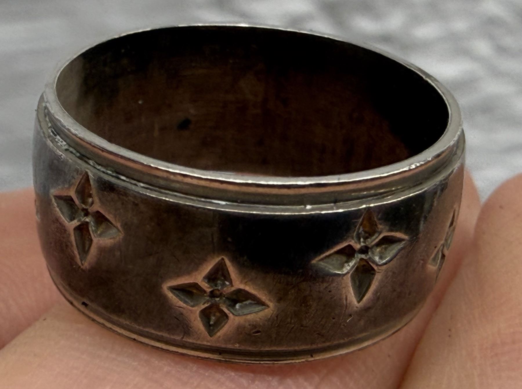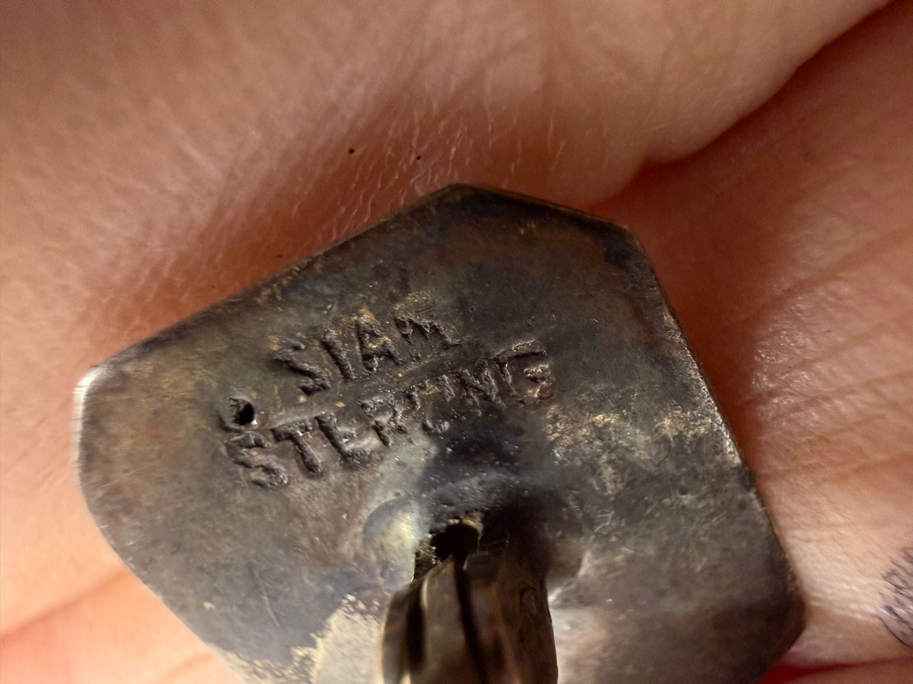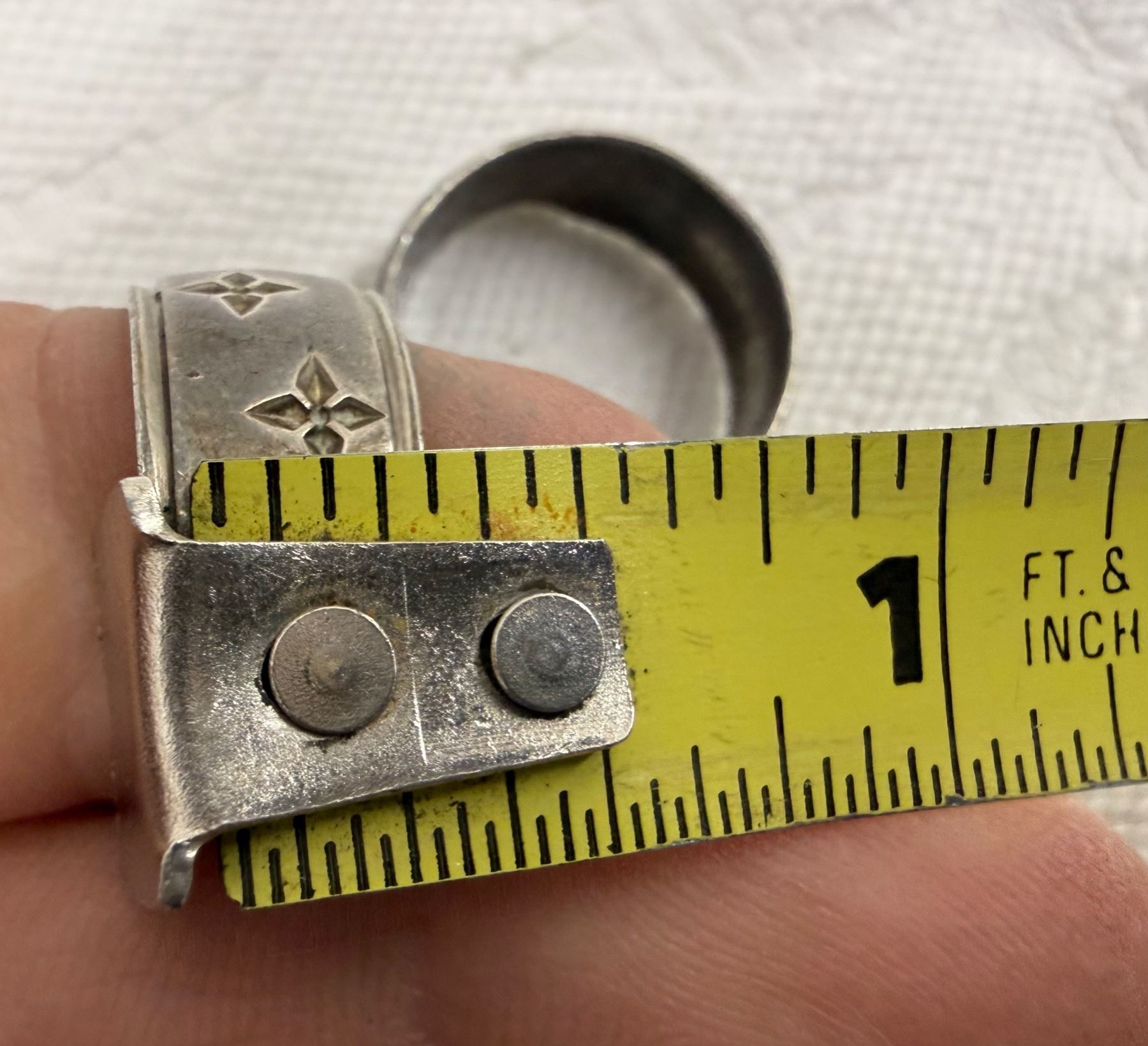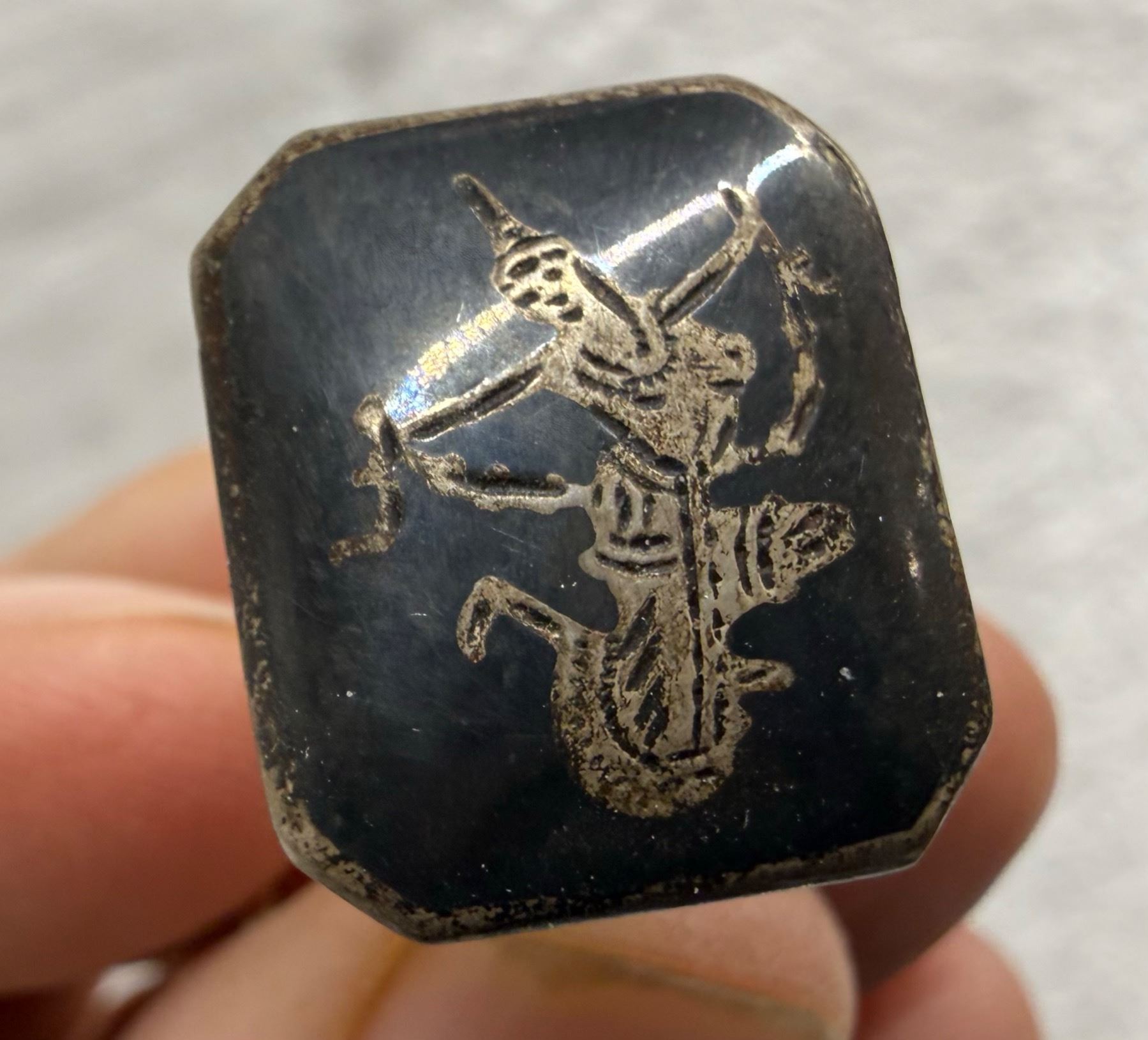RINGS ARE ART DECO-STYLE WEDDING BANDS MARKED WITH "STERLING" FOLLOWED BY THE A MAKER'S MARK; THE EXTERIOR FEATURES AN ENGRAVED GEOMETRIC PATTERN OF FOUR-POINTED STARS OR STYLIZED CROSSES /// VINTAGE SIAMESE NIELLOWARE STERLING SILVER CUFF LINK FEATURING AN ETCHED CHARACTER FROM THE THAI EPIC, THE RAMAKIEN