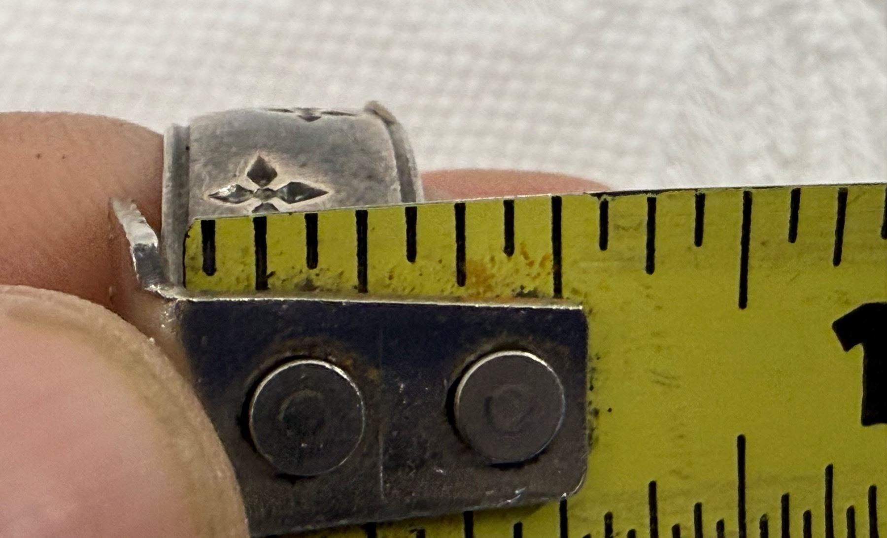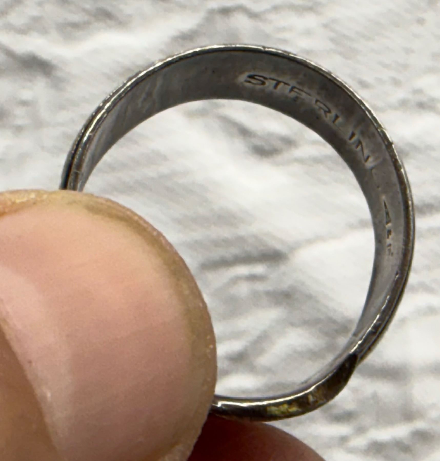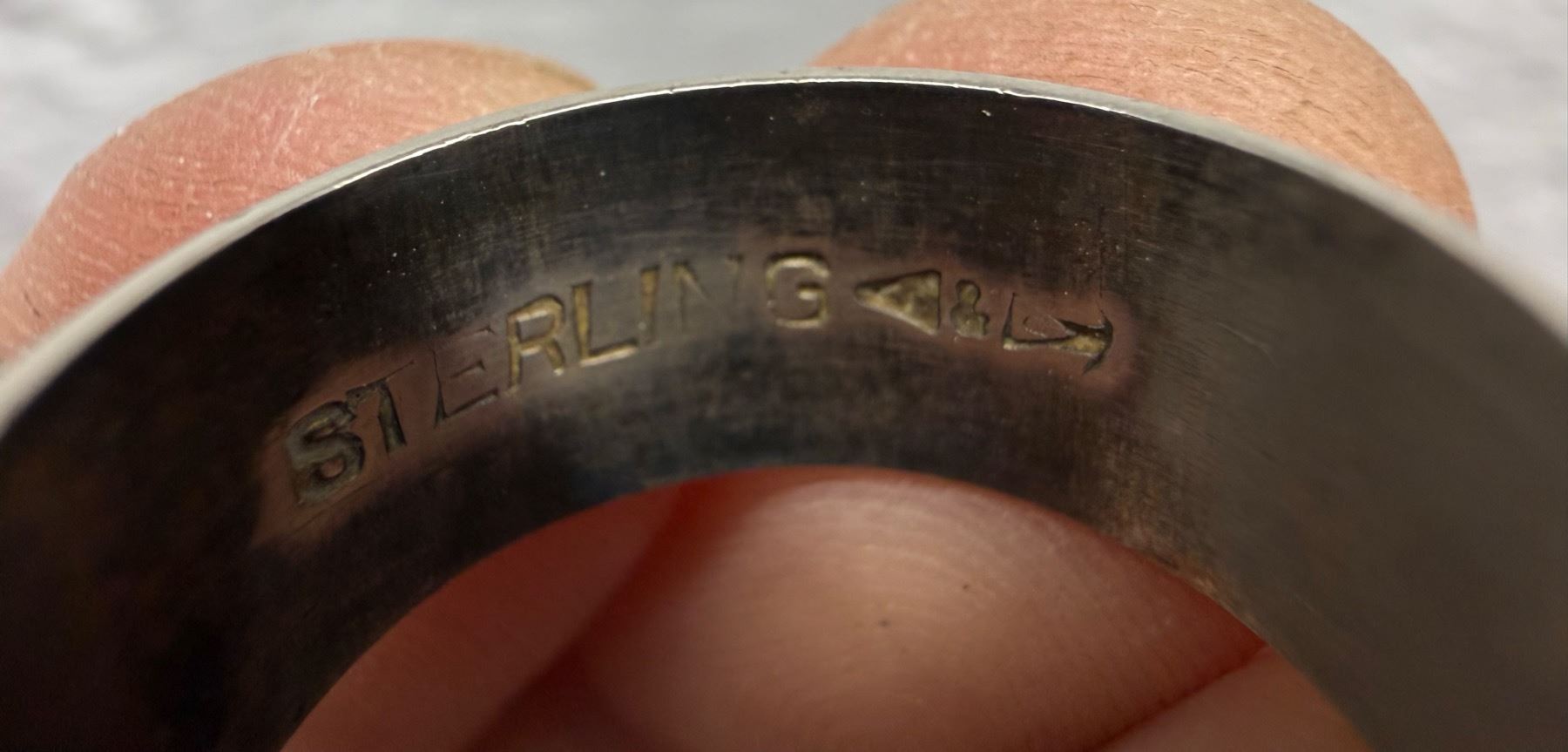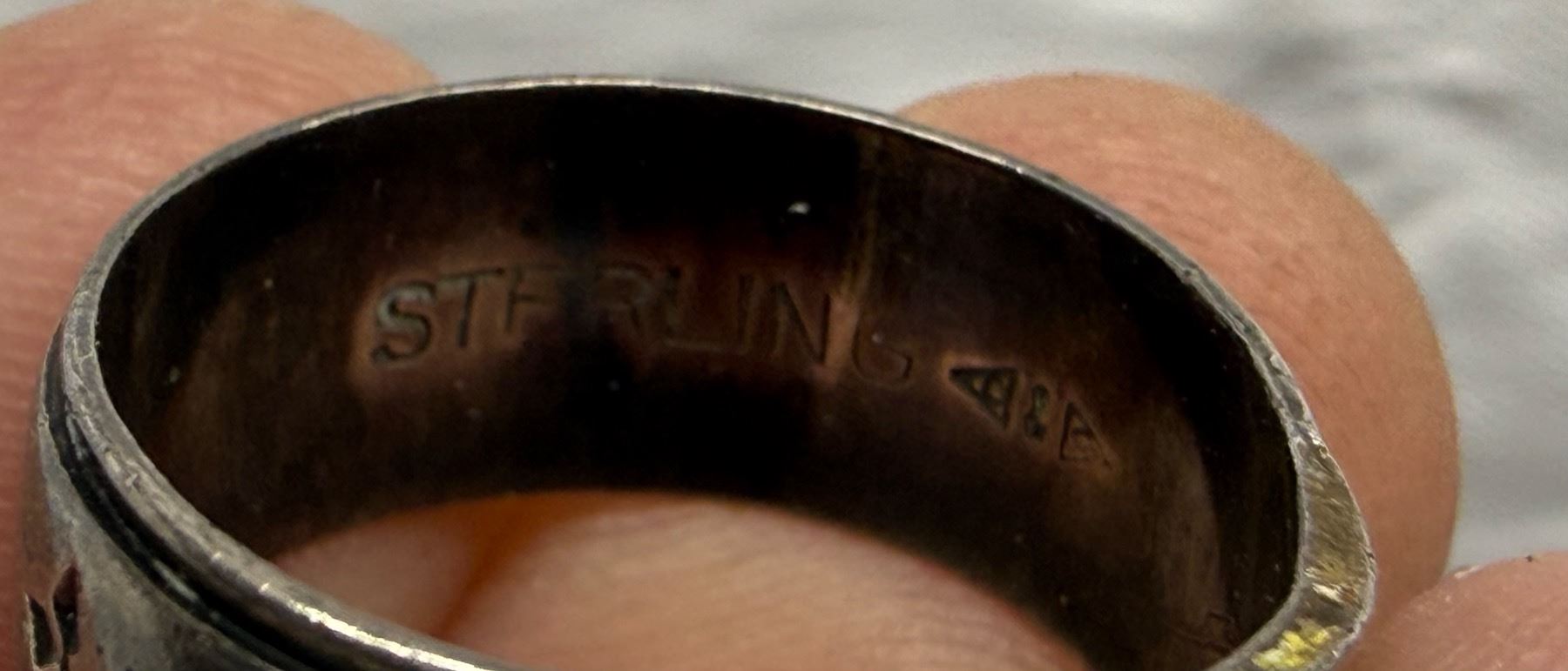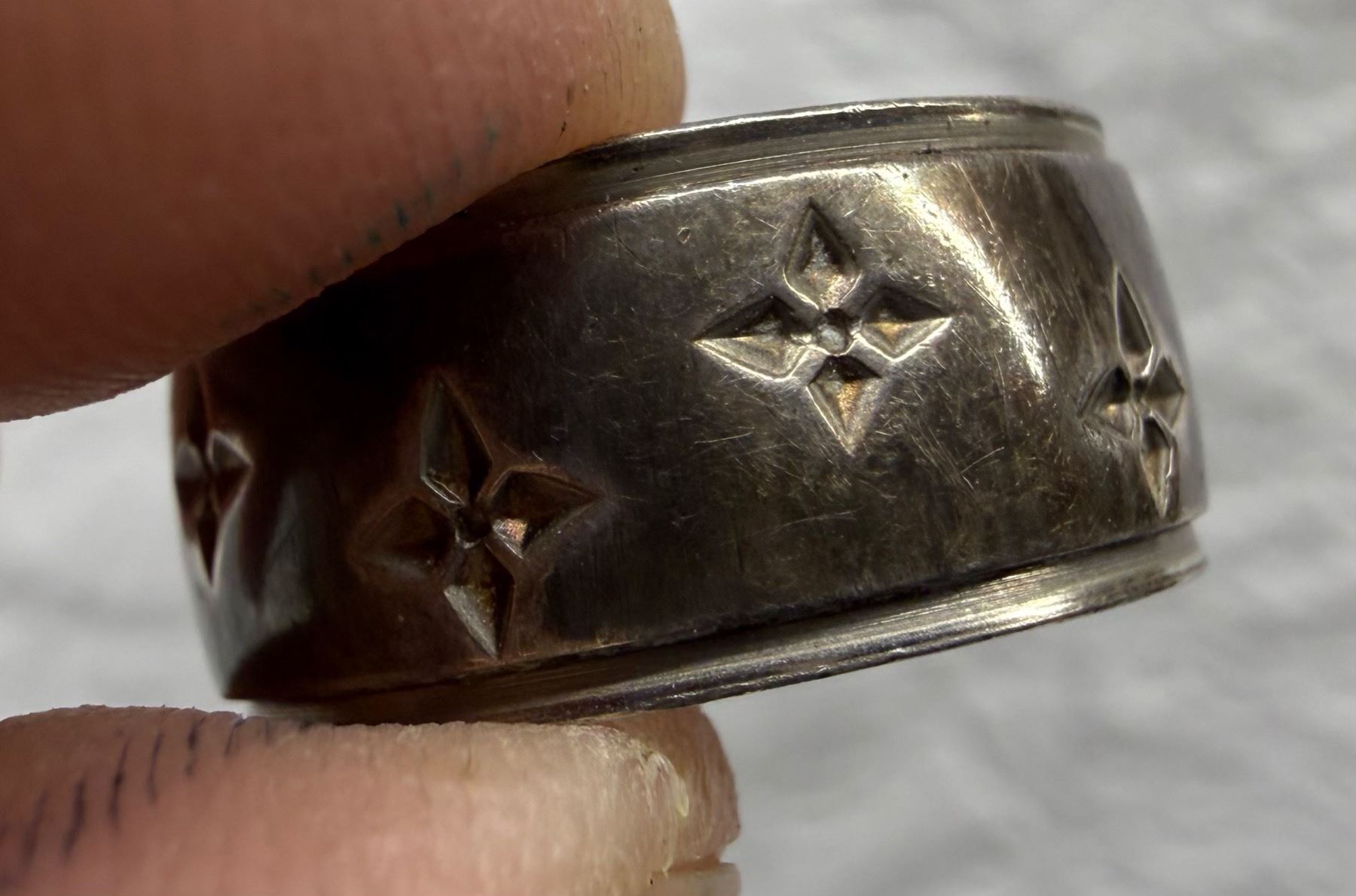 RINGS ARE ART DECO-STYLE WEDDING BANDS MARKED WITH "STERLING" FOLLOWED BY THE A MAKER'S MARK; THE EXTERIOR FEATURES AN ENGRAVED GEOMETRIC PATTERN OF FOUR-POINTED STARS OR STYLIZED CROSSES /// VINTAGE SIAMESE NIELLOWARE STERLING SILVER CUFF LINK FEATURING AN ETCHED CHARACTER FROM THE THAI EPIC, THE RAMAKIEN