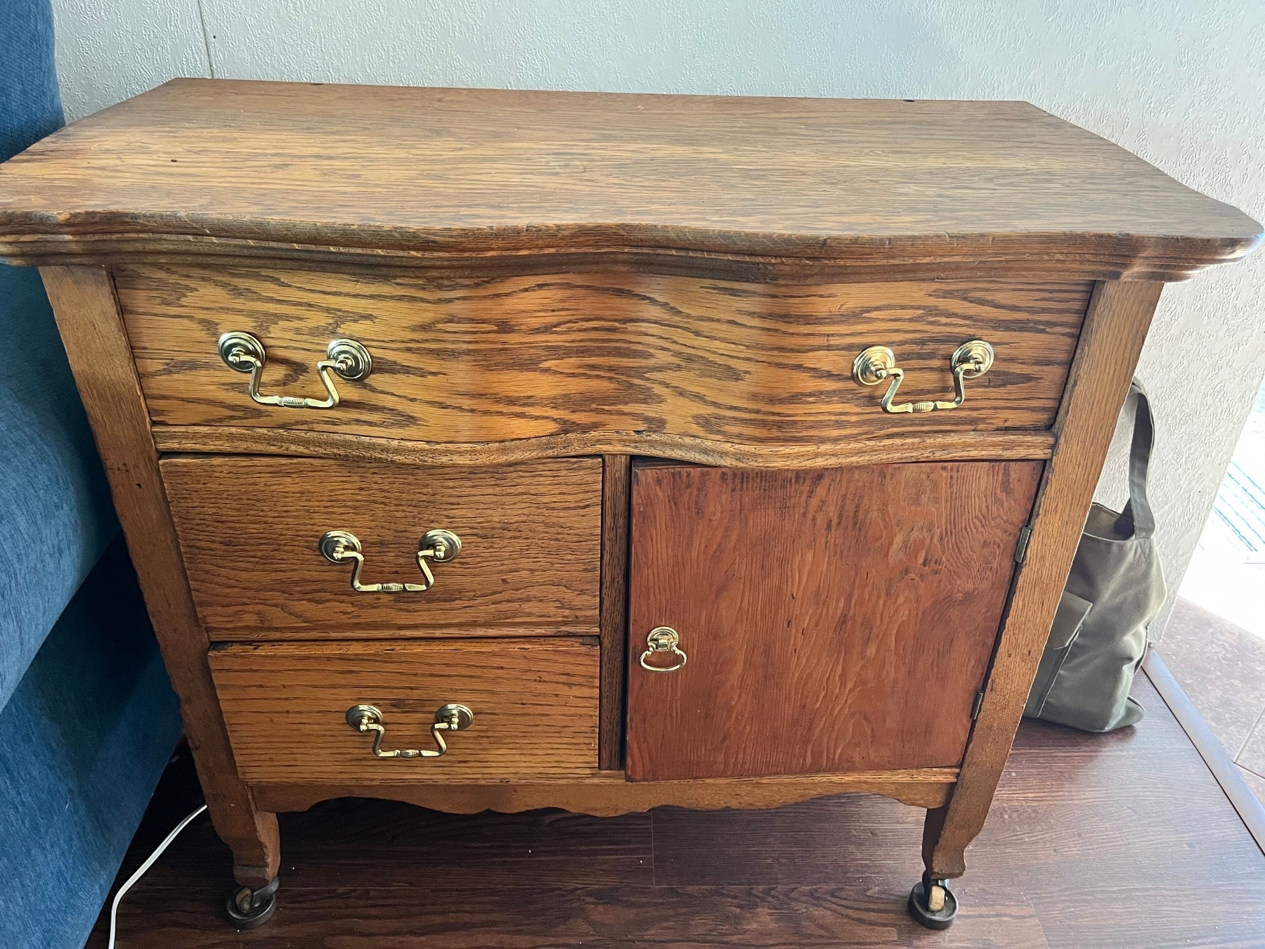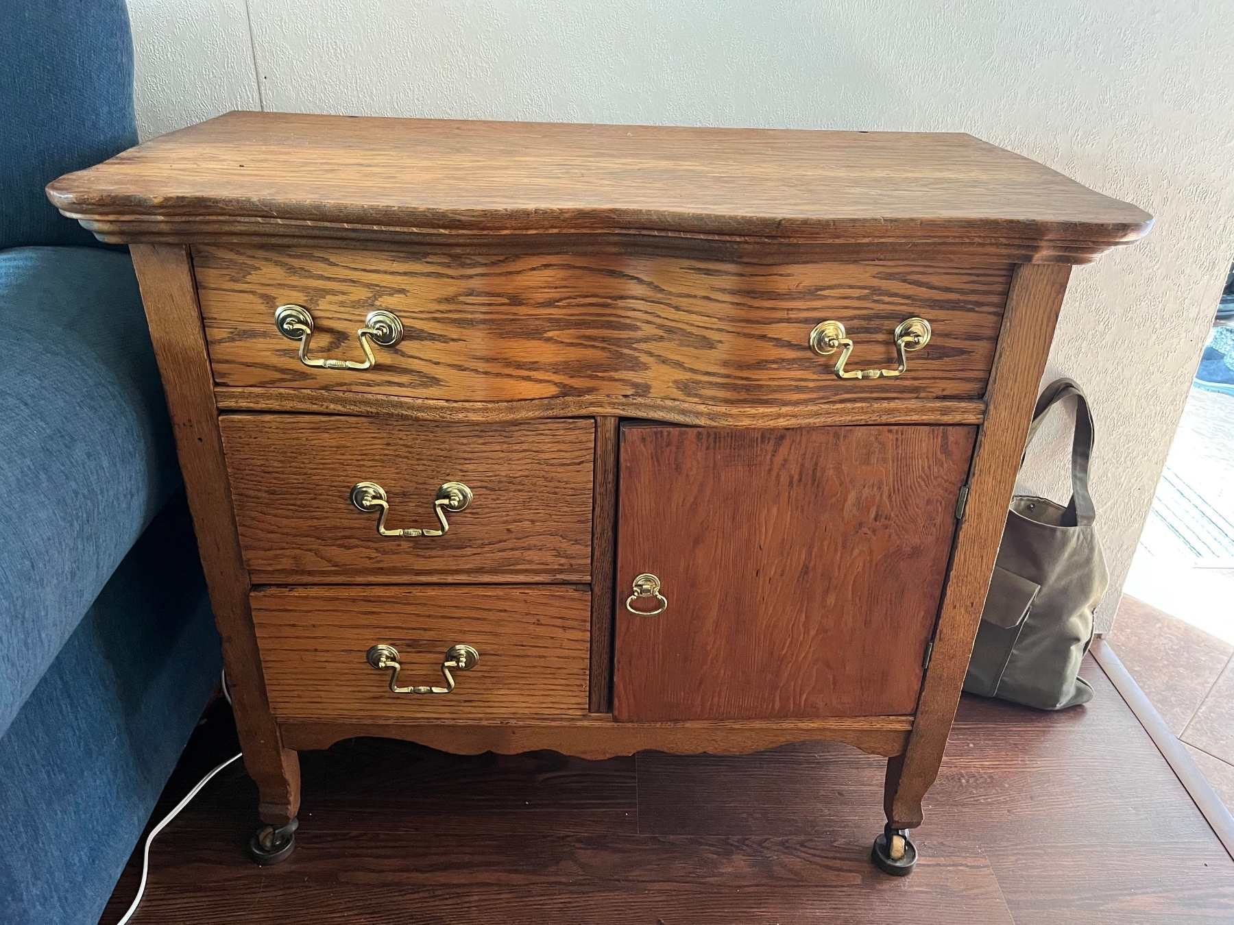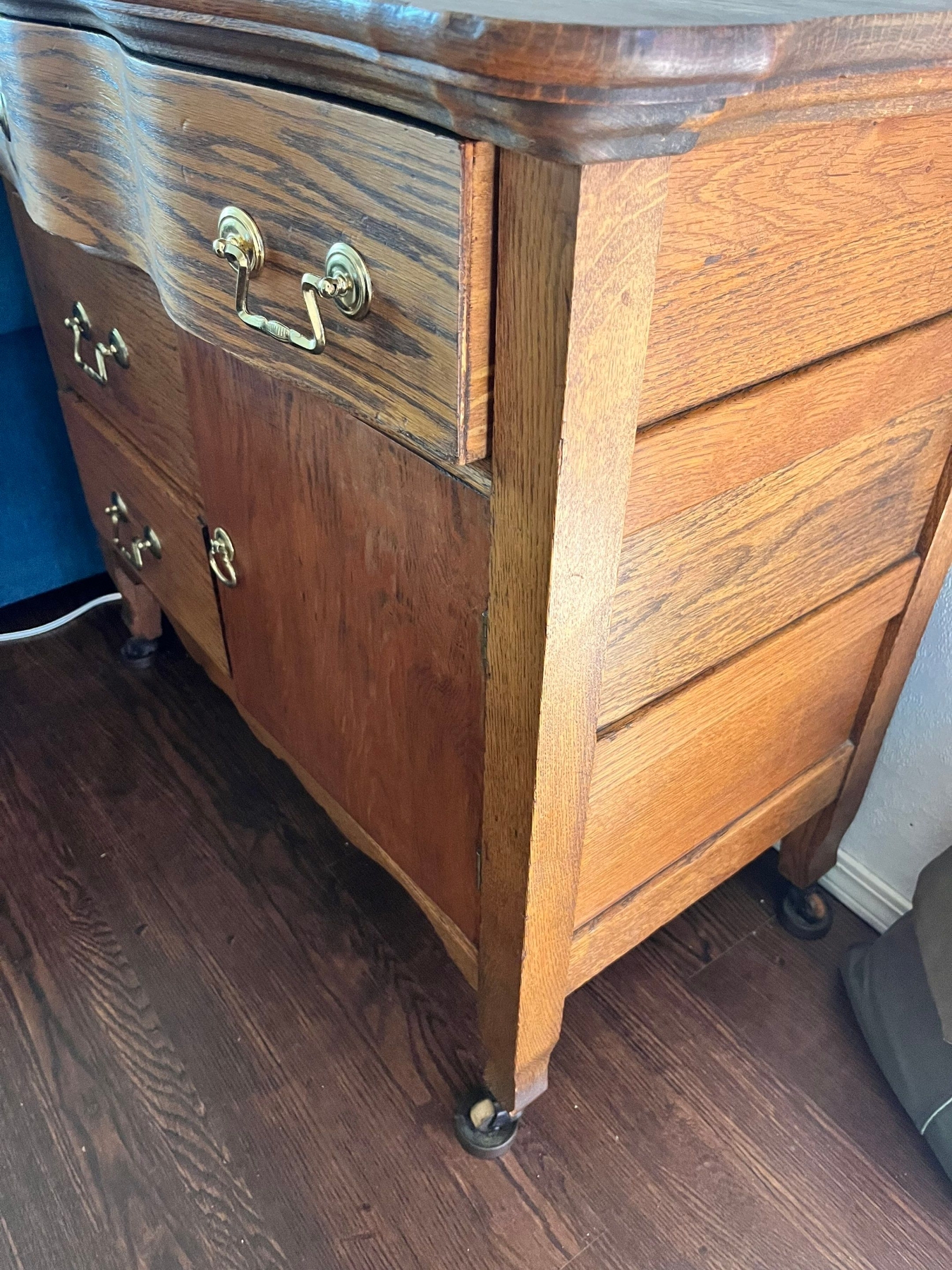 Antique Oak Dresser with 3 Drawers and Cabinet, Ornate Brass Pulls from the late 19th to early 20th century (circa 1890–1920).
