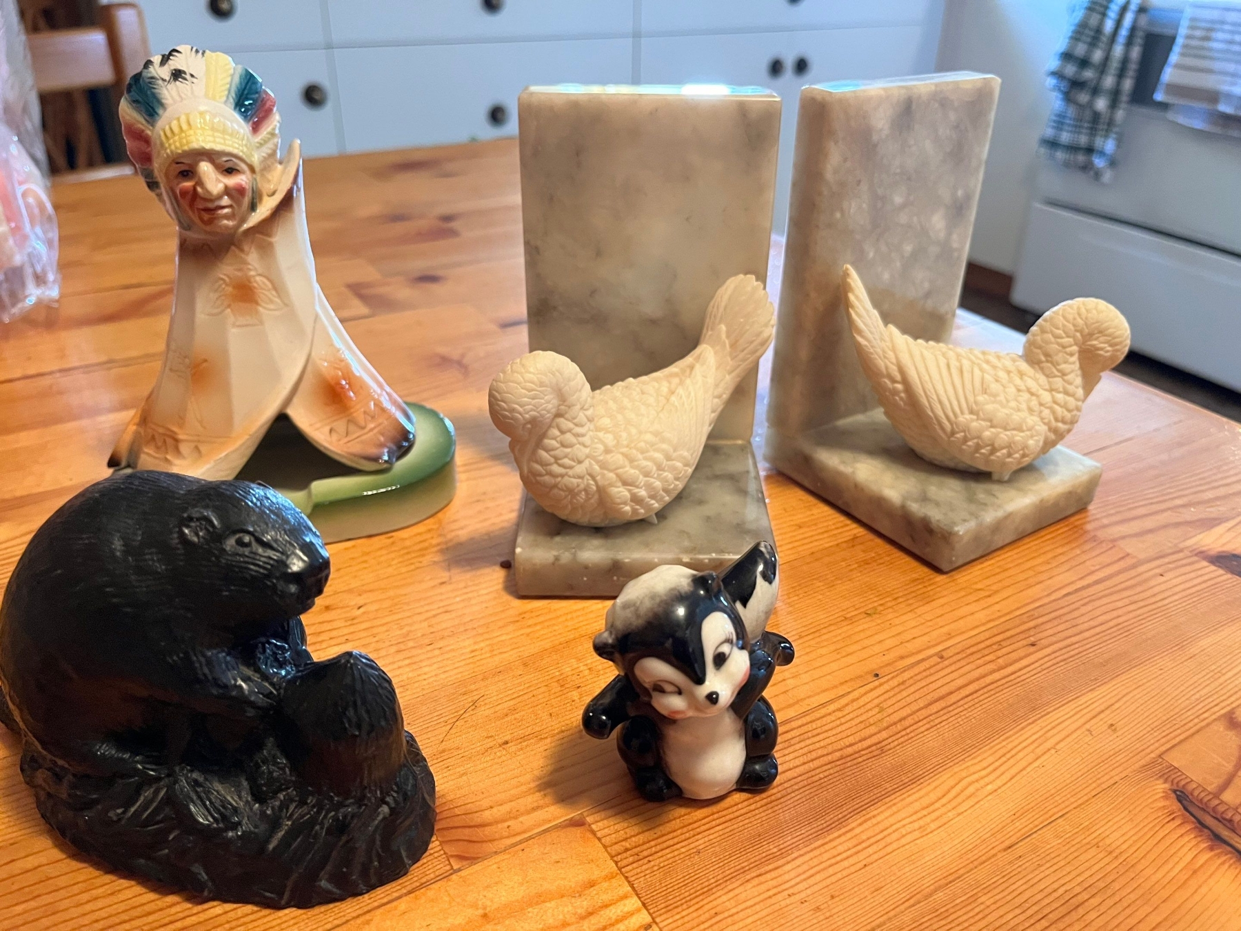 Vintage Alabaster marble Dove Bookends, ceramic teepee ashtray, a wolf original hand made sculpture of a beaver, and ceramic squirrel.