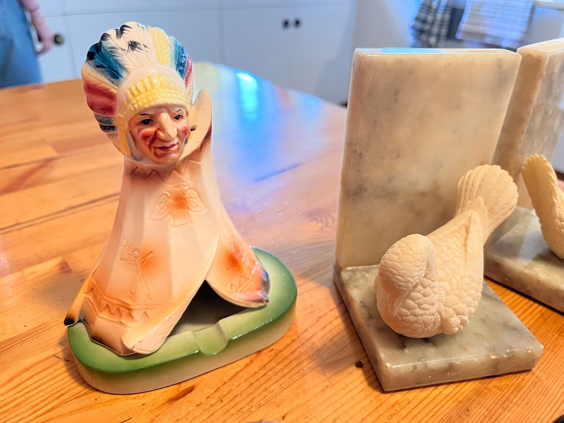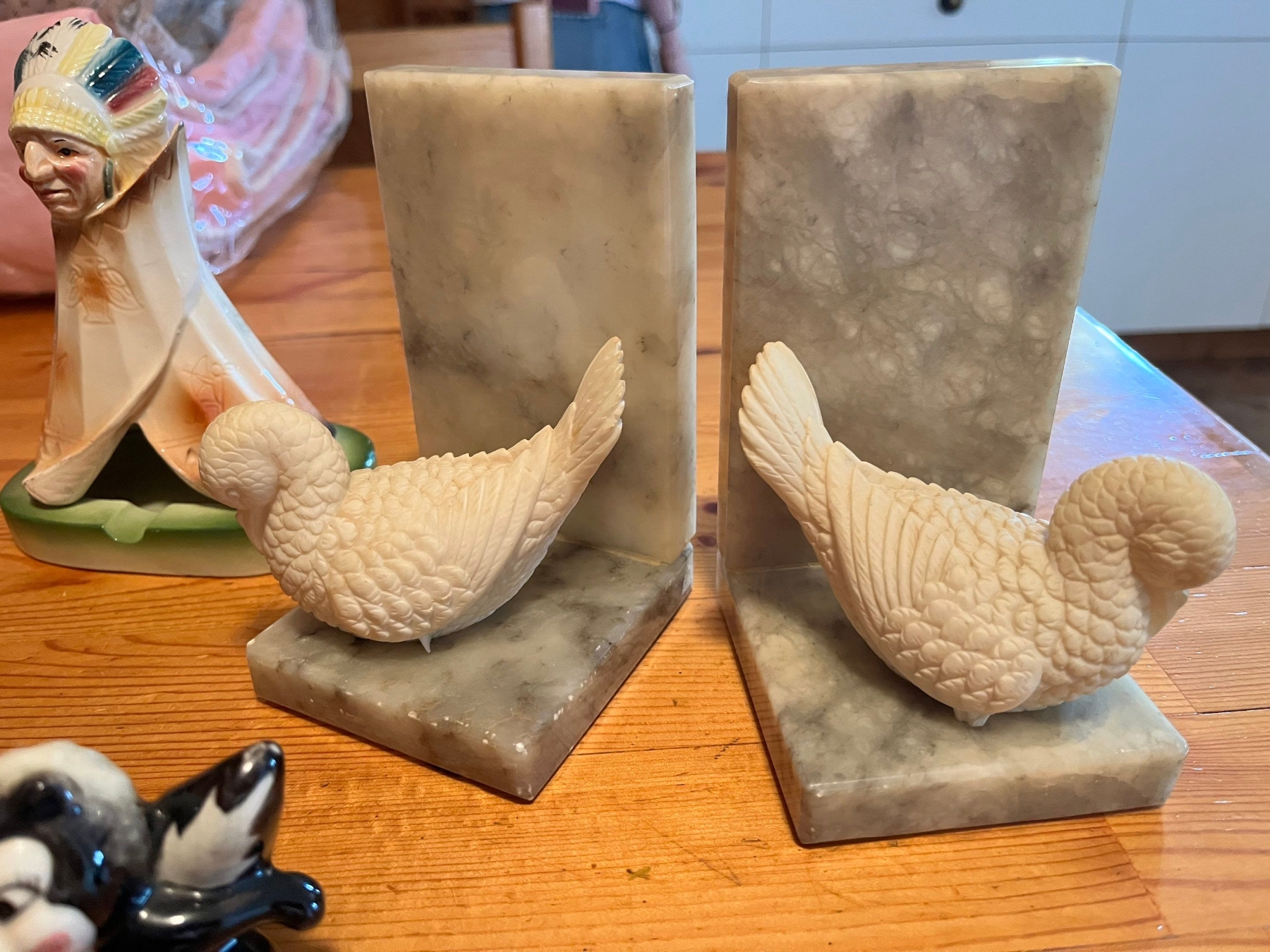 Lot 51 Vintage Alabaster marble Dove Bookends, ceramic teepee ashtray, a wolf original hand made sculpture