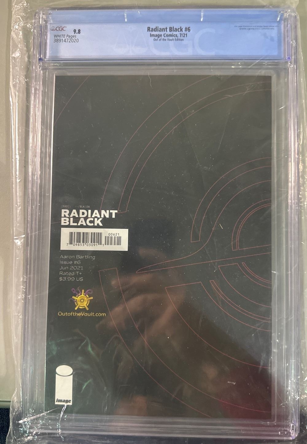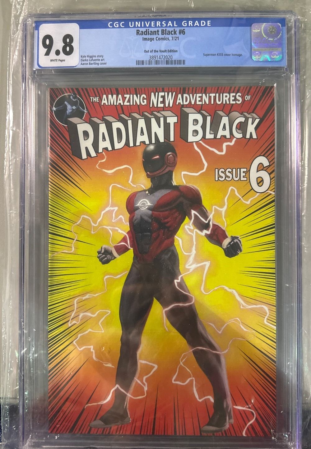 Graded 9.8 by CGC. Radiant Black #6, the "Out of the Vault" exclusive edition from Image Comics (July 2021). Features a Superman #233 homage cover by artist Aaron Bartling. Story by Kyle Higgins. SKU: IC-20260313-1038-76-J-260313-17
