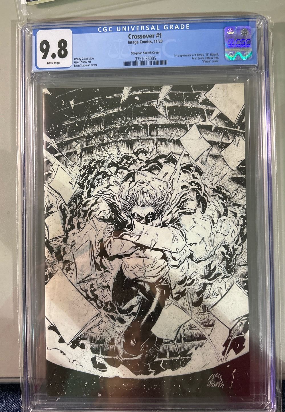 Crossover #1 from Image Comics, published in 11/20. Graded CGC 9.8 with white pages. Features the Ryan Stegman Sketch 'Virgin' Variant Cover. This is the 1st appearance of Ellipses 'El' Howell. [1, 4] SKU: IC-20260313-1038-76-J-260313-18