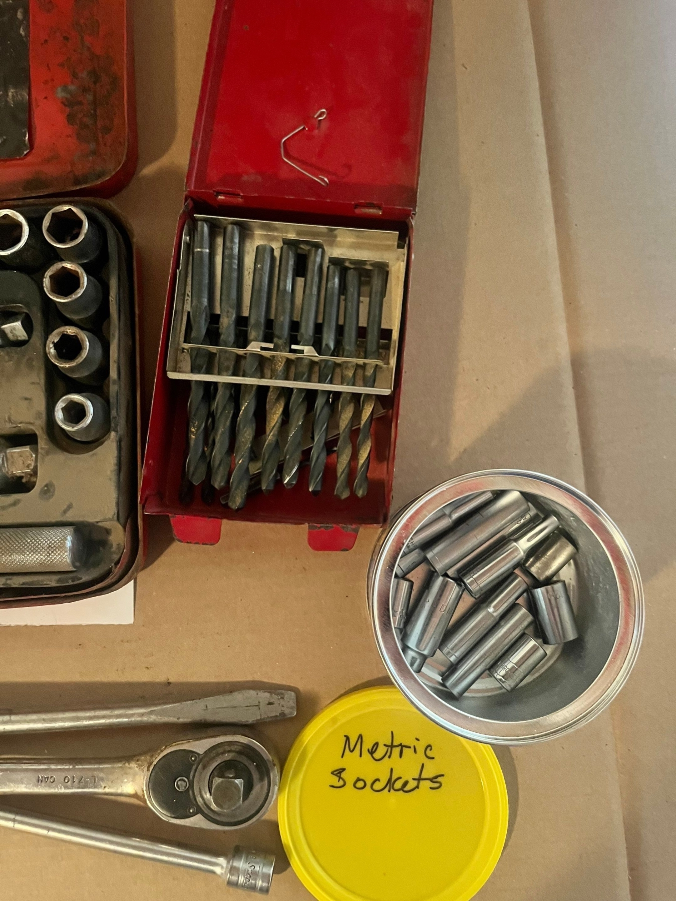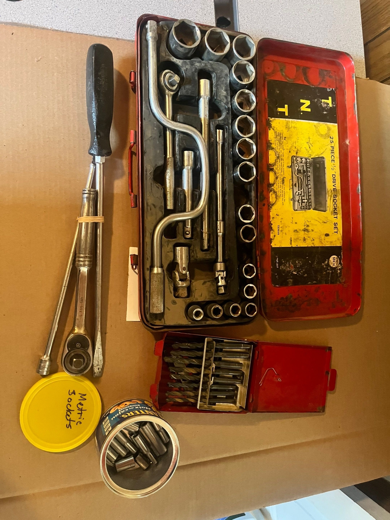 Snap on brand ratchet, TNT 25 piece half inch driver socket set assortment of drill, bits and jar of metric sock.