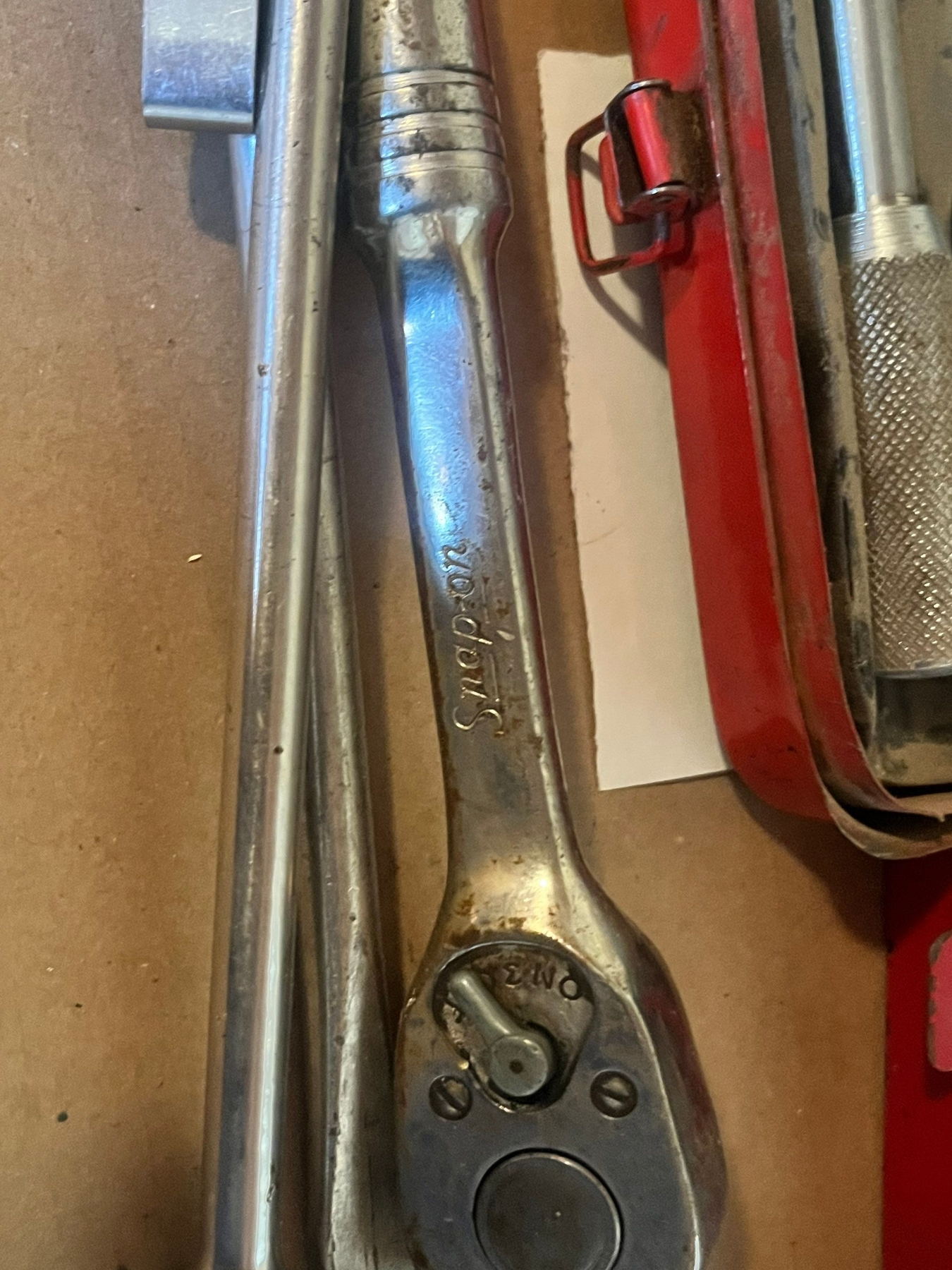 Lot 63 Snap on brand ratchet, TNT 25 piece half inch driver socket set assortment of drill, bits and jar o