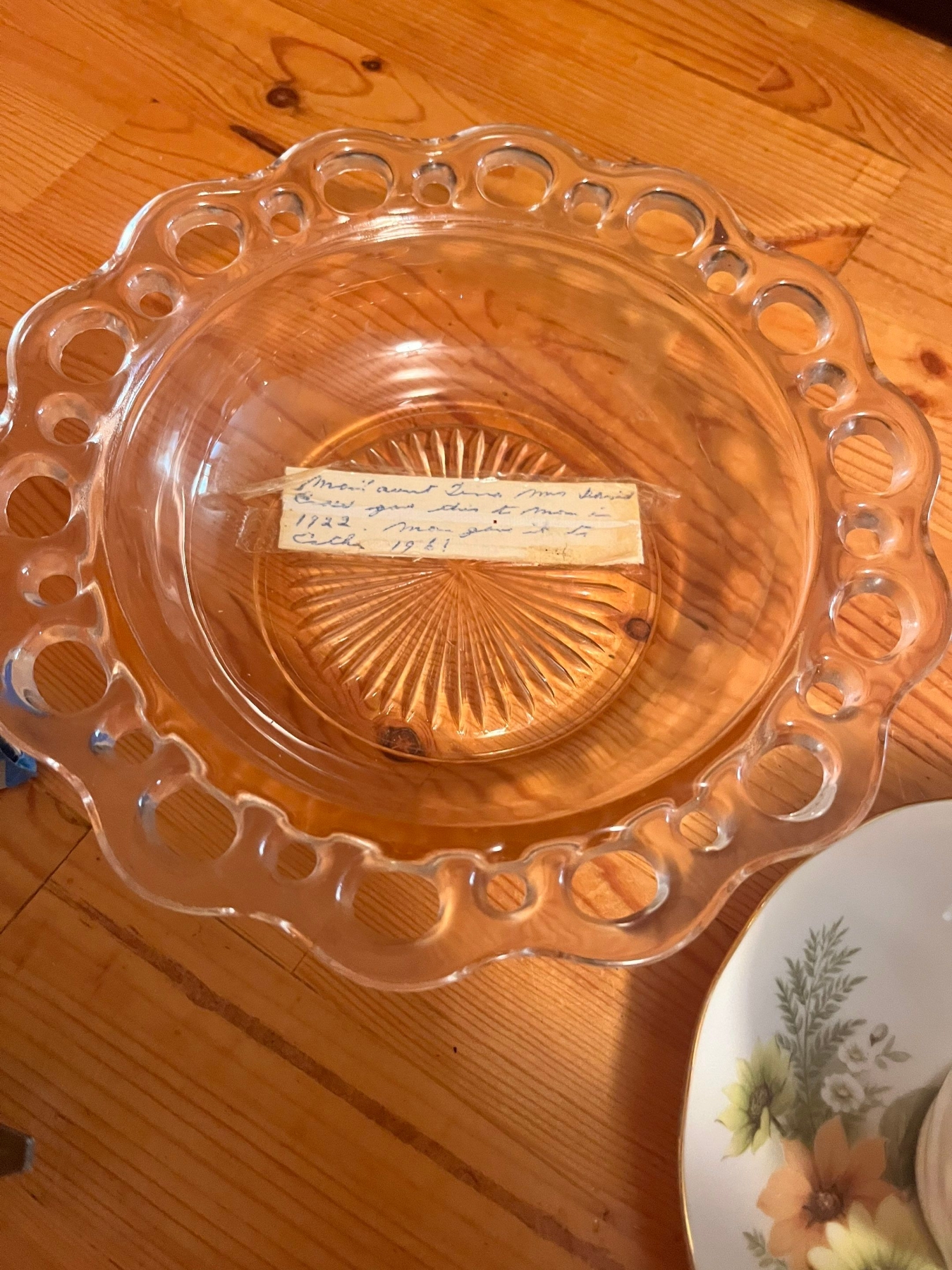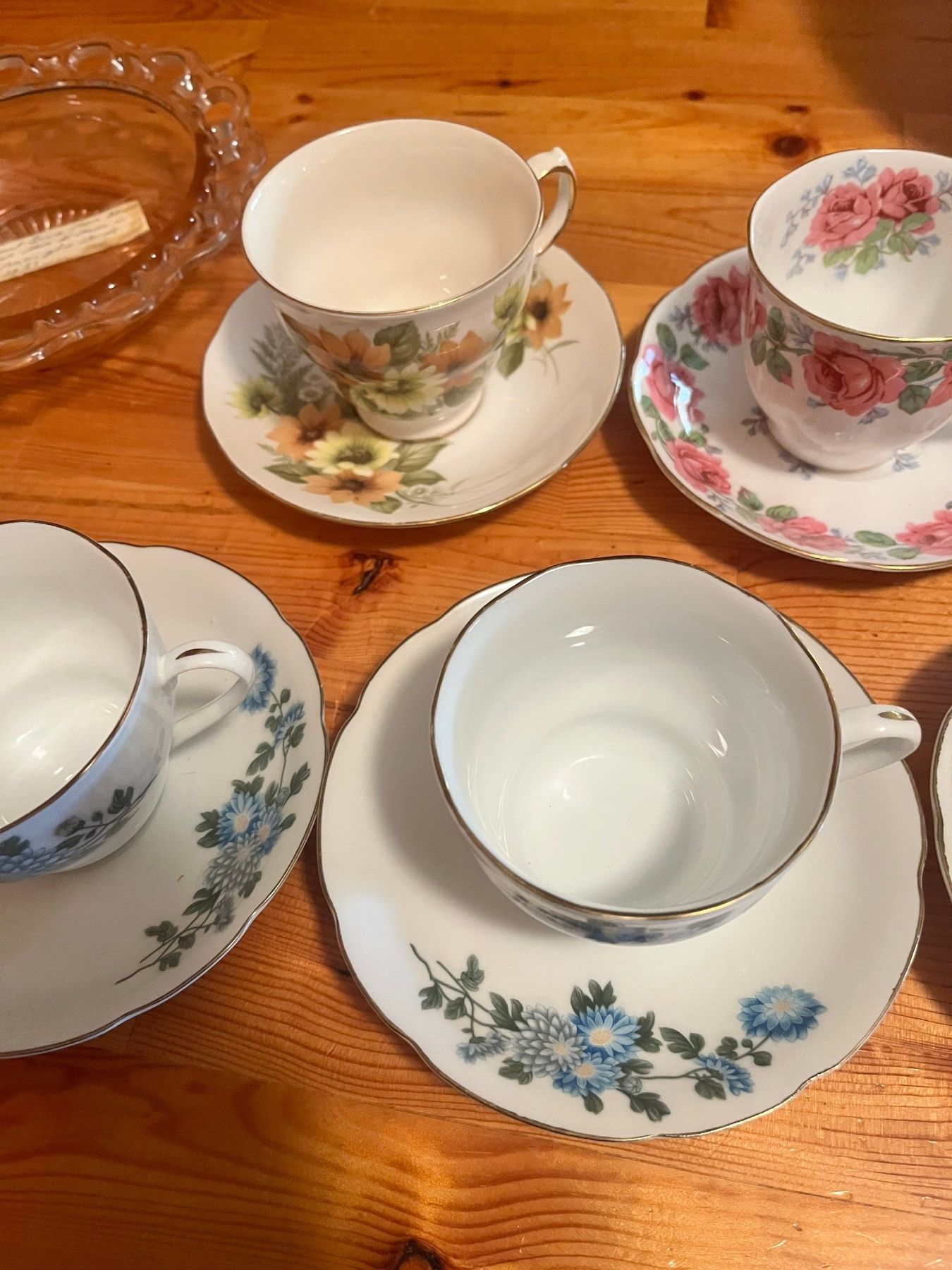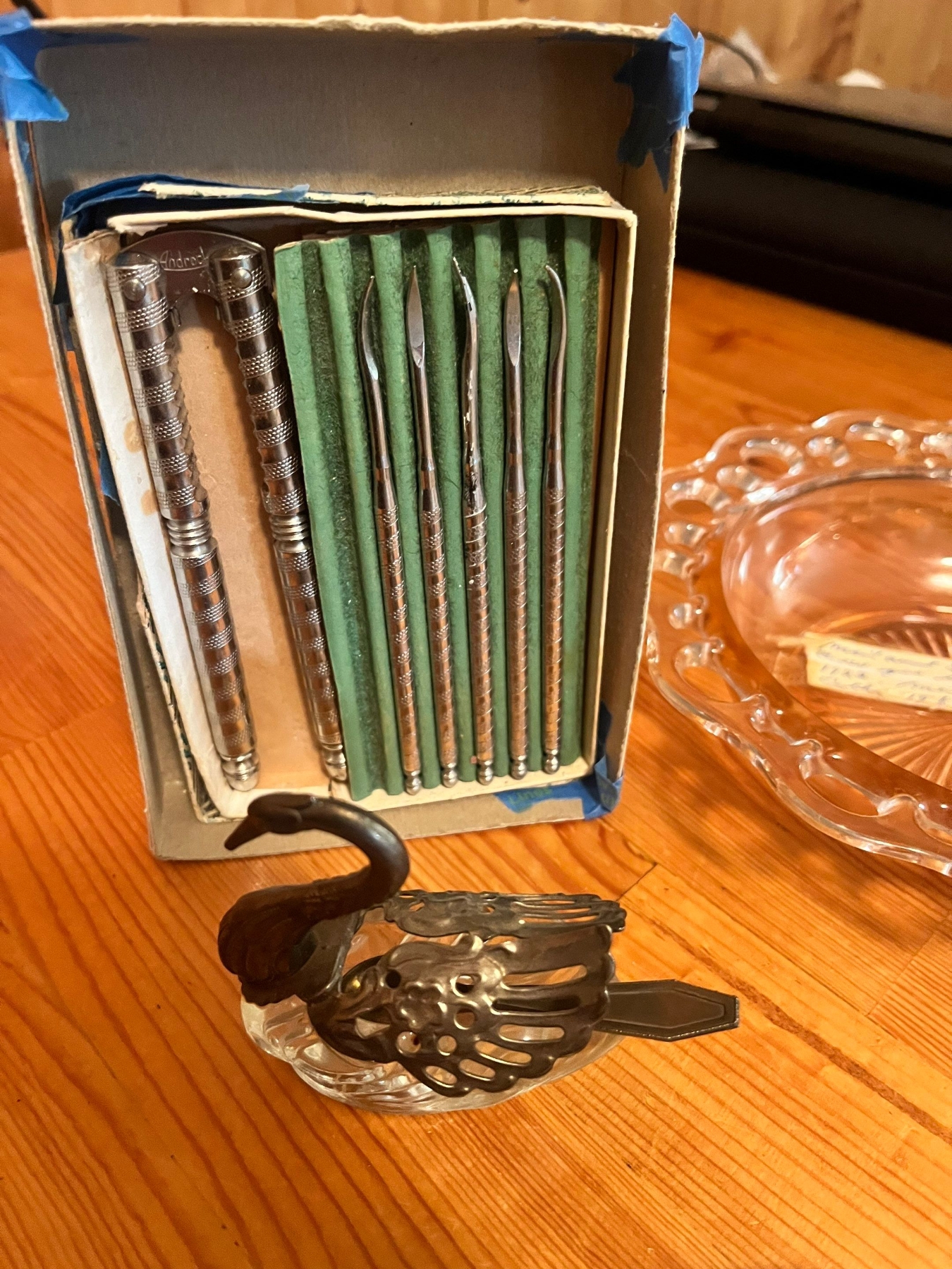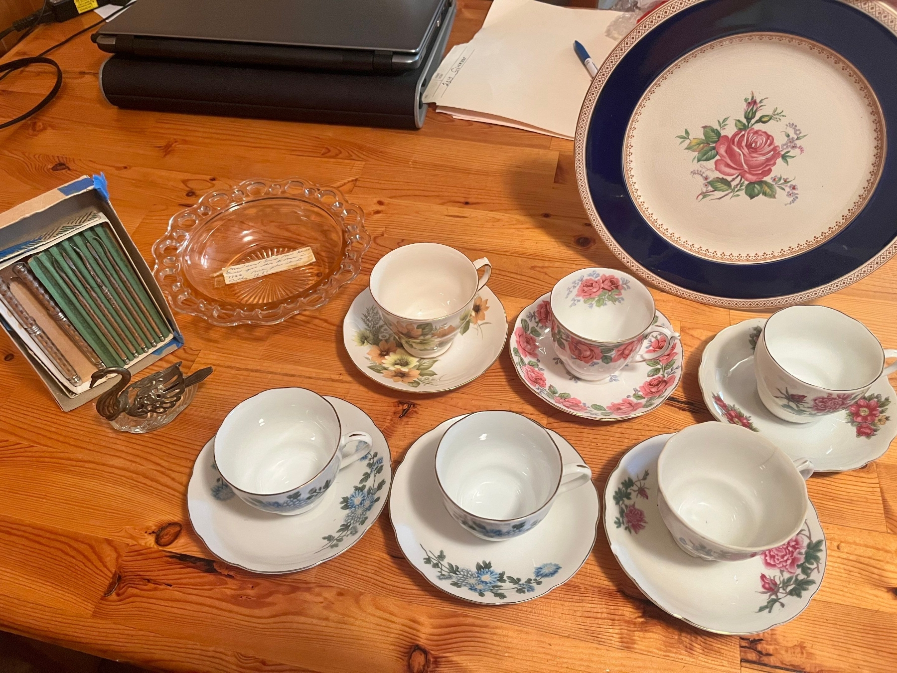 6 fine bone china teacups and saucers, vintage Godinger Silverplated and Crystal Swan Salt Cellar with spoon, specifically model #1704, manufactured in Italy, image is a vintage Anchor Hocking "Old Colony" Pink Depression Glass serving bowl, and vintage nutcracker and pick set.