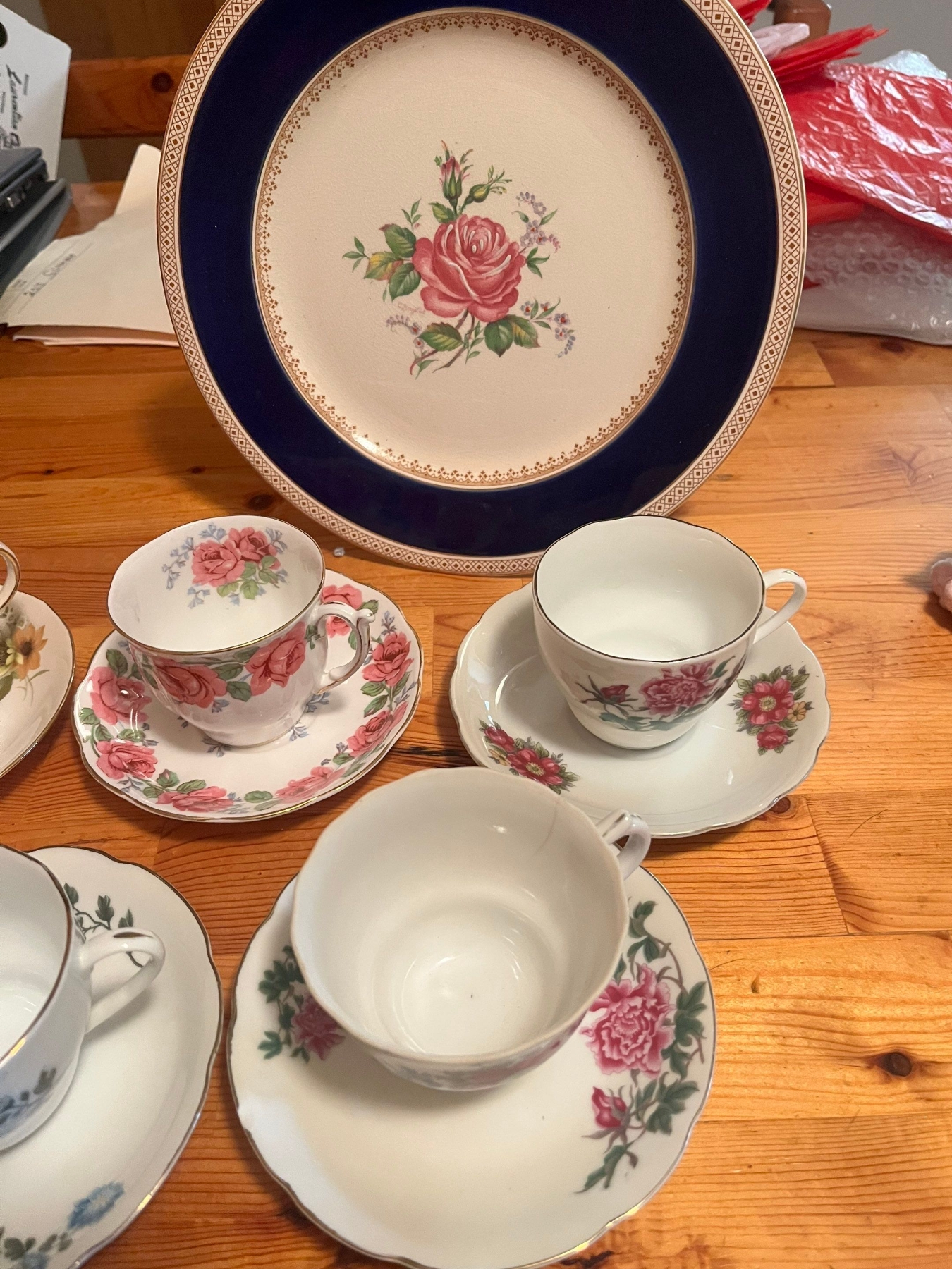 Lot 72 6 fine bone china teacups and saucers, vintage Godinger Silverplated and Crystal Swan Salt Cellar wi