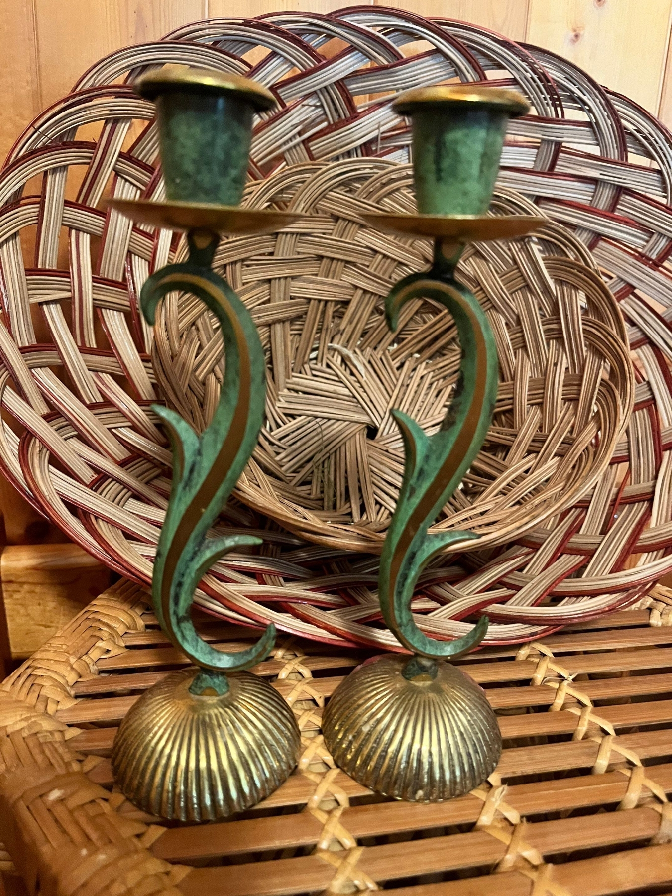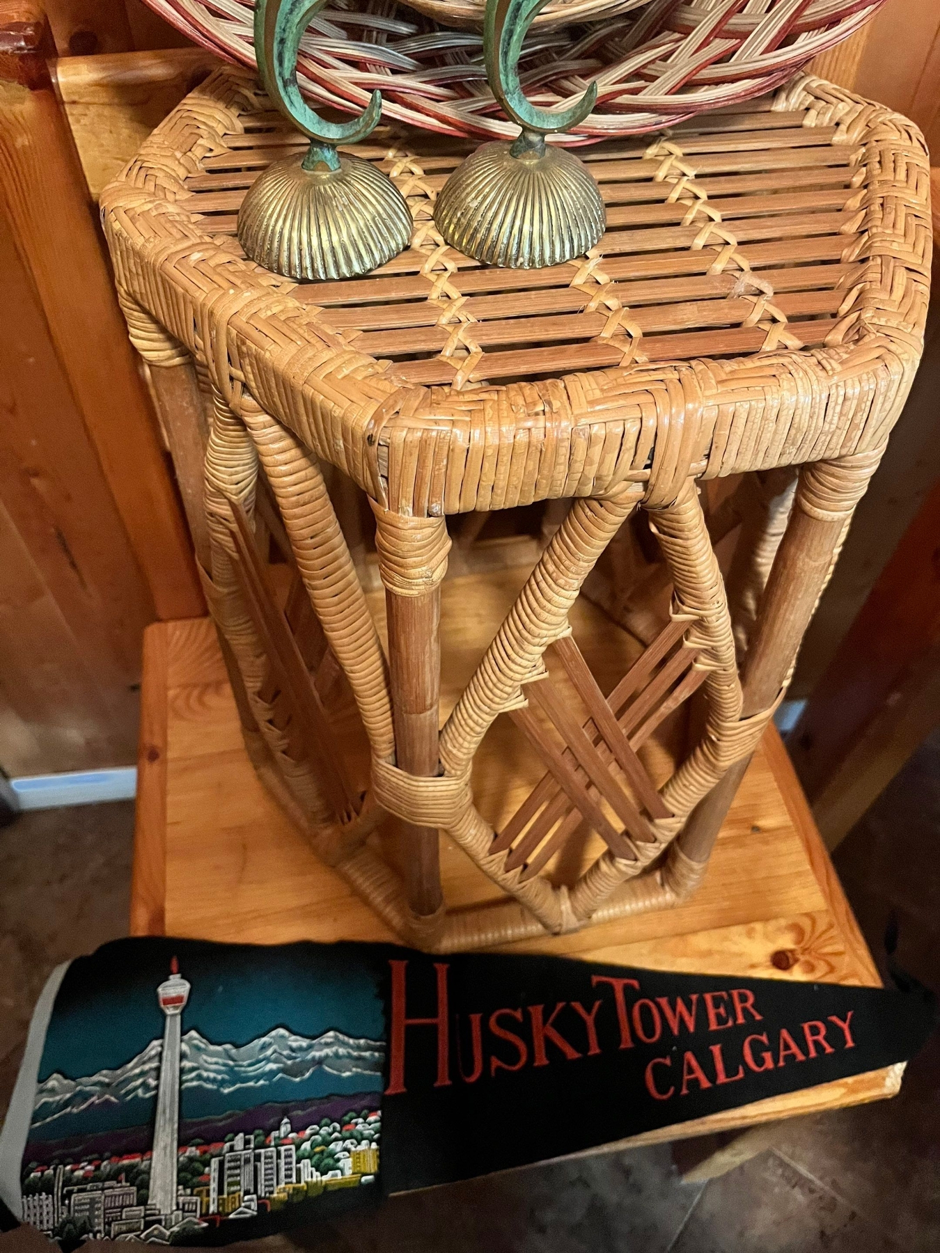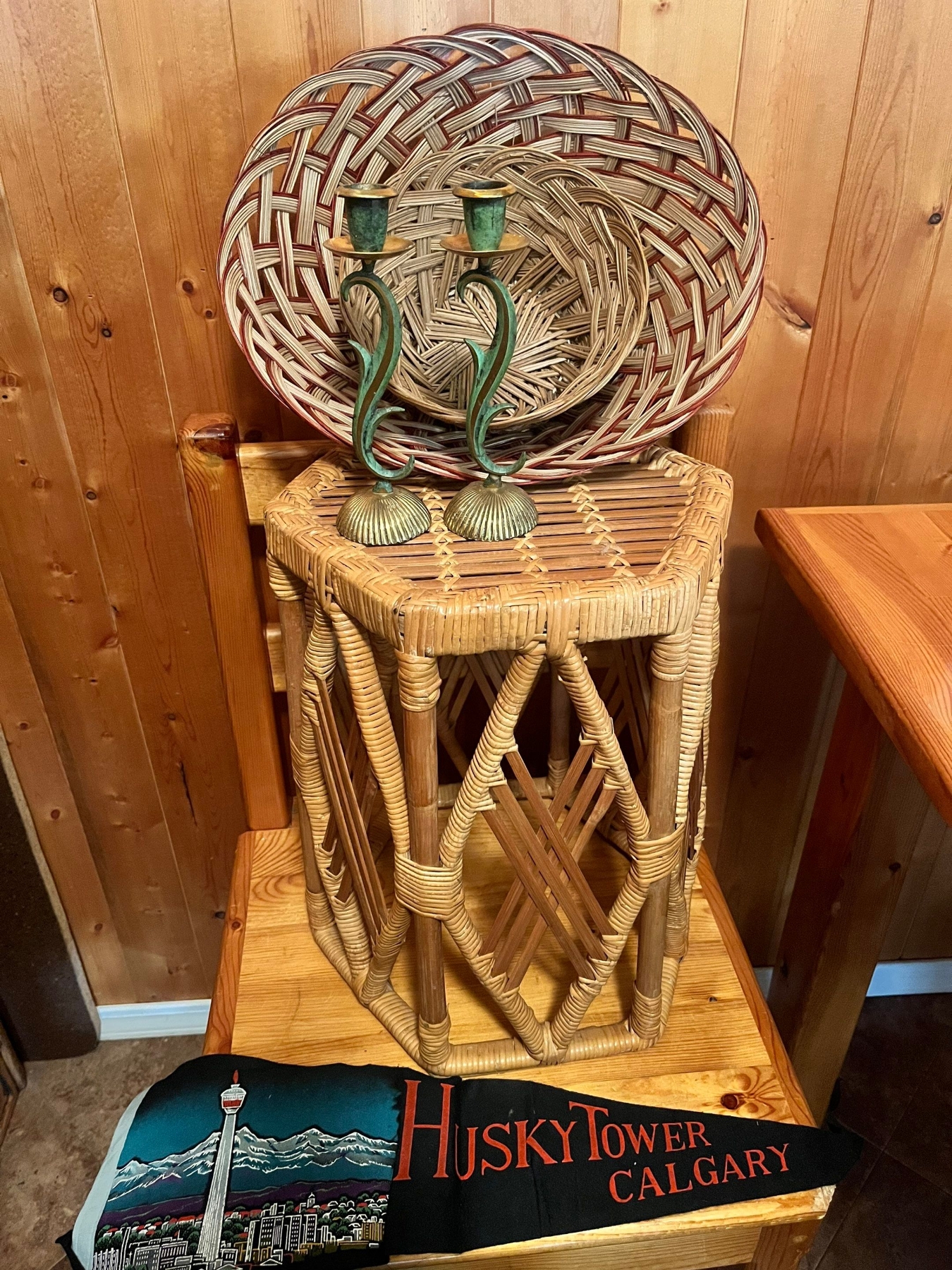 Wicker stool or plant stand, 2x wicker bowls, a felt flag ( husky tower Calgary) and Antique Art Nouveau-style bronze candle holders produced in Israel.