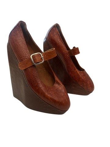 Brüno (2009) --A pair of brown python textured, custom made, Andre #1, 9" platform wedge Mary Jane style shoes with a buckle across the center. Custom made for the production. May have been worn by a background character in the film. Large enough to fit a man's foot. Measures 12" long across the top. A rare find from this memorable film production!