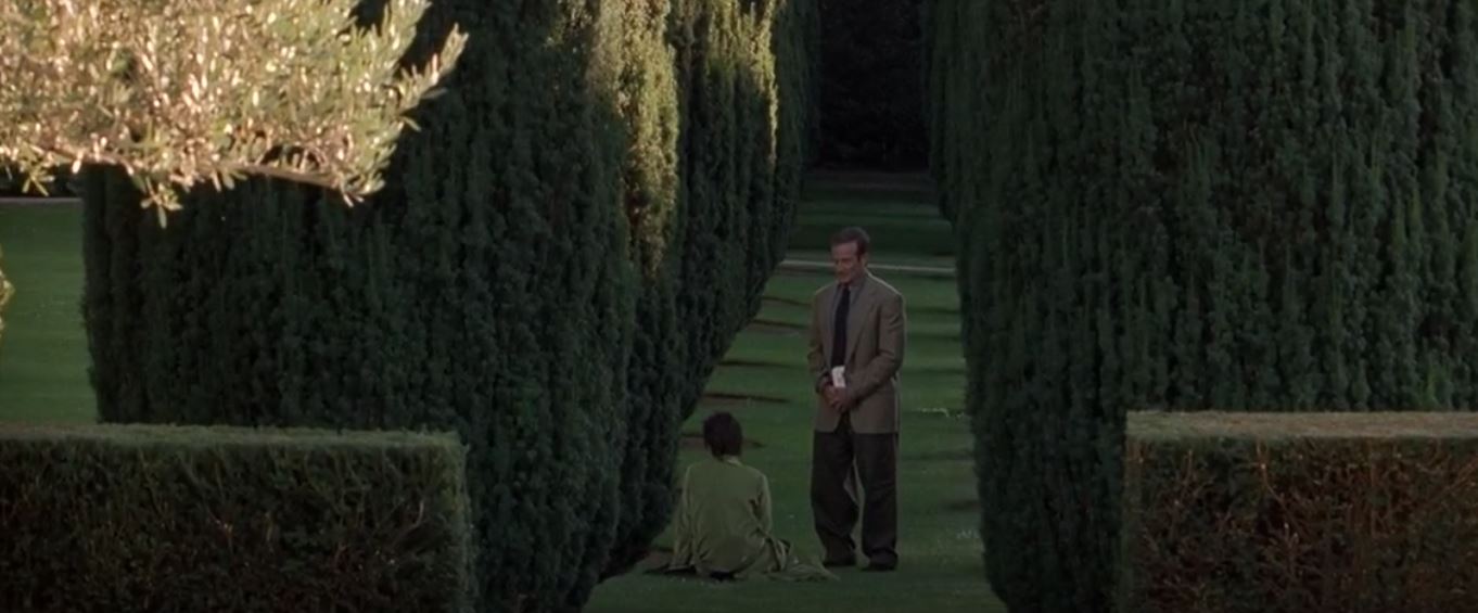 What Dreams May Come (1998) - Chris (Robin Williams) screen worn, Joseph Abboud (16 1/2 34/35) brown tweed style dress shirt with brown knit Regent Street cable car clothiers Robert Kirk, LTD. necktie. In this scene he is in the green grassy area that represents a part of the afterlife that is peaceful and idyllic, mirroring Chris' memories of happy times with his wife.