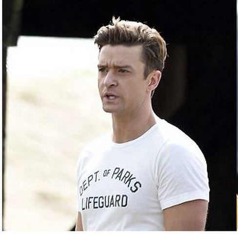 Mickey (Justin Timberlake) screen worn, hero, cream colored, " Dept of Parks Lifeguard" short sleeve t-shirt with green font.Wardrobe tag included.