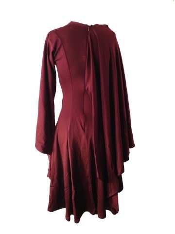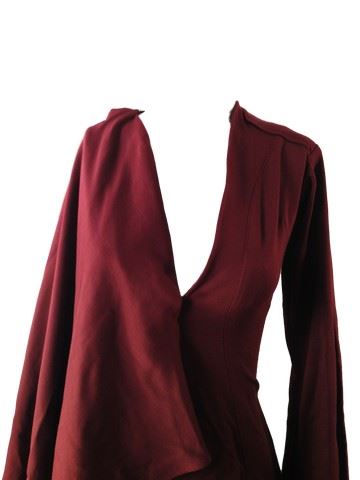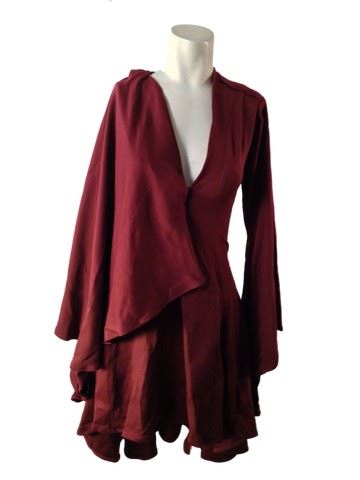 Project Runway All Stars, Season 6, Episode 1: "Rookies vs. Veterans" - Garment # 613 - Designer: Char (Rookie). Char designed a maroon thigh- length, flowy, long sleeve dress with a v- neck front. The fabric drapes over the right arm to appear drape-like.