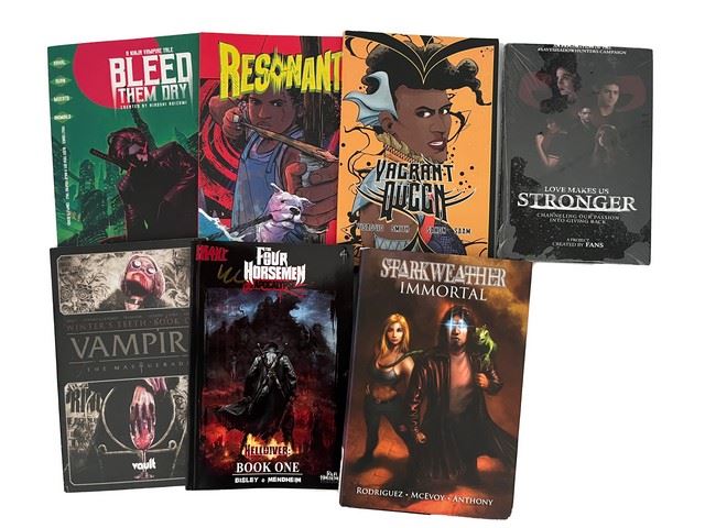 Lot of 7 comics from various authors and titles. Includes "Four Horseman of the Apocalypse HellDiver", "Love Makes us Stronger", "Stark Weather Immortal", "Resonant", "Vagrant Queen", "Bleed Them Dry", and "Vampire The Masquerade" from Vault Entertainment, Archaia Entertainment, and Four Horsemen Entertainment. (10"x7"). From Constantine Film's production office archives.