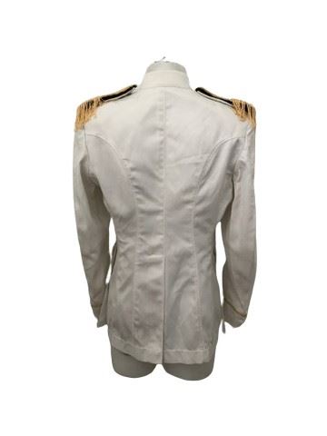 A white uniform jacket that has been customized by an unidentified movie studio wardrobe department to fit a background character. Apaulettes are velcro to be easily removed. Gold trim added to top of pockets and cuffs. Sewn in collar. Jacket length is 32 inches long and 15 inches from pit to pit.