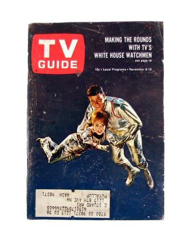 TV Guide Lost In Space November 1965 - Although the TV Sci-Fi classic "Lost In Space" (1965-1968) only lasted for 84 episodes it has been stuck in our collective consciousness ever since. How could anyone forget Guy Williams, June Lockhart, Billy Mumy, Marta Kristen, Angela Cartwright, and of course Jonathan Harris as Dr. Smith. It was the type of series that Sci-Fi master Irwin Allen (soon to be the King of Disaster Features) was born to produce. This is an extremely rare actual TV Guide from November 6-12 1965 with the instant hit "Lost In Space" with Professor Robinson (Guy Williams), and Maureen Robinson (June Lockhart) flying through space on the cover. It includes the original Post Office mailing address label.