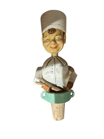 A vintage hand carved, hand painted mechanical wooden bottle stopper made in Italy by the company Anri, featuring a chef figurine stirring a bowl. There is a lever on the back, when pulled down, causes the chef's hand with the spoon to move towards his mouth. The figure is made of hand carved wood, and the stopper is made of cork. Anri bottle stoppers are often dated to the 1940s-1960s. Designed to fit a standard wine bottle.