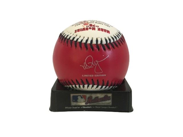 Ball features red and white panels with black stitching, a printed silver signature, a photograph of Mark McGwire with the words “Marking History 70” framing the picture, and “Mark McGwire ‘70’ ‘After hitting home run #62 on September 8th, and breaking RogerMaris’ 37-year-old home run record, Mark McGwire went on to set a new single season record, hitting #69 and #70 at Busch Stadium on September 27th, 1998.” Behind the text is a photo of McGwire at bat.