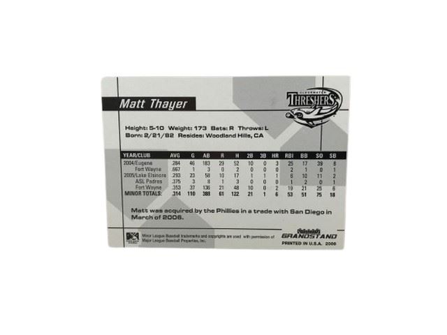 Matt Thayer hand signed baseball card. Face of card is autographed in silver marker and reverse features minor-league baseball stats.