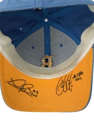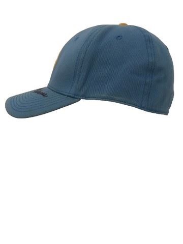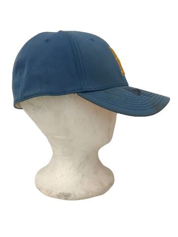 UCLA coaches signed blue UCLA Bruins baseball cap with gold embroidered lettering. Elastic; one size fits most. Gold underside of brim.
