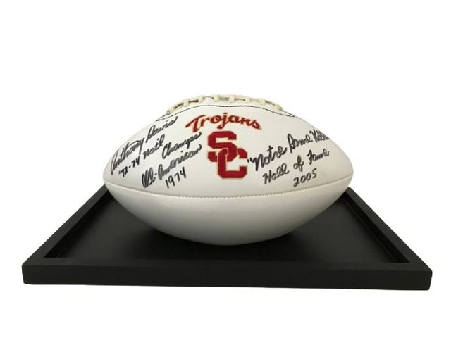 USC Trojans Baden Sports orange and white leather, autograph edition football (official size and weight) autograph by Anthony Davis 1972 to 1974 national champions All American 1974. Marked : “Notre Dame killer Hall of Fame 2005”. Anthony Davis (born September 8, 1952), also known as "A.D.", is an American former professional football player who was a running back. He played in four professional leagues: the World Football League (WFL), Canadian Football League (CFL), National Football League (NFL), and United States Football League (USFL).