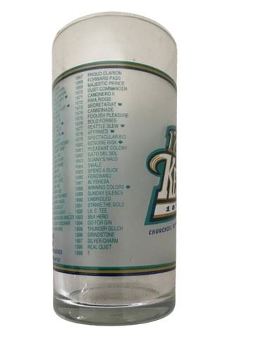 Glass features Kentucky Derby winners from 1875 through 1998 with an open space for the 1999 winner.