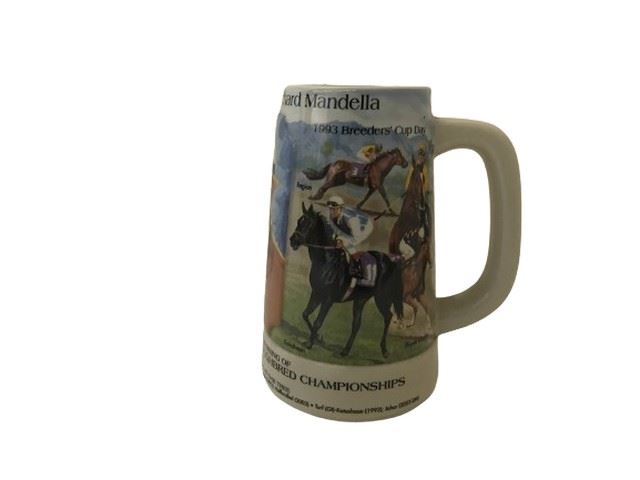 Lot of 12 limited edition Santa Anita Park Stein mugs, commission by Oak Tree Racing Association. Mugs feature colorful artwork honoring horses and jockeys from several races in cups between 1999 and 2008.